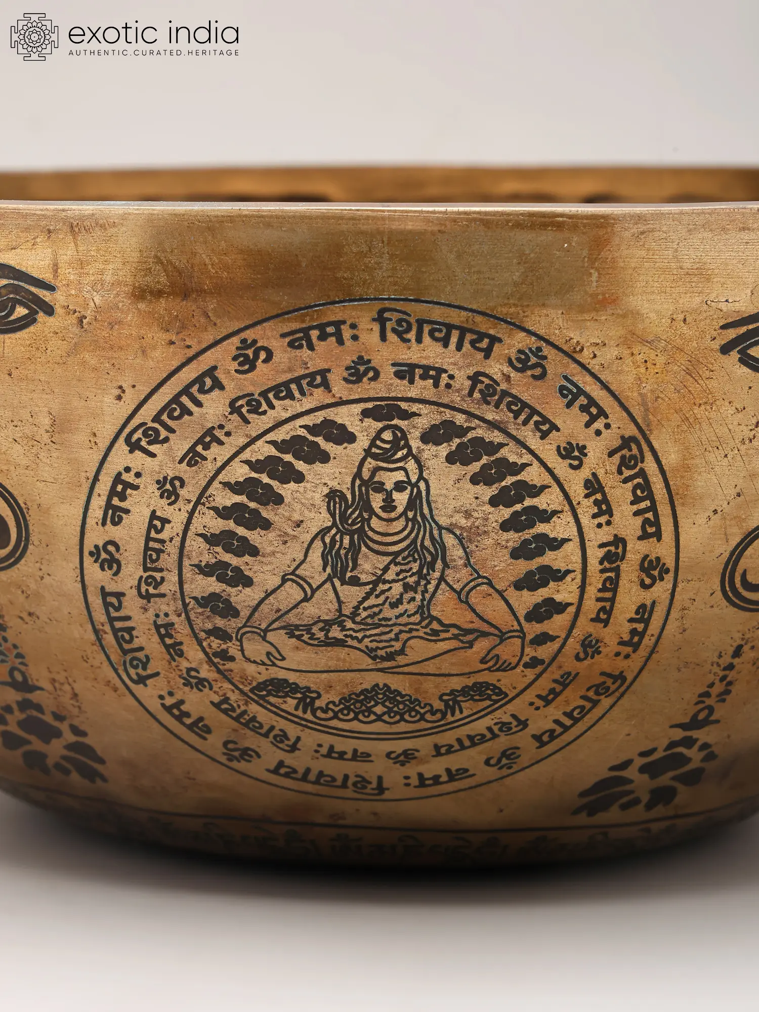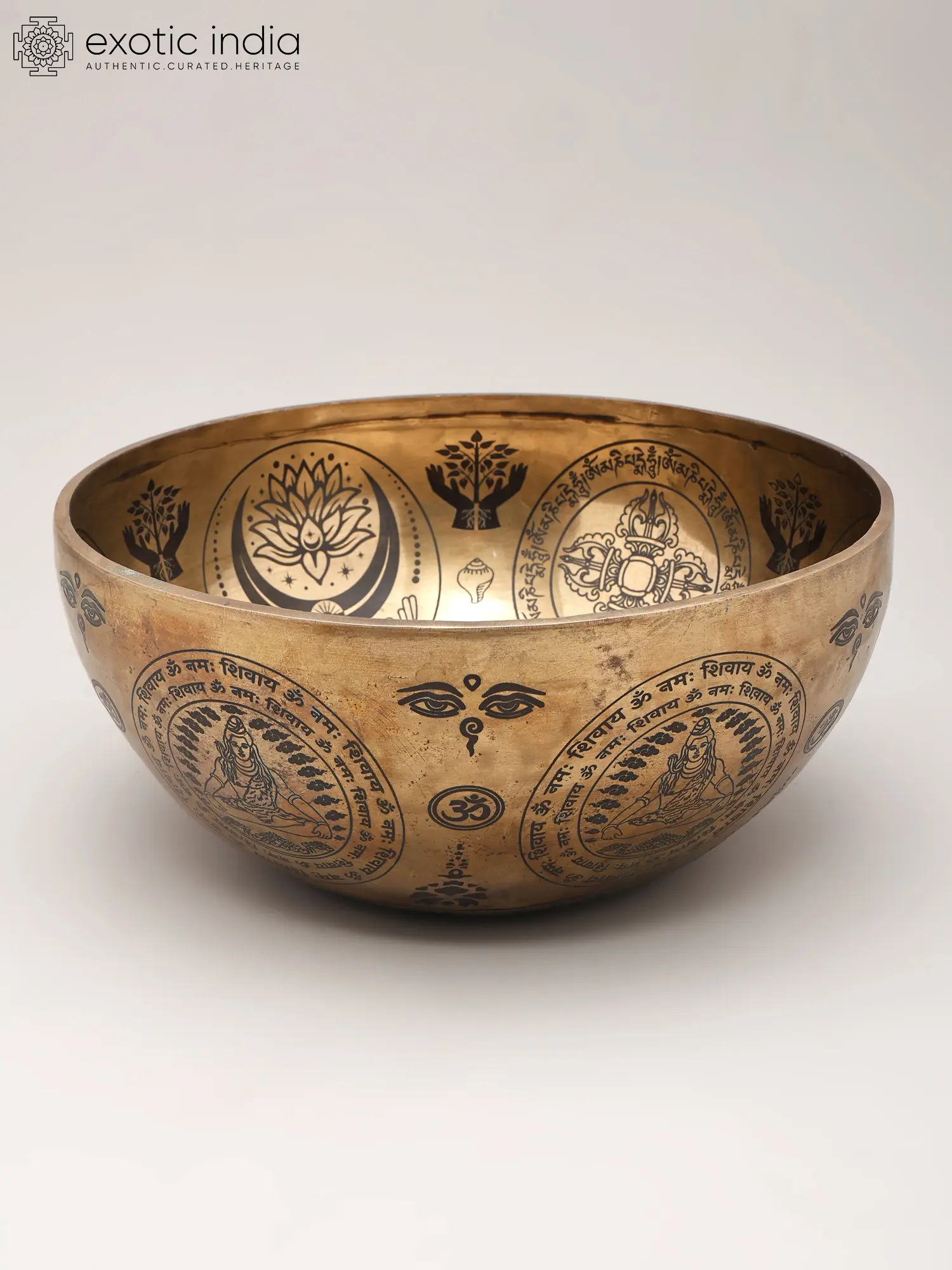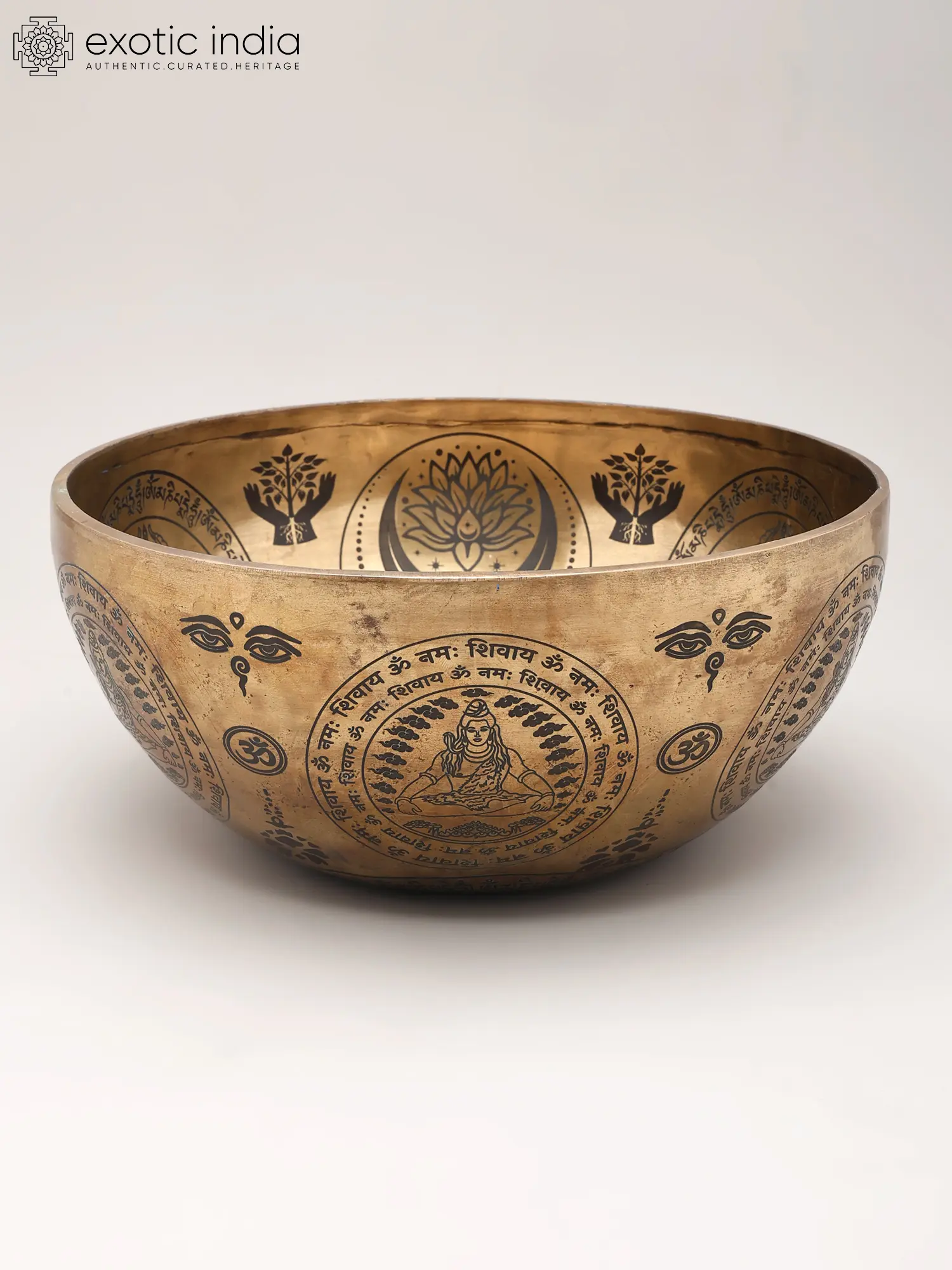 The surface is adorned with a tapestry of profound symbols, enhancing its aesthetic and spiritual allure. At its heart, a depiction of Lord Shiva, the great yogi, is encircled by the potent mantra "Om Namah Shivaya," inviting divine presence. Above, stylized motifs of lotuses, hands cradling a tree of life, and the watchful third eye of Shiva further imbue it with sacred meaning, promising a visual and auditory experience that resonates on multiple levels. The bowl's generous 10.5-inch diameter ensures a full, encompassing sound.