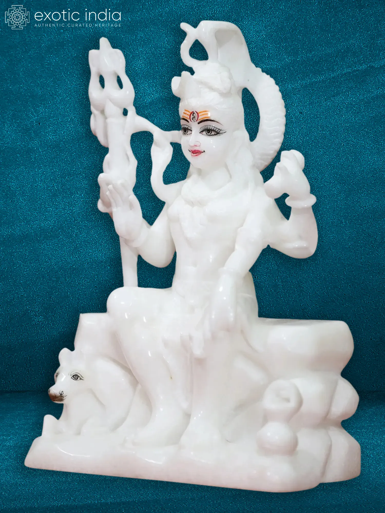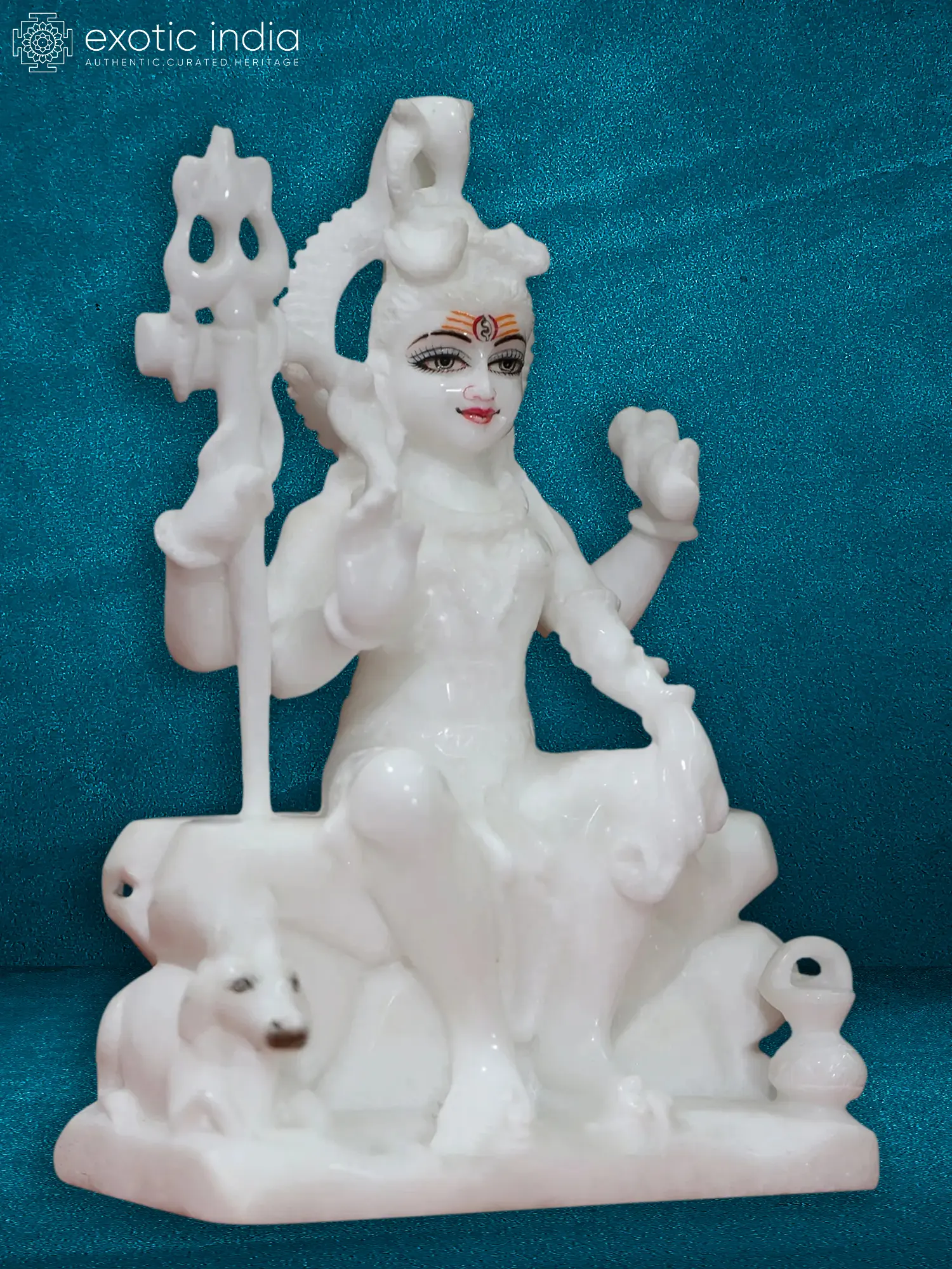 Behold this exquisite sculpture, a testament to the divine grace and formidable power of Lord Shiva, carved from the most pristine Makrana marble. The purity of the white marble, renowned for its luminous quality, lends an ethereal glow to the form of the Destroyer and Transformer of the cosmos. This 10-inch masterpiece captures Shiva in a tranquil, meditative posture, seated regally and exuding an aura of profound peace and unshakeable strength. His multiple arms, often depicted in various mudras, suggest his omnipresence and the multifaceted nature of his divine functions. The intricate detailing, from the coiled locks of hair adorned with the crescent moon and the sacred Ganga, to the serene yet powerful expression on his face, speaks of the masterful artistry involved. The third eye, a symbol of his inner wisdom and destructive power, is rendered with striking precision. The trident, or Trishul, held in one of his hands, represents the three gunas (Sattva, Rajas, Tamas) and the three aspects of time (past, present, future), underscoring his role as the supreme controller. The presence of Nandi, his loyal bull vahana, at his feet, further enhances the devotional narrative, symbolizing strength, loyalty, and righteousness. The gentle form of Nandi, rendered in the same pristine marble, complements the divine figure of Shiva, creating a harmonious tableau.