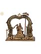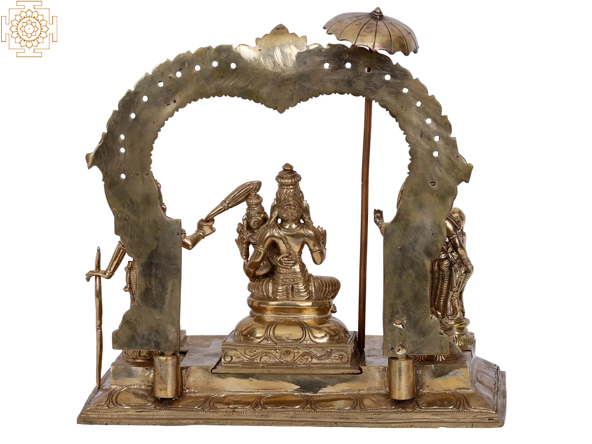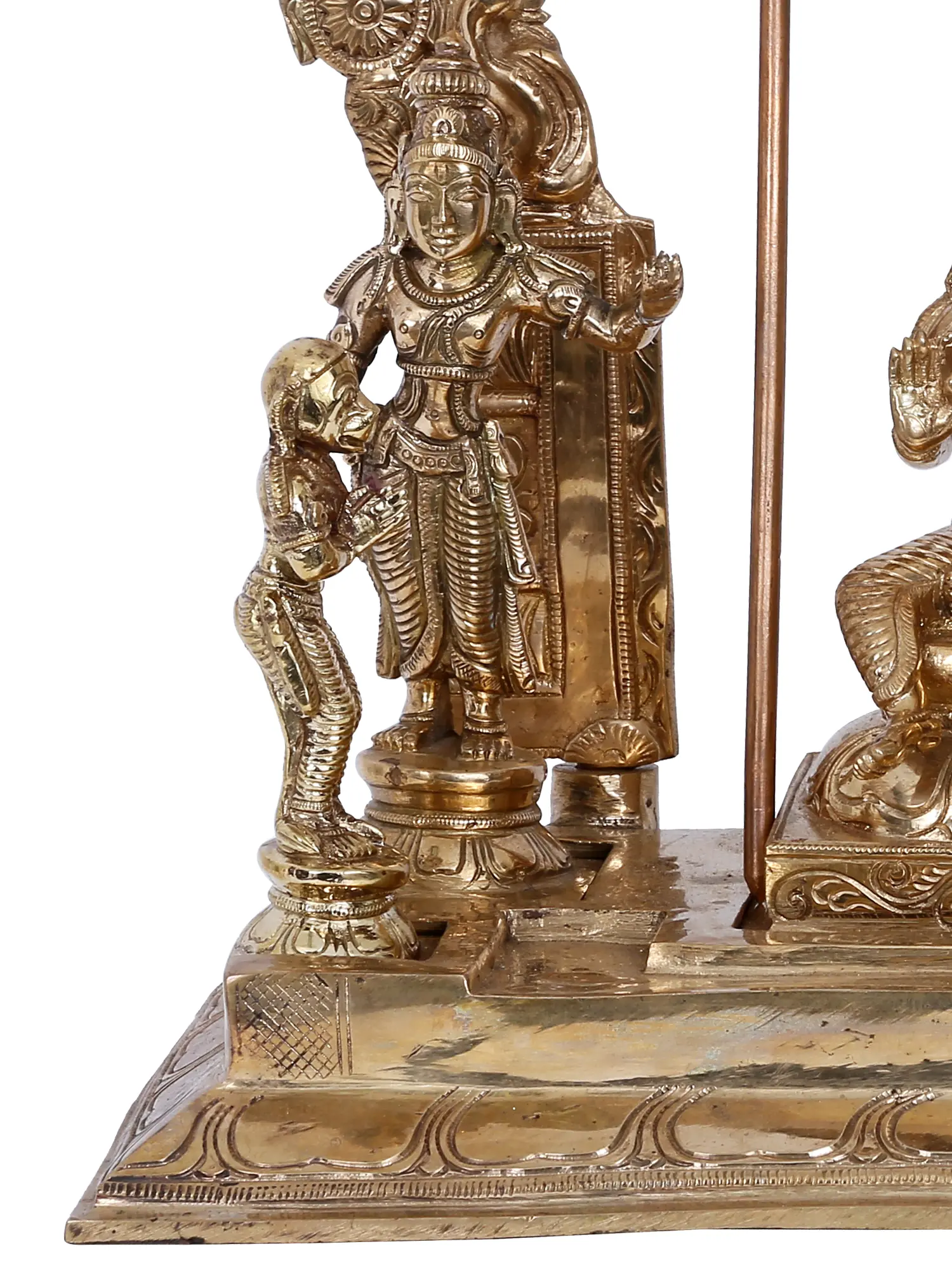 A multi-figure sculpture arranged on a single, wide-set plinth. A complex, many-layered Kirtimukham archway. A high-stemmed parasol that punctuates the near-perfect symmetry of the composition. Such a work would be a valuable, expressive addition to your poojana-kaksha (pooja room).