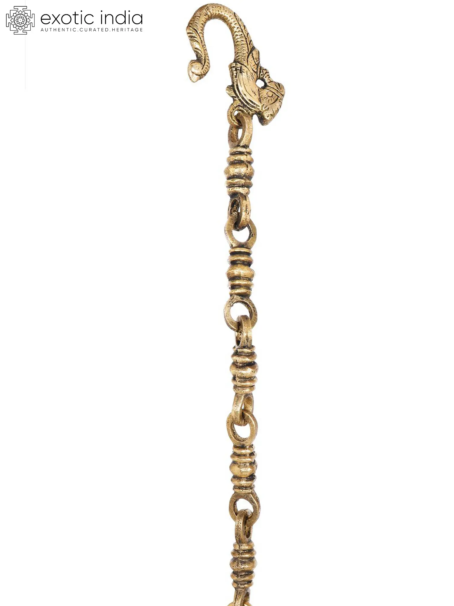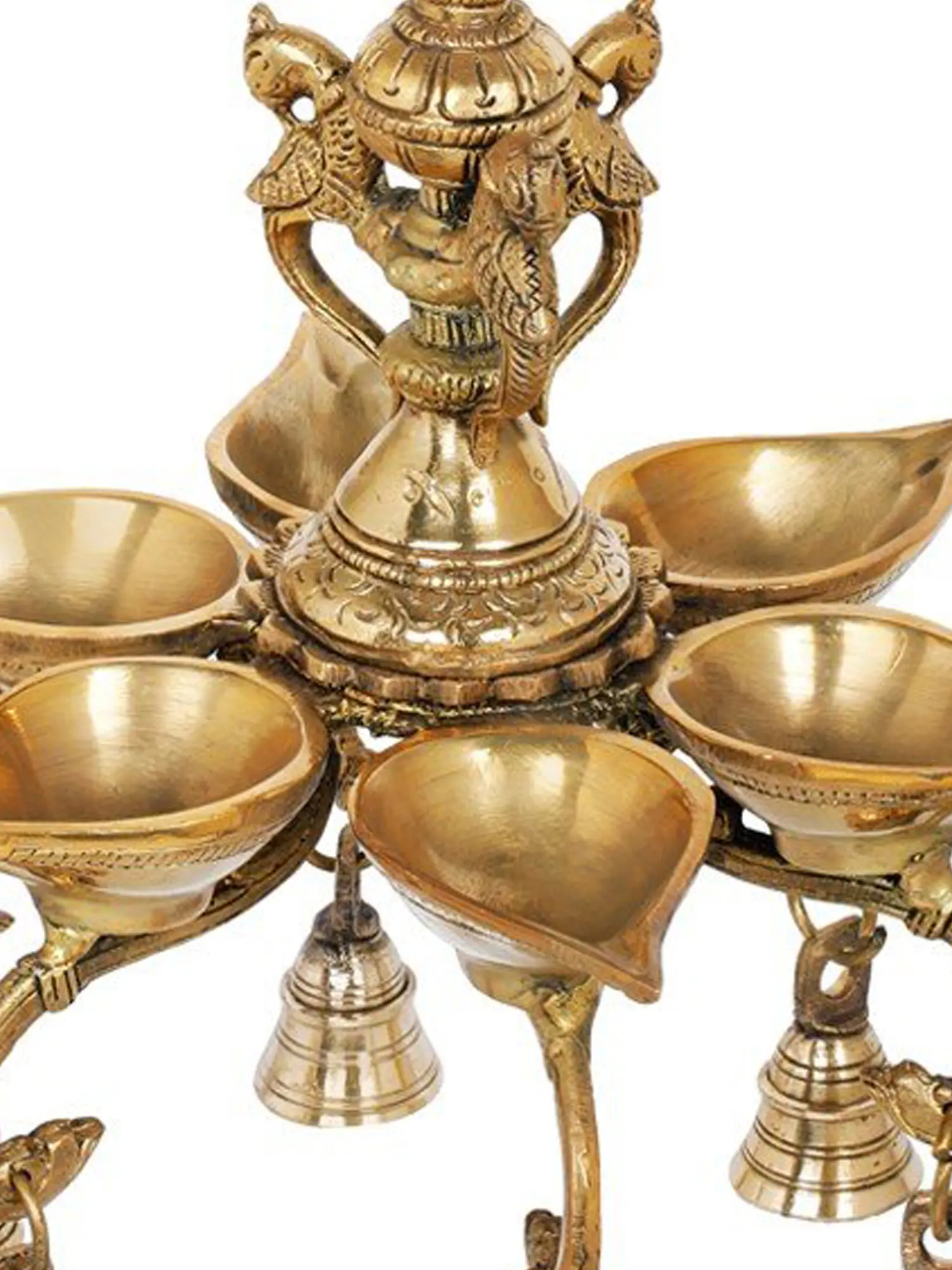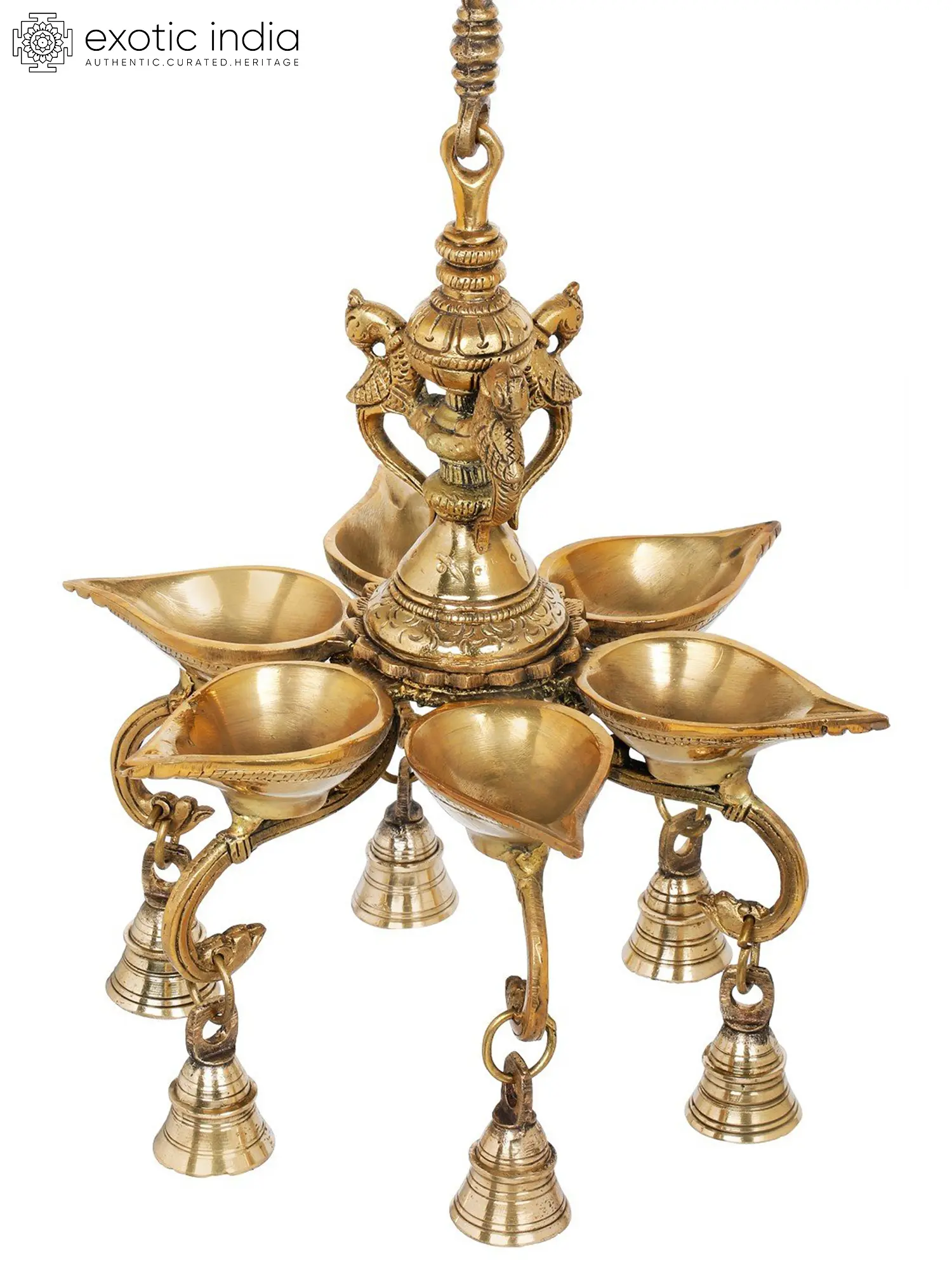 Illuminate your sacred space with the celestial glow of this Roof Hanging Six Wicks Lamp, it carries the essence of centuries-old traditions. The delicate tinkling of the attached bells adds a symphony to your worship, creating an ambiance of serenity and devotion. Crafted from brass, it exudes a timeless charm that resonates with the divine. As you light the six wicks, watch the dancing flames cast ethereal shadows on your surroundings. This lamp not only brightens your space but also your heart, filling it with warmth and tranquility. Let it guide your prayers and lead you to the sacred realms of spirituality.
