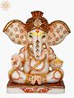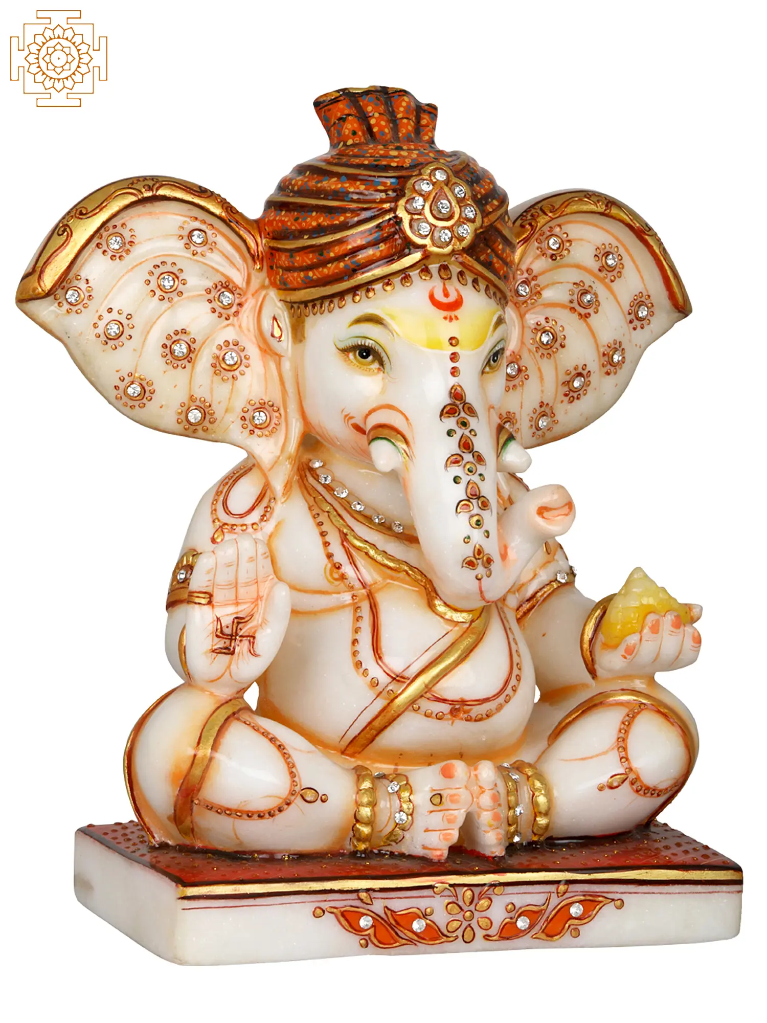 Ganesha is ornated with precious jewels and holds his favorite sweetmeat, laddoo in the left hand and right is held in a blessing mudra with the satiya printed on his palm spreading an aura of divinity. Ganesha is decorated with an orange turban having blue and yellow dot motifs and a large stone studded broch in the centre. His eyes are carved in a naturalistic manner with red-yellow Shaivite tilak glorified on his forehead. Zoom in to the small trunk folding at the bottom, being designed with beautiful floral patterns. This turbaned Ganesha sculpture is formed out of a single piece of marble and will be a decorative ornamentation to your house.