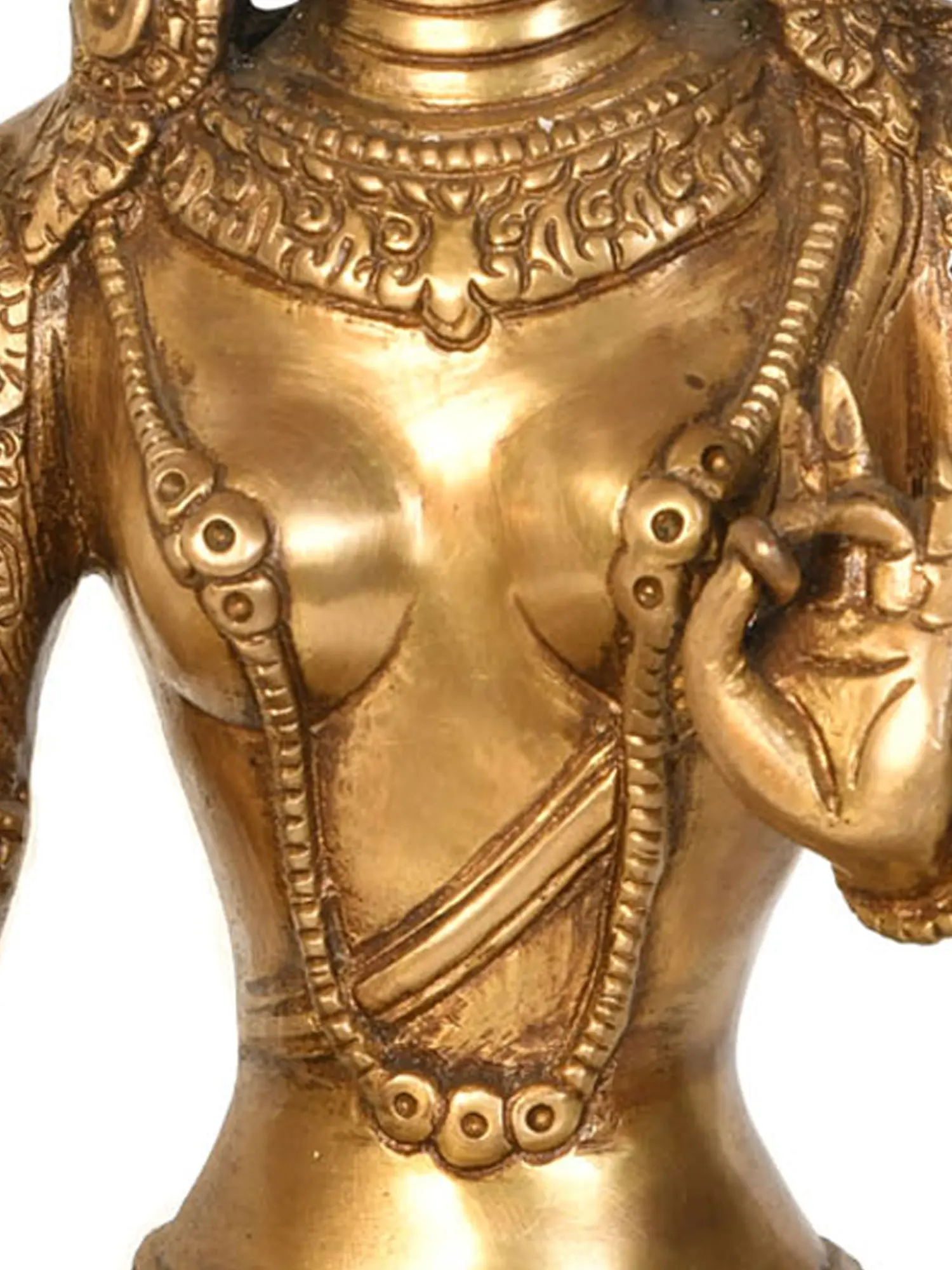 This exquisite brass statue captures the serene and benevolent presence of Green Tara, a revered bodhisattva in Mahayana Buddhism, particularly prominent in Tibetan traditions. Seated in a graceful posture, this artwork embodies a profound sense of peace and active compassion, radiating an aura of protective energy. The skillful craftsmanship, evident in every intricate detail, speaks to the rich artistic heritage of India, where such sacred imagery has been meticulously created for centuries. The iconography of Green Tara is rich with meaning. Legend tells of Tara emerging from a tear shed by the compassionate Avalokiteshvara, witnessing the suffering of sentient beings. She vowed to take birth in female form to help them overcome obstacles and attain enlightenment. Her green complexion signifies her active, dynamic nature, her ability to swiftly respond to prayers and protect those in need. She is considered a manifestation of enlightened activity and is invoked for courage, protection from fear, and the fulfillment of virtuous aspirations.