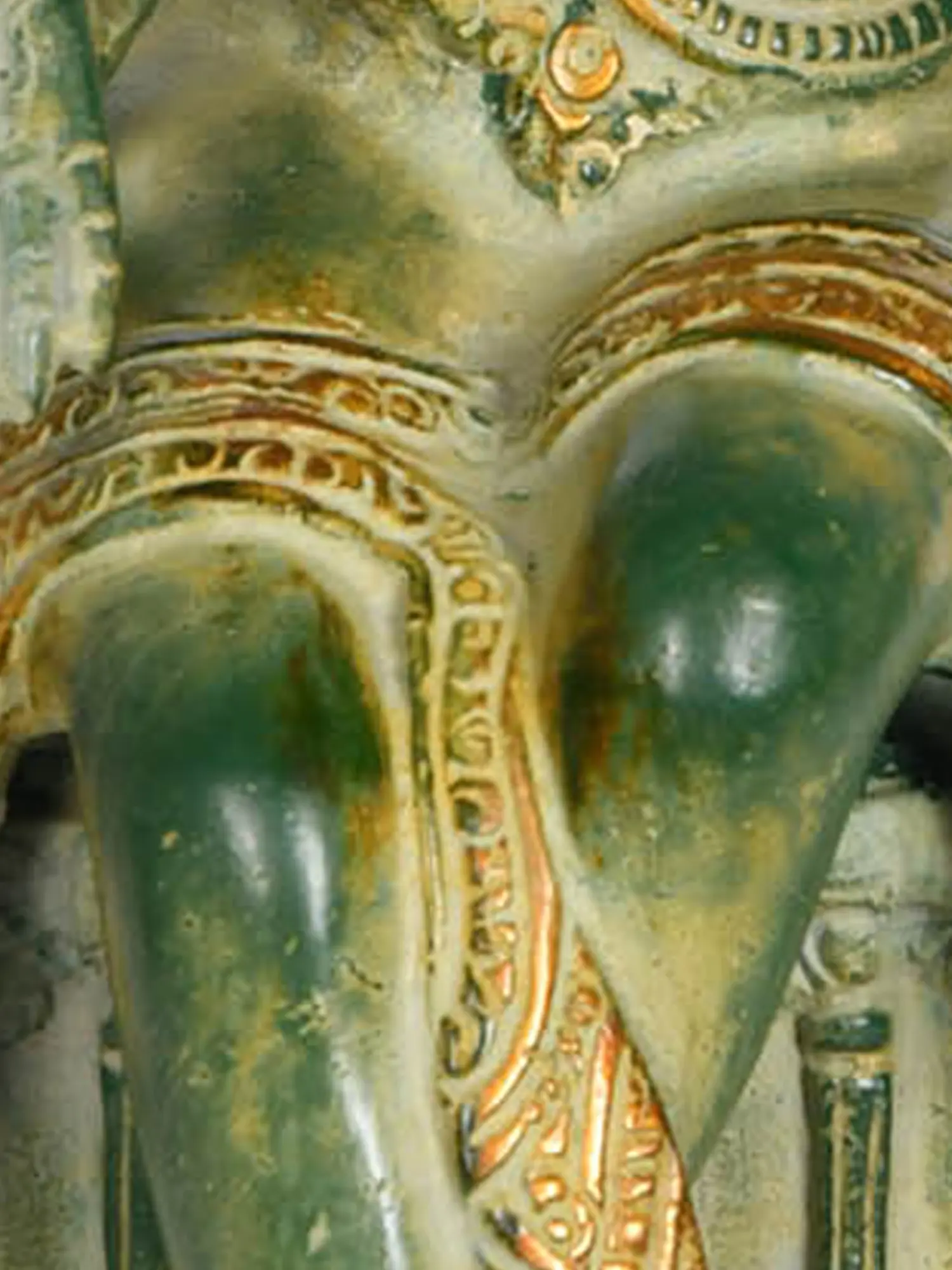 Among the many forms of Tara, the Green Tara is particularly celebrated for her swiftness in responding to prayers and alleviating suffering. Legend has it that she was born from a tear of compassion shed by Avalokiteshvara, the Bodhisattva of compassion. Seeing the immense suffering in the world, Avalokiteshvara wept, and from his tears, Tara emerged in the form of a beautiful woman, vowing to help all beings achieve enlightenment. Her green complexion symbolizes her active, dynamic energy, her ability to overcome obstacles, and her connection to the vibrant forces of nature. This statue depicts her in a posture of ease, with her right leg extended, signifying her readiness to descend and offer aid. ––––––––––––––––––––