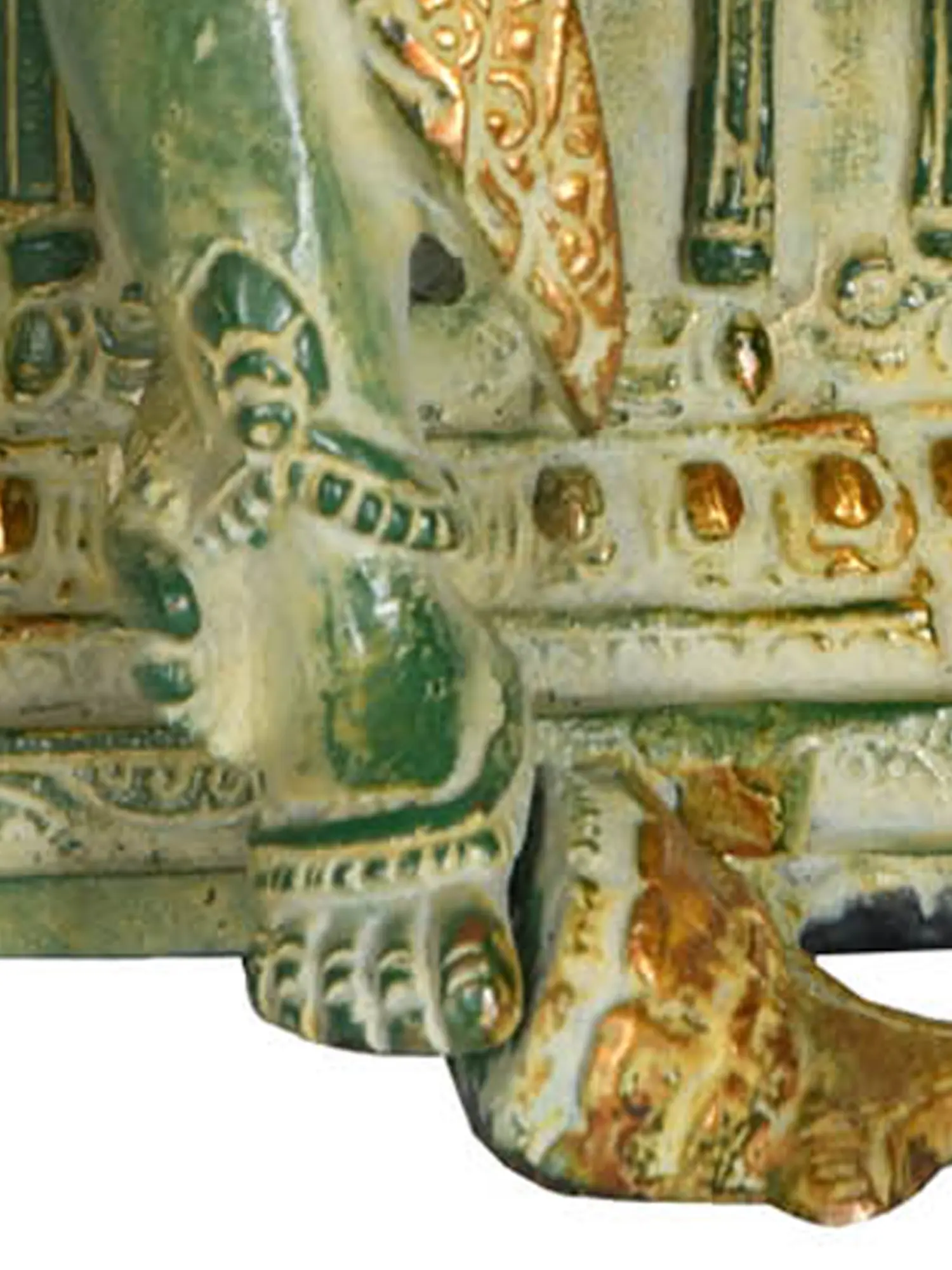The skilled artisans of India have poured their devotion and expertise into creating this remarkable statue. Fashioned from high-quality brass, the figure is imbued with a rich patina, enhanced by delicate green and gold accents that highlight the intricate details of her adornments. From the elaborate crown adorning her head to the flowing robes and the finely rendered facial features, every element speaks of meticulous craftsmanship and a deep understanding of Buddhist iconography. The base upon which she sits is equally detailed, featuring ornate patterns and architectural elements that further elevate the statue's aesthetic and spiritual significance. This piece is a testament to the enduring tradition of Indian metalwork, where artistry and spirituality are inextricably linked. ––––––––––––––––––––