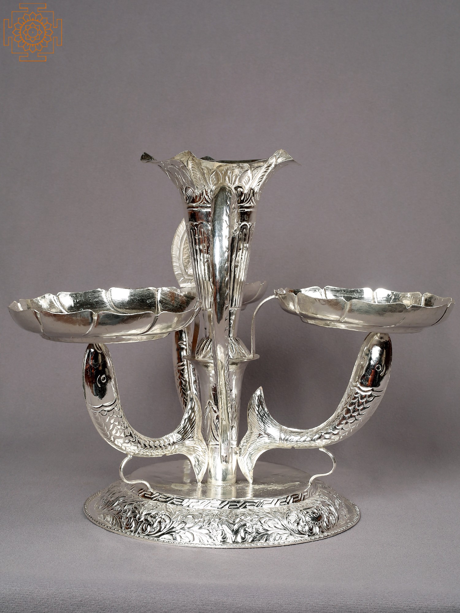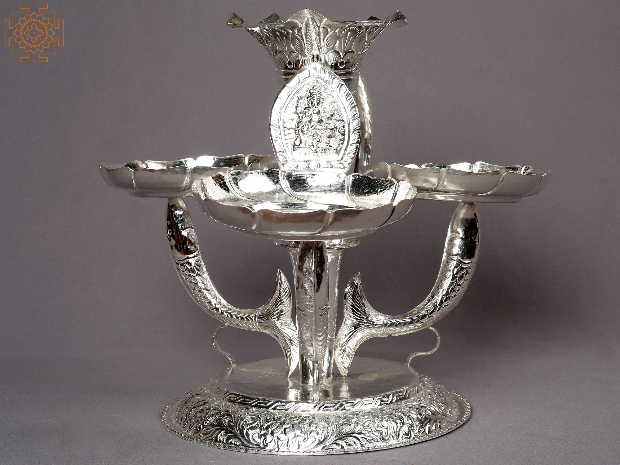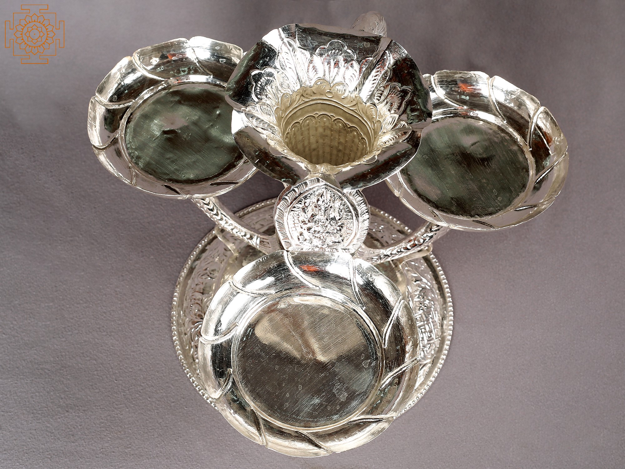 The primary purpose of this Tikadani is to hold and display an array of devotional lamps. These lamps, when lit, serve as offerings to the divine, creating an atmosphere of sanctity and peace. The practice of lighting lamps is an ancient tradition, believed to invite auspiciousness, purify the environment, and facilitate a deeper connection with the spiritual realm. This silver Tikadani, with its multiple receptacles, allows for a more elaborate and visually stunning display of this sacred ritual, making it ideal for pujas, ceremonies, or as a permanent centerpiece in a home shrine. Its substantial form and gleaming silver ensure it will be a treasured heirloom for generations to come.