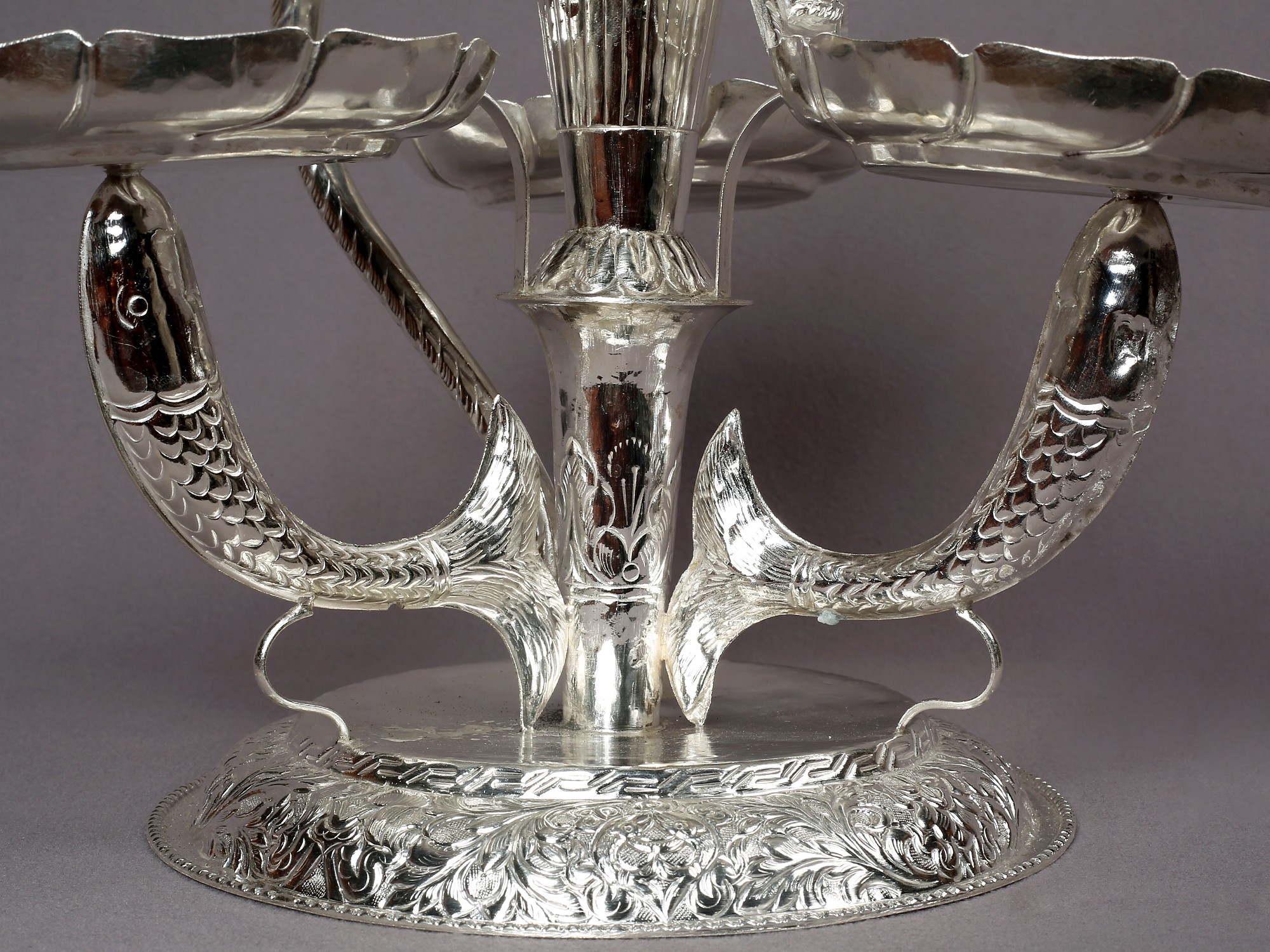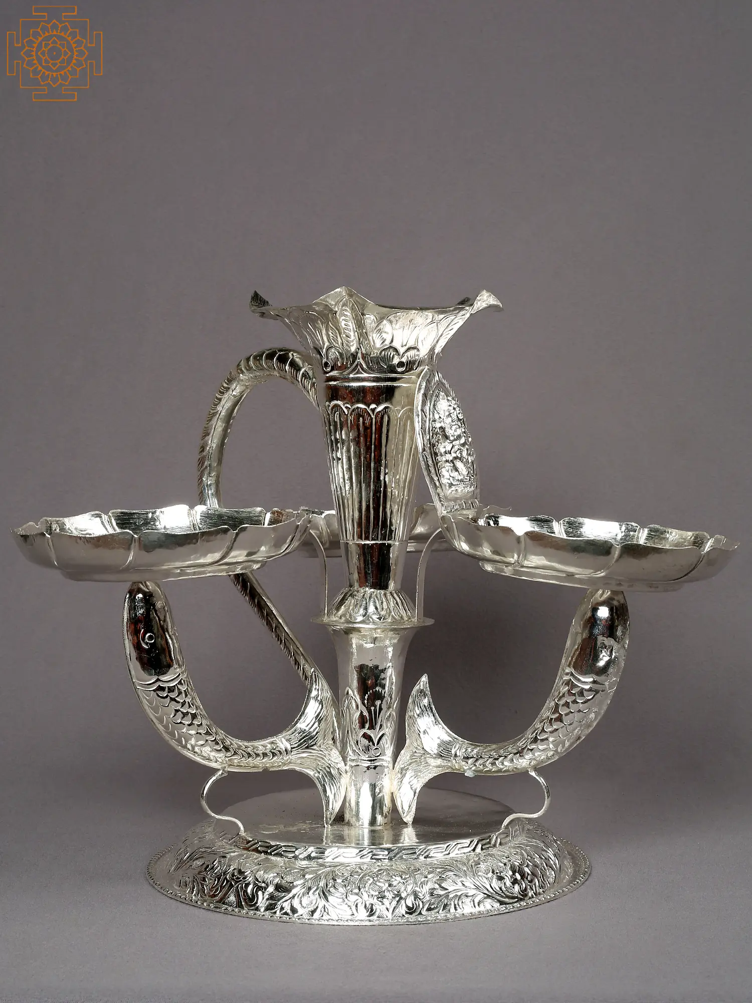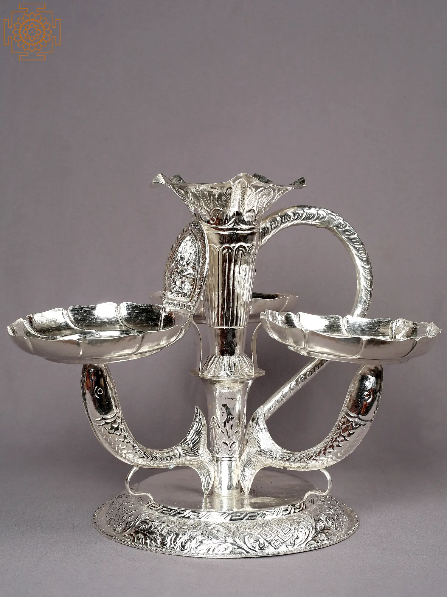 The primary purpose of this Tikadani is to hold and display an array of devotional lamps. These lamps, when lit, serve as offerings to the divine, creating an atmosphere of sanctity and peace. The practice of lighting lamps is an ancient tradition, believed to invite auspiciousness, purify the environment, and facilitate a deeper connection with the spiritual realm. This silver Tikadani, with its multiple receptacles, allows for a more elaborate and visually stunning display of this sacred ritual, making it ideal for pujas, ceremonies, or as a permanent centerpiece in a home shrine. Its substantial form and gleaming silver ensure it will be a treasured heirloom for generations to come.