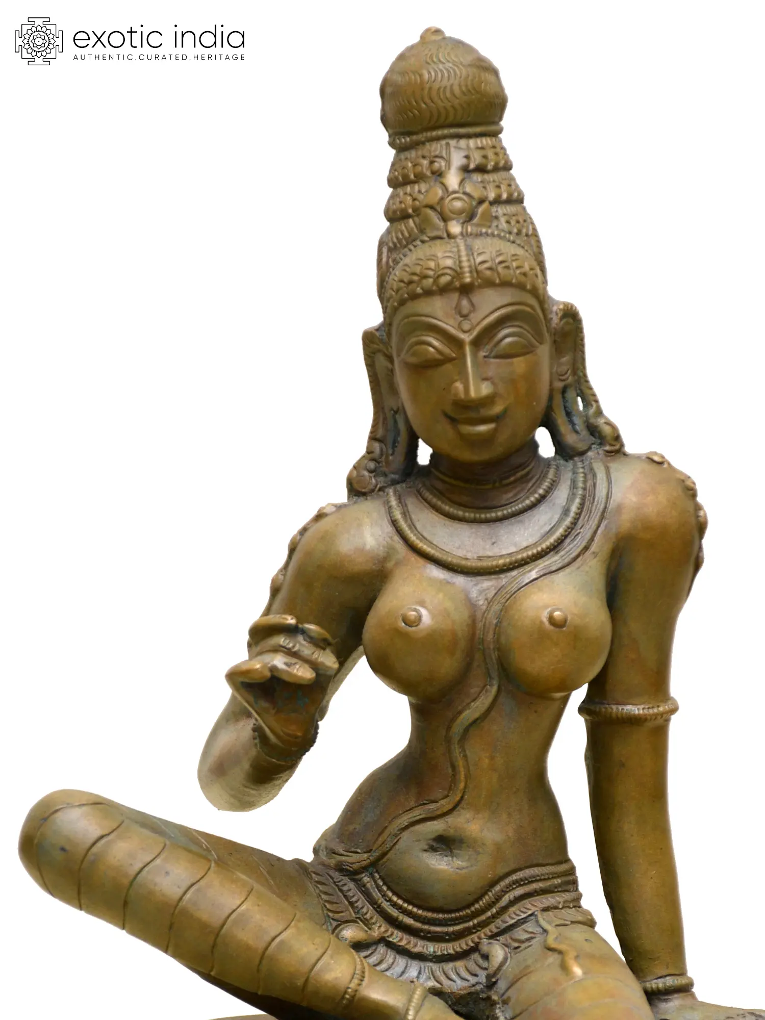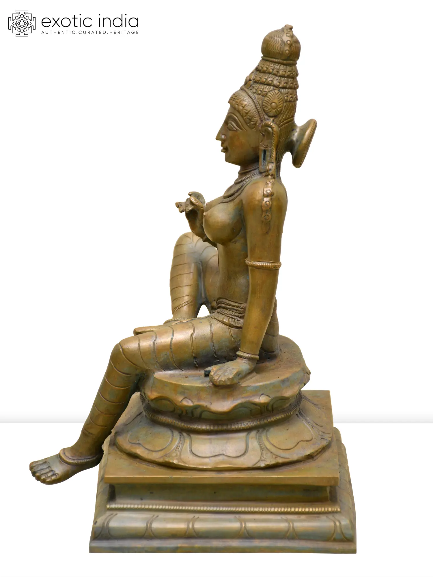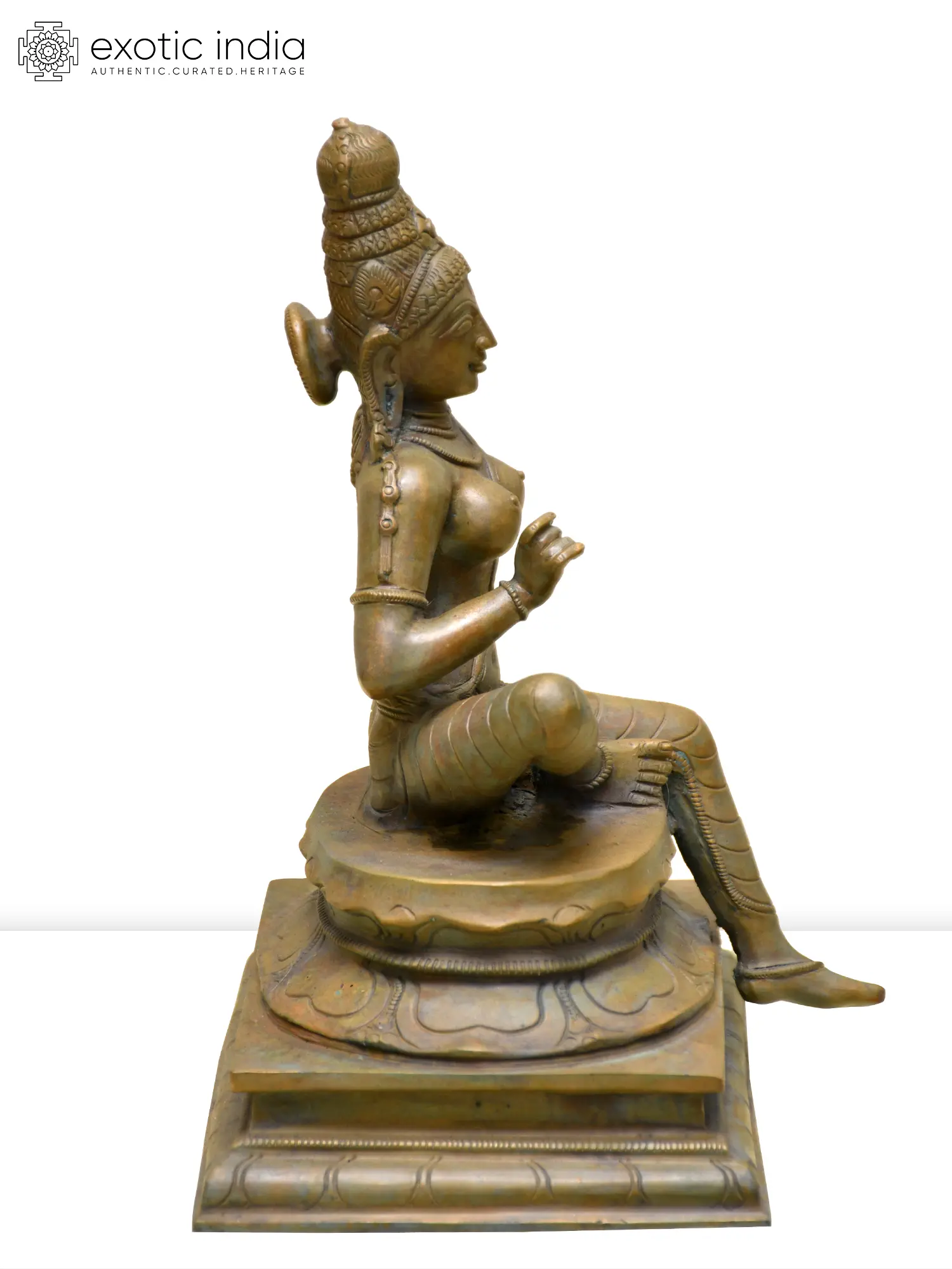 Evoking the feminine allure of Uma-Parvati, this bronze statue presents her seated in the royal Lalitasana pose, on an inverted lotus platform.