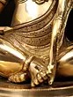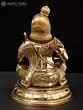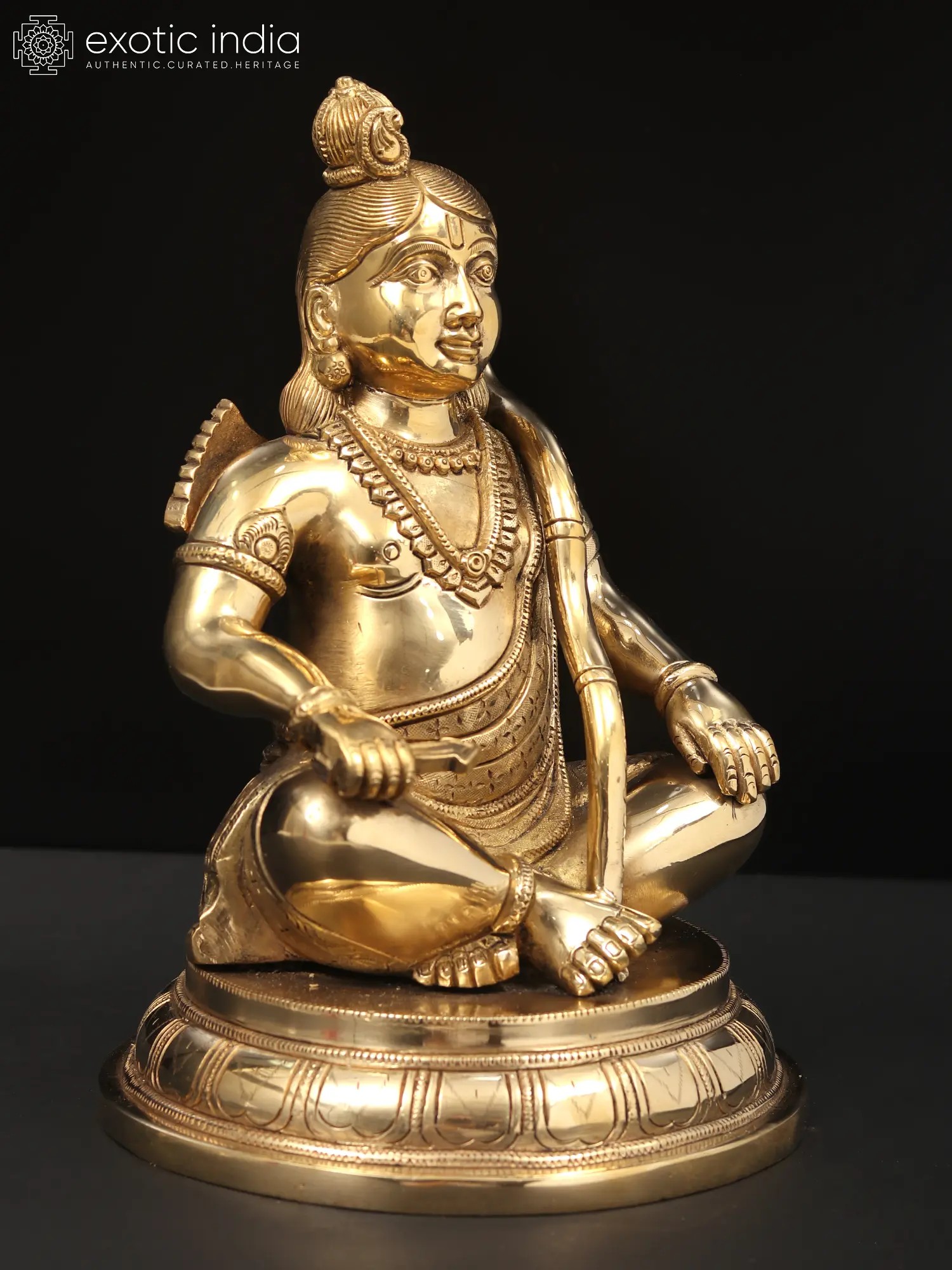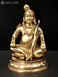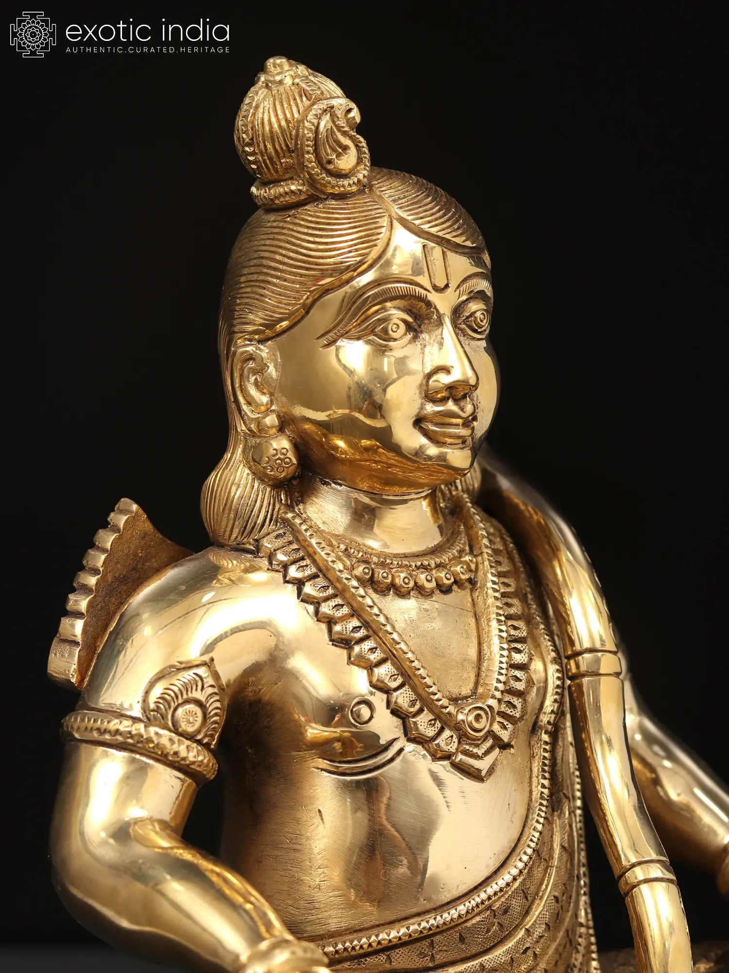 This brass statue portraying Sitting Prabhu Shri Rama is an adorable depiction of Lord Rama sitting cross-legged, exuding a serene aura that emanates peace and inner strength. His charming appearance is accentuated by a side bun, fastened with a headband adorned with a paisley or amra motif, adding a touch of elegance to his demeanor. With minimal jewelry adorning his form, the focus remains on his divine presence and tranquil expression.