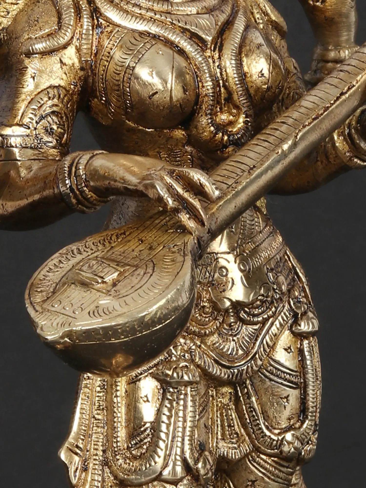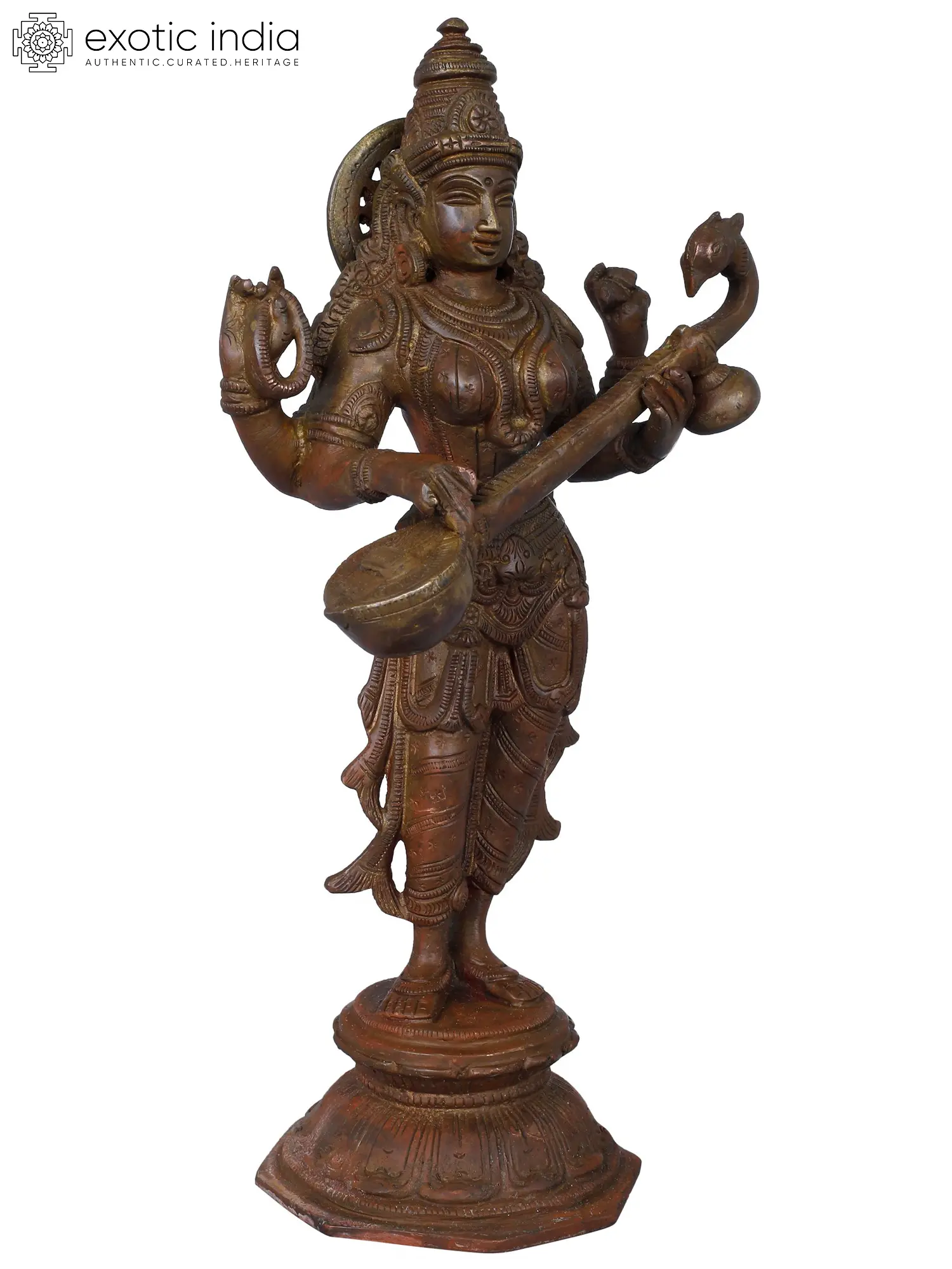 Embrace the goddess of knowledge and art with this Brass Standing Saraswati idol. Crafted in India, this sculpture embodies the essence of wisdom, creativity, and the interconnectedness of learning and artistry. Saraswati is revered as the patron of knowledge, arts, and music. Her standing form signifies the constant flow of wisdom and creativity. The intricately crafted brass statue serves as a visual reminder of the interconnectedness of learning and artistic expression, echoing the core concept of "Vidya-Dana" - the gift of knowledge. Having Saraswati in your space not only adds a touch of intellectual depth but also invites the energy of creativity and learning. It serves as a profound reminder of the interconnectedness of knowledge and the blossoming of artistic expression.