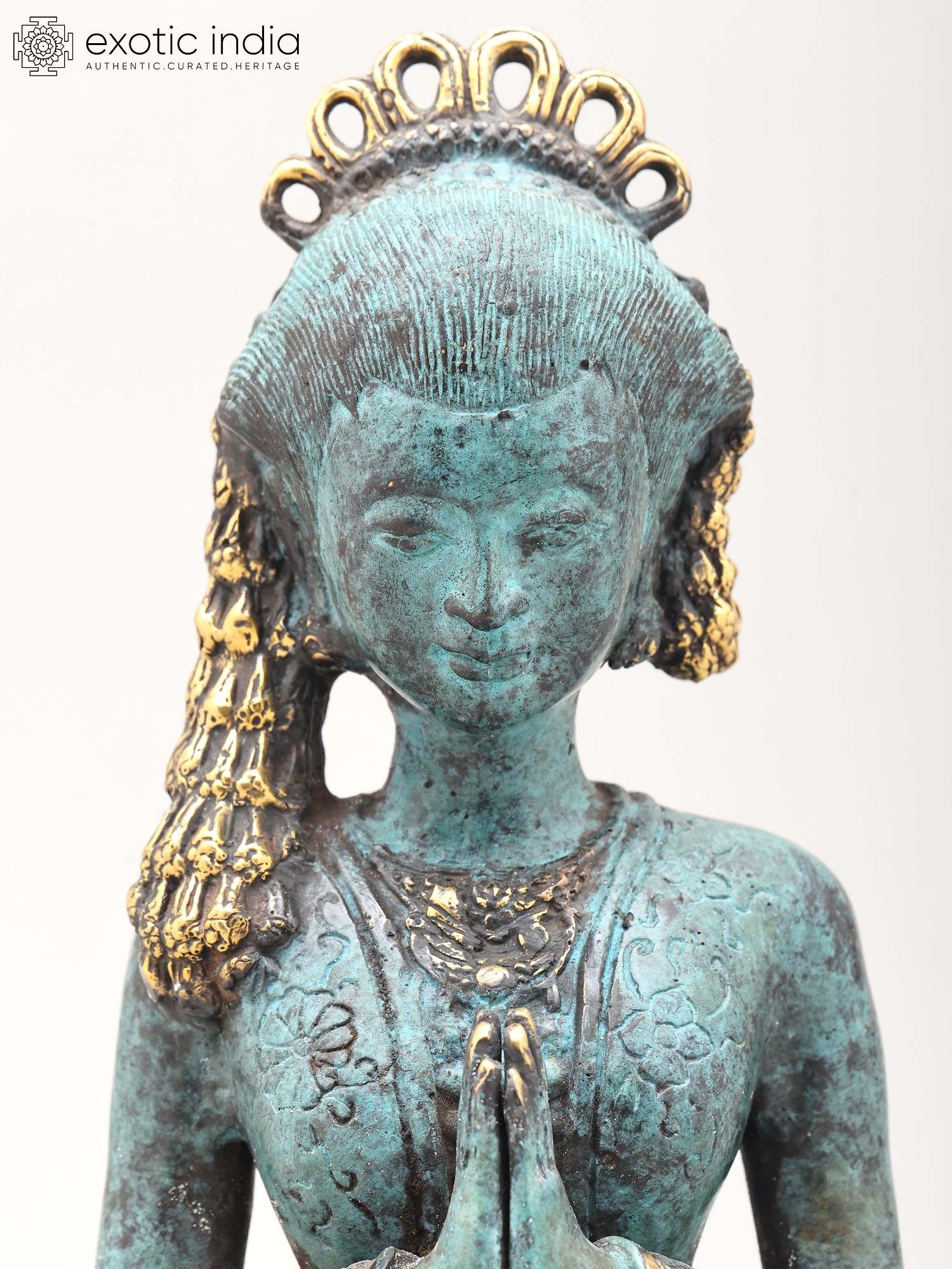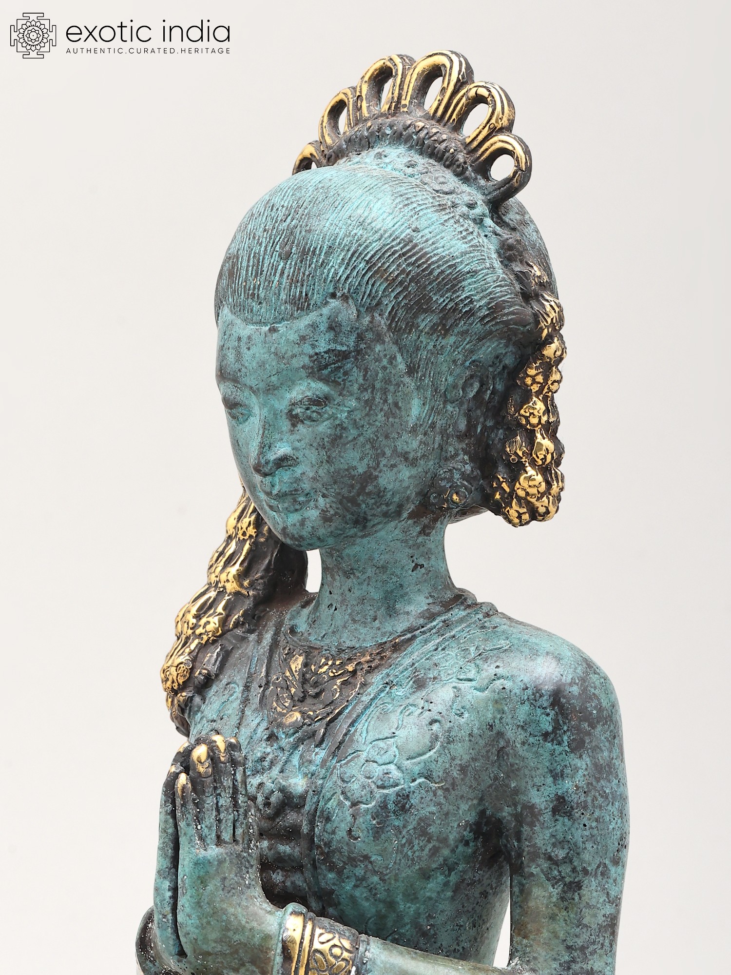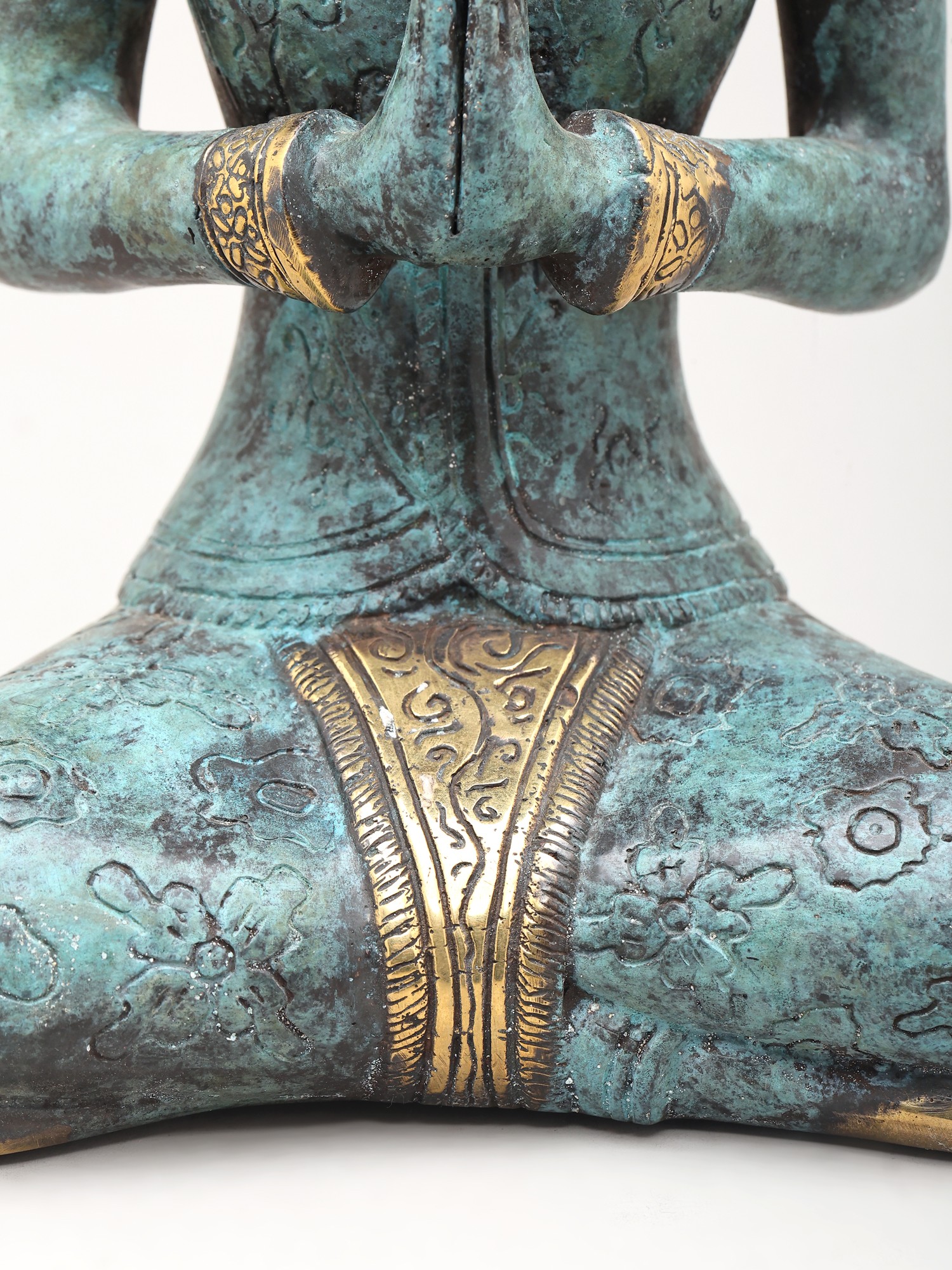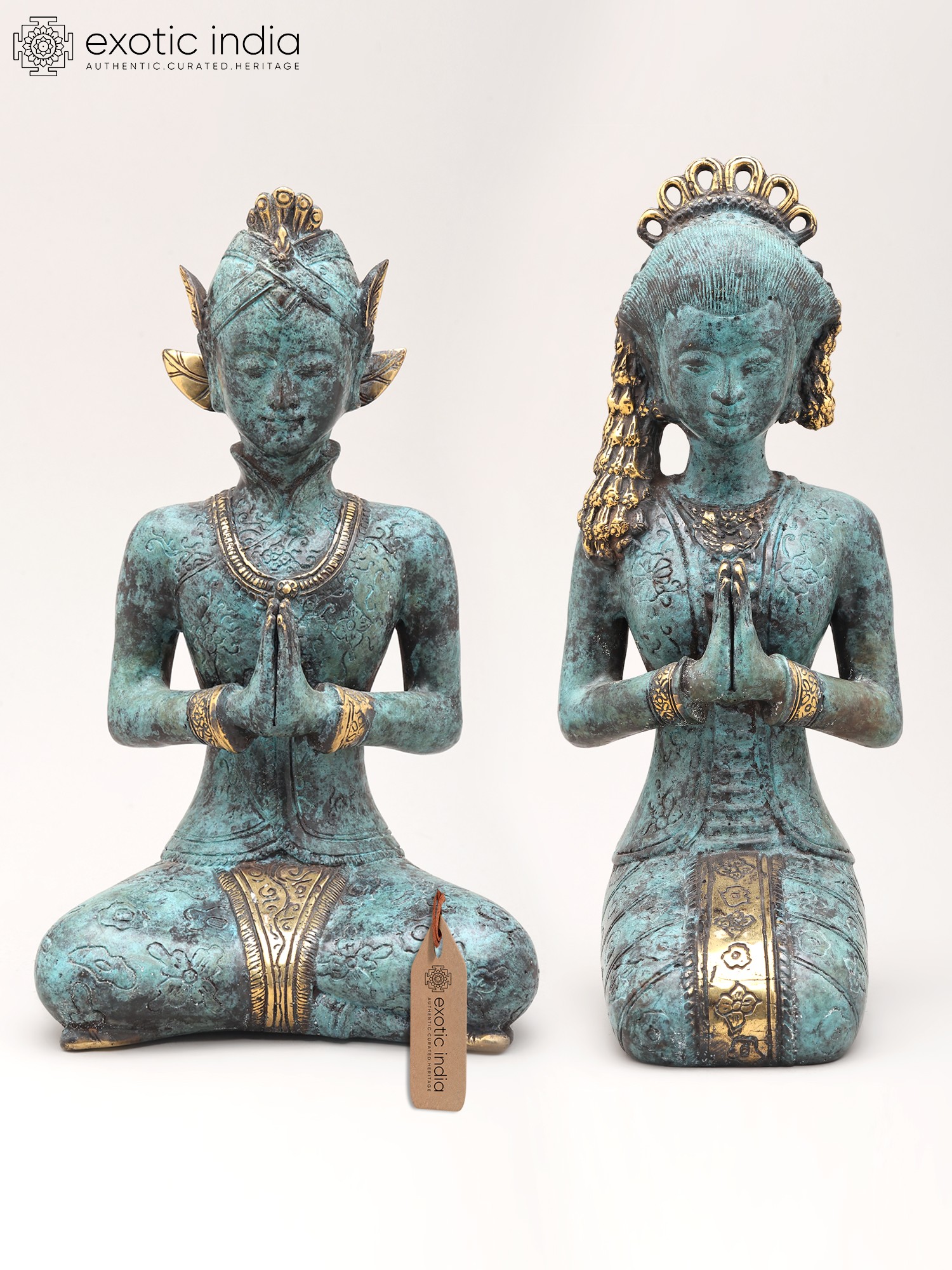 You'll appreciate the intricate detailing that adorns these figures, from the delicately rendered facial features and ornate headdresses to the flowing garments embellished with subtle patterns. The complementary hues of verdant patina and polished brass create a visually captivating contrast, drawing the eye to the serene anjali mudra, or prayerful gesture, of the clasped hands. Standing at approximately ten inches tall, their presence is substantial yet never overwhelming, designed to enhance, not dominate, your surroundings.