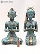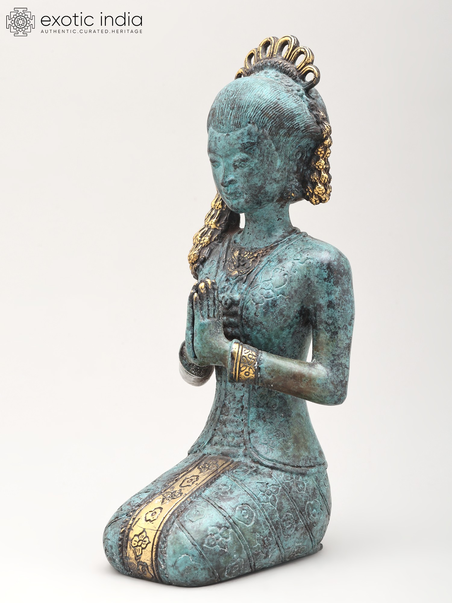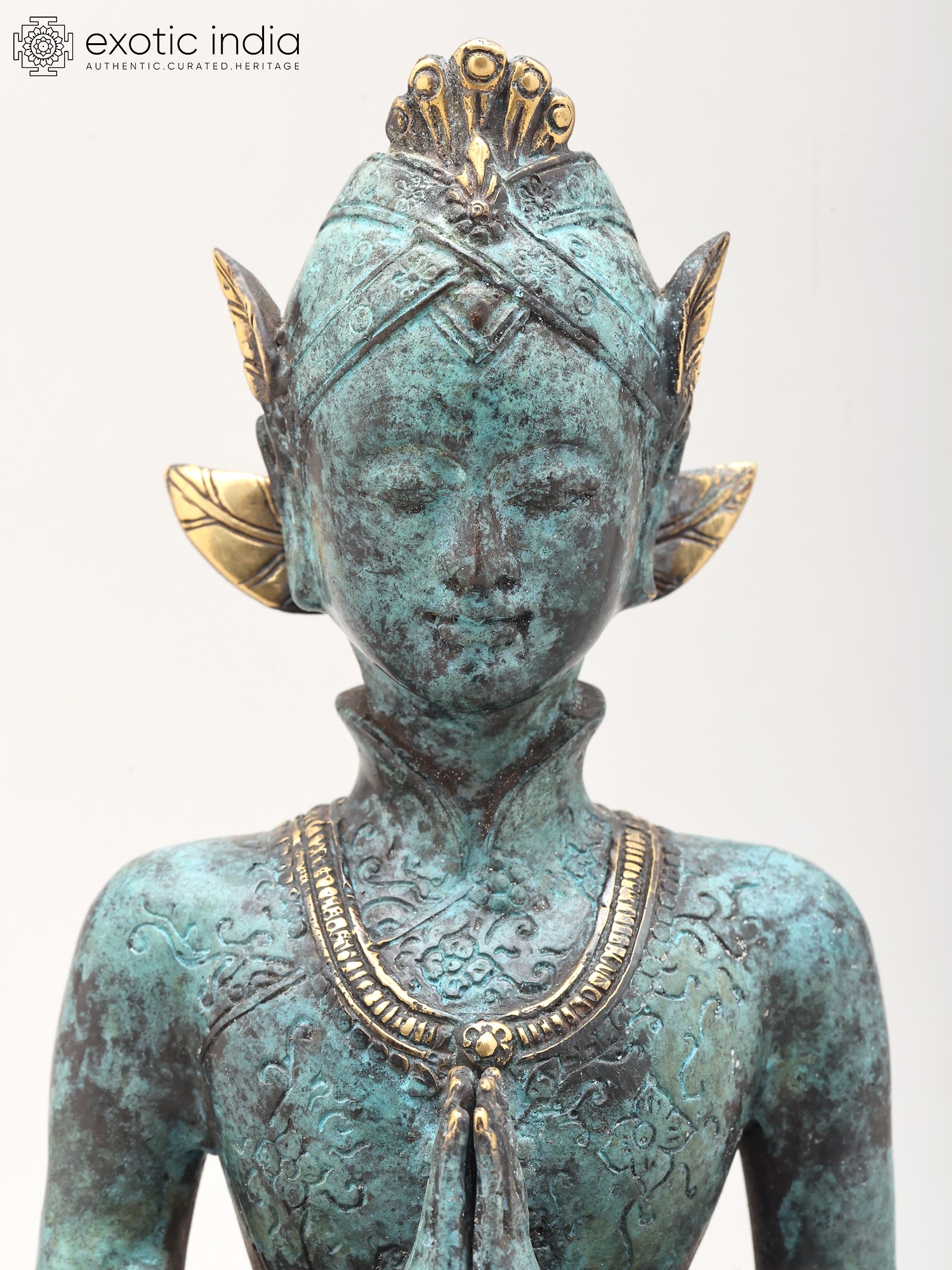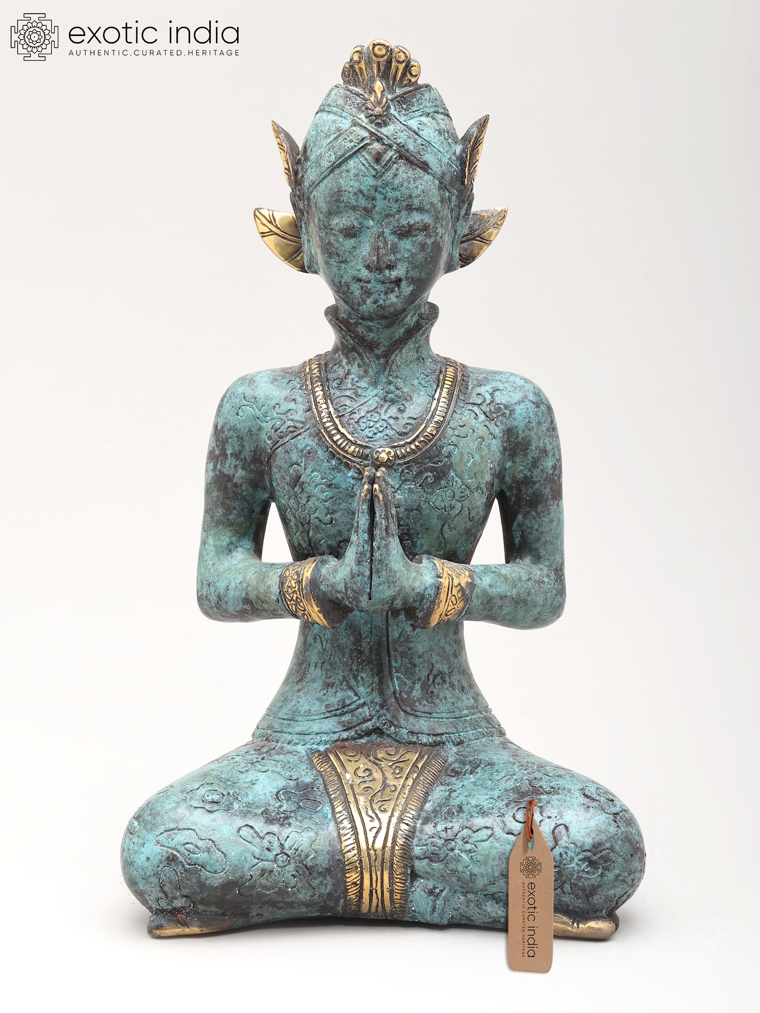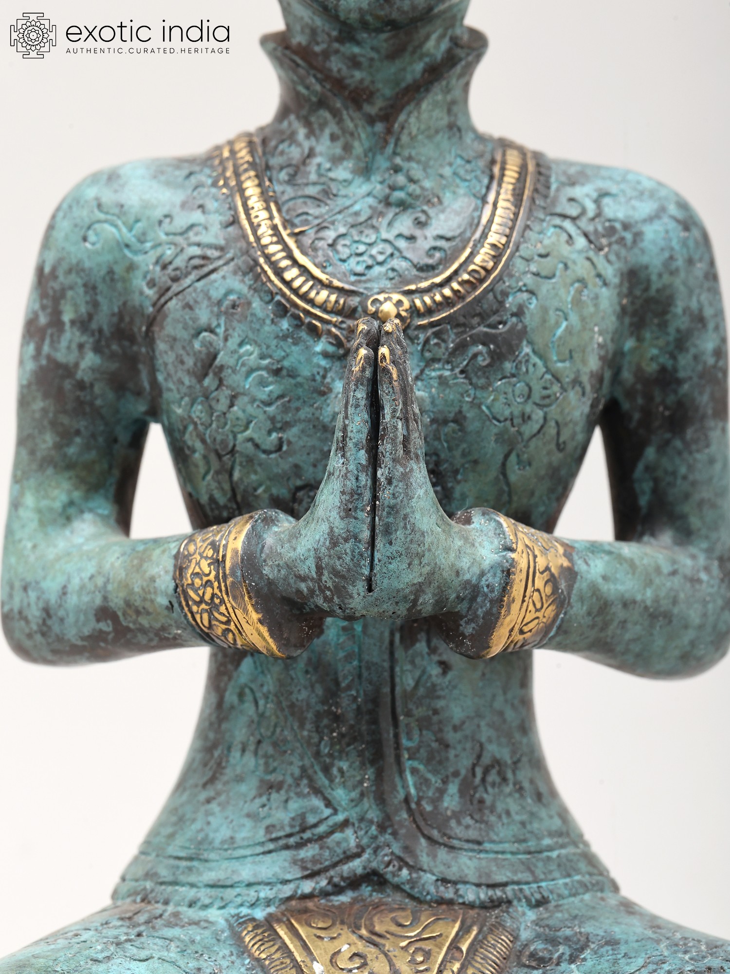 You'll appreciate the intricate detailing that adorns these figures, from the delicately rendered facial features and ornate headdresses to the flowing garments embellished with subtle patterns. The complementary hues of verdant patina and polished brass create a visually captivating contrast, drawing the eye to the serene anjali mudra, or prayerful gesture, of the clasped hands. Standing at approximately ten inches tall, their presence is substantial yet never overwhelming, designed to enhance, not dominate, your surroundings.