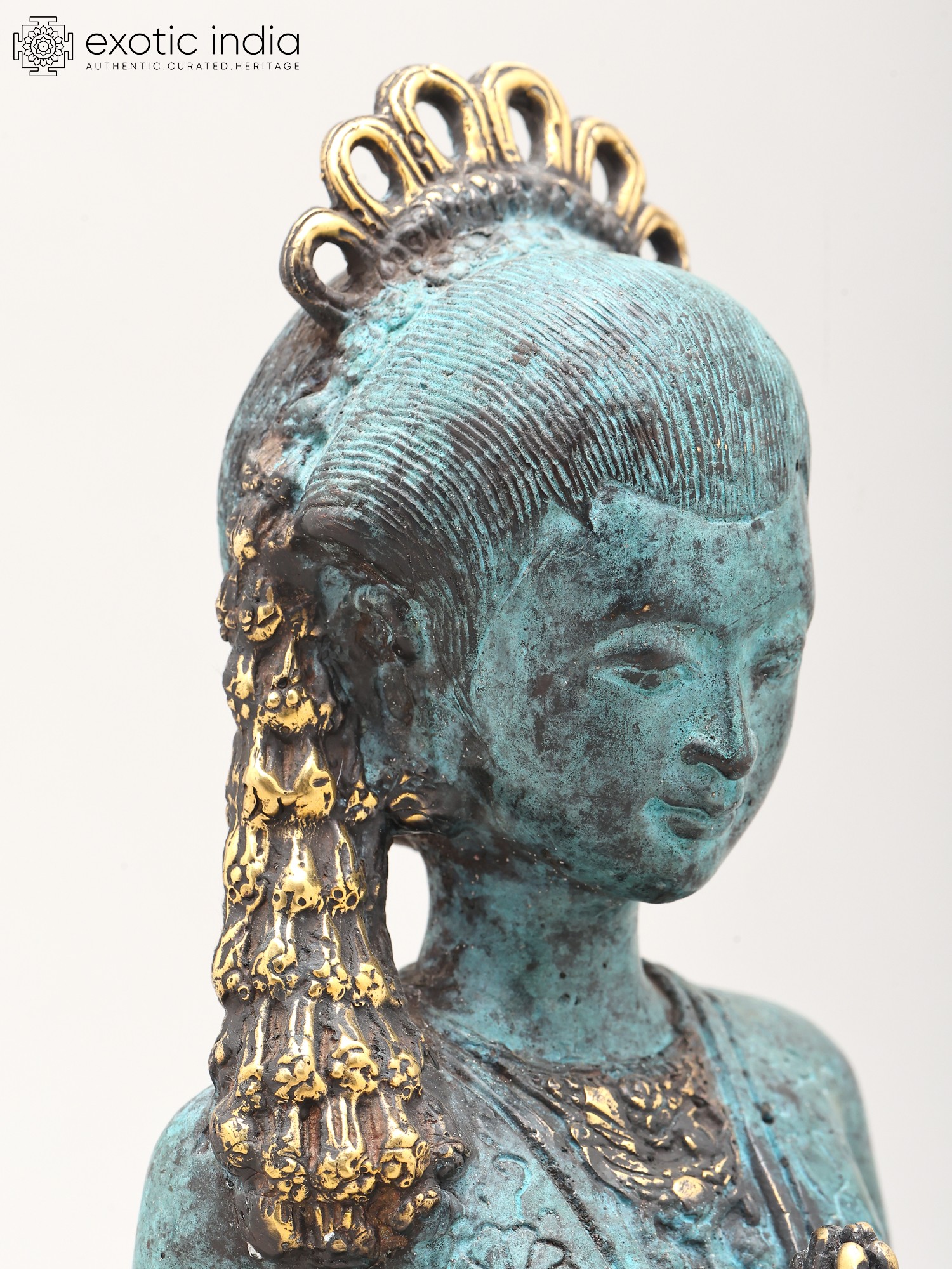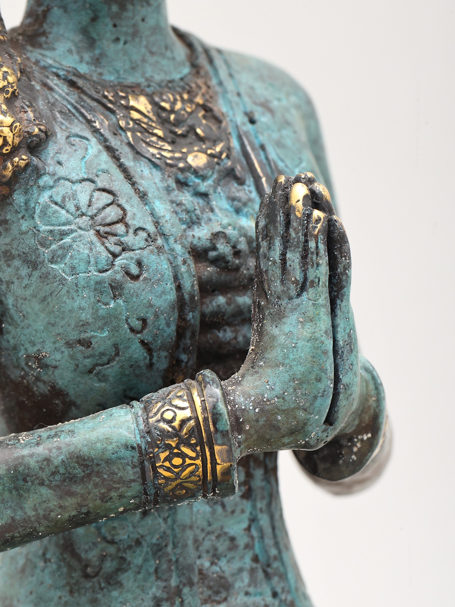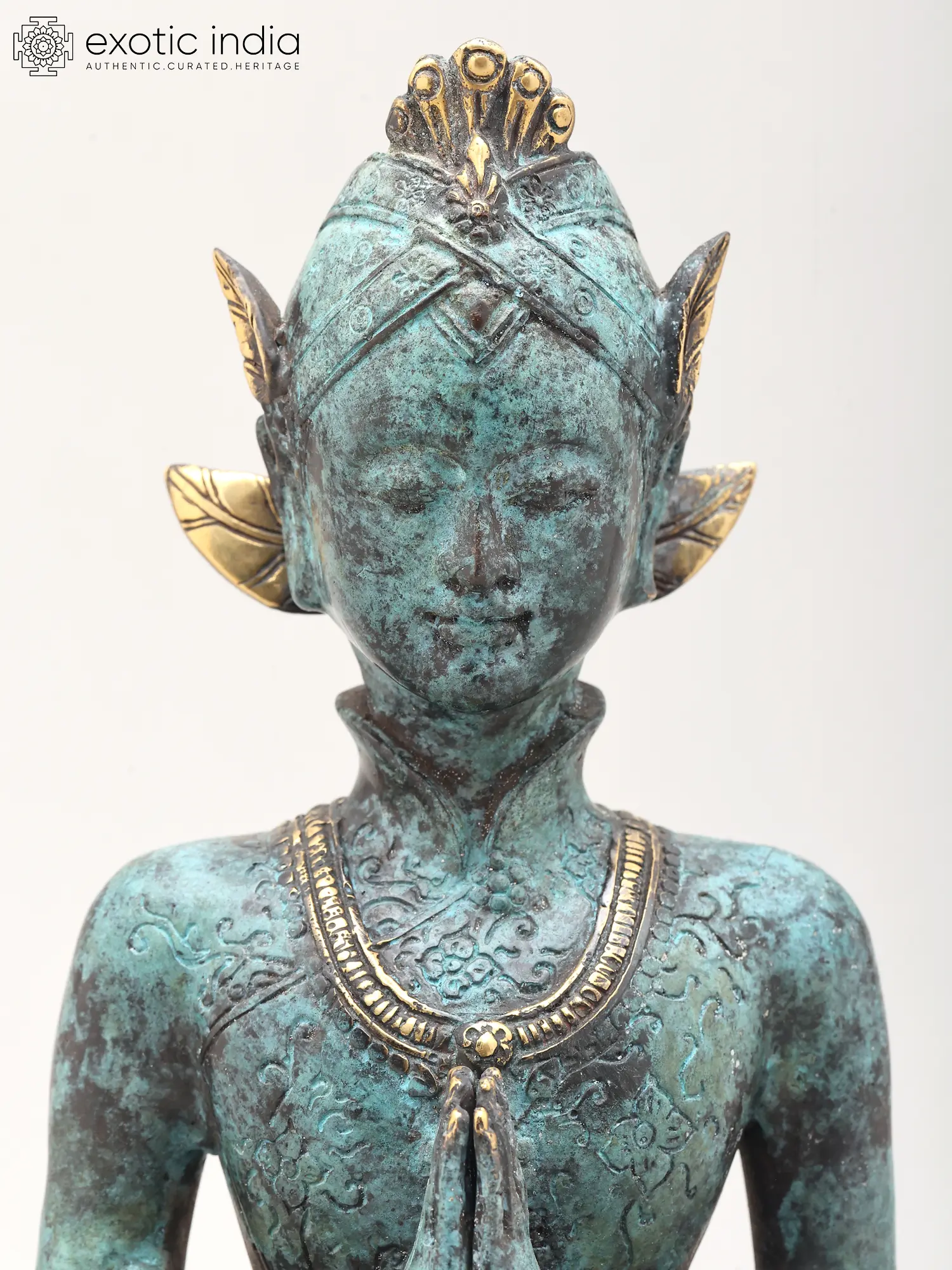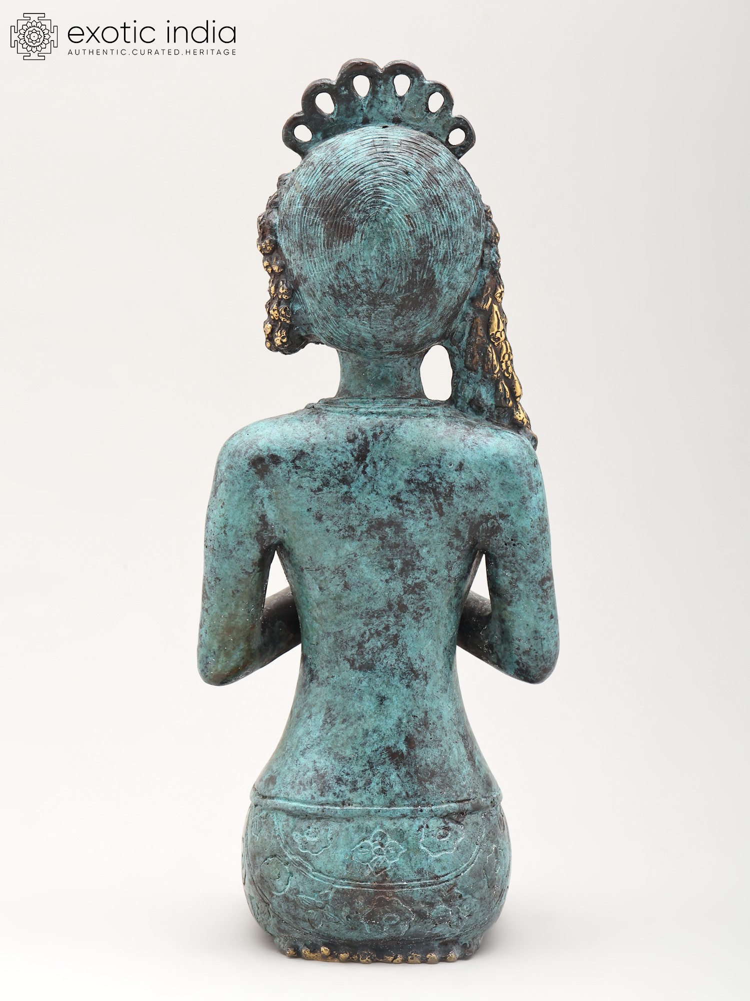 You'll appreciate the intricate detailing that adorns these figures, from the delicately rendered facial features and ornate headdresses to the flowing garments embellished with subtle patterns. The complementary hues of verdant patina and polished brass create a visually captivating contrast, drawing the eye to the serene anjali mudra, or prayerful gesture, of the clasped hands. Standing at approximately ten inches tall, their presence is substantial yet never overwhelming, designed to enhance, not dominate, your surroundings.