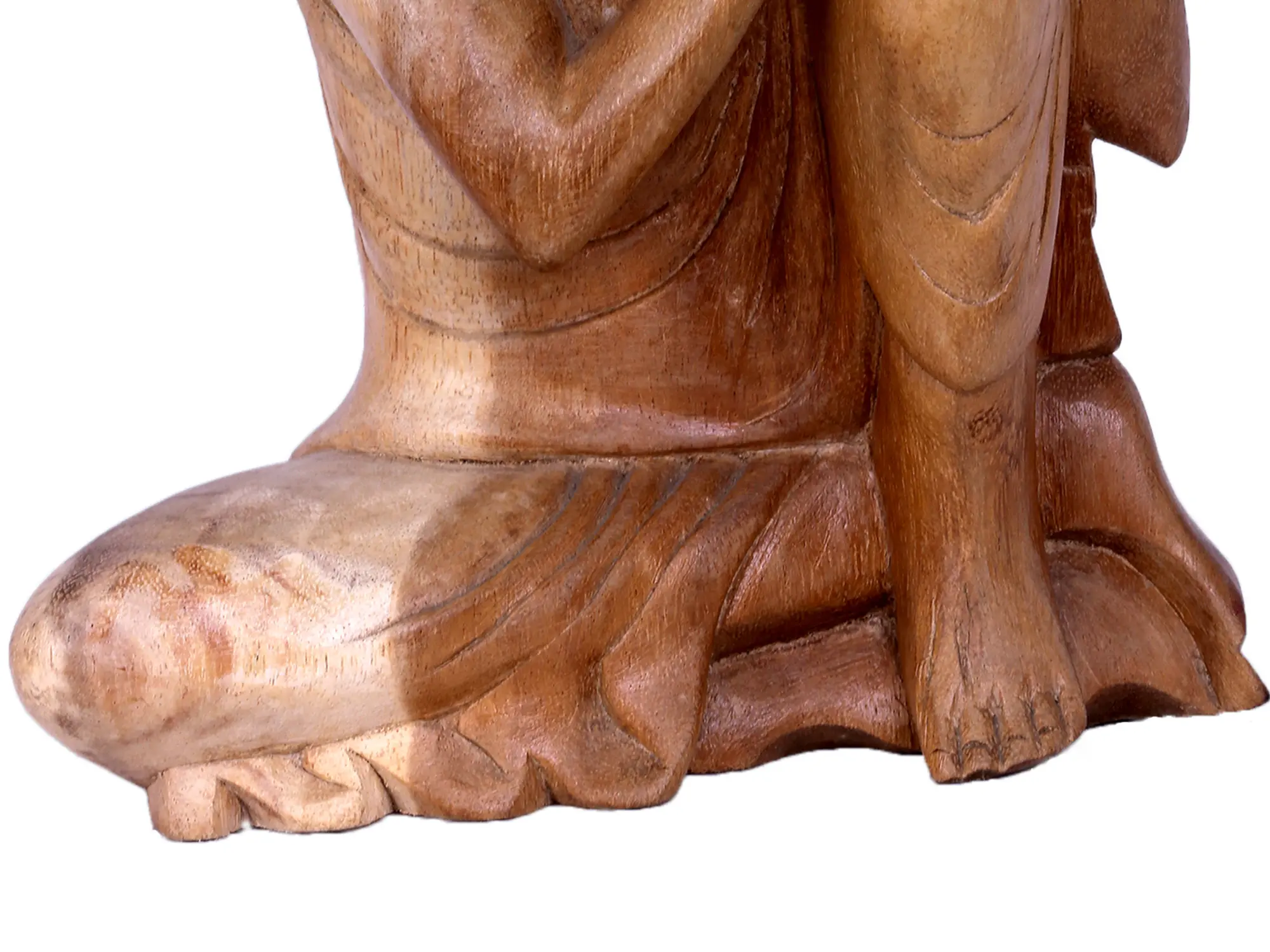 The image of a meditative Buddha is deeply rooted in Buddhist philosophy, representing Siddhartha Gautama's journey towards enlightenment. Legends speak of Buddha meditating under the Bodhi tree for days, confronting temptations and ultimately achieving Nirvana. This particular posture, with its relaxed yet focused demeanor, might evoke the moments of deep contemplation Buddha experienced as he pondered the nature of suffering and the path to liberation. Across various Buddhist traditions, the depiction of Buddha in repose symbolizes wisdom, compassion, and the ultimate goal of spiritual awakening. The subtle curvature of the robe, meticulously carved, adds to the lifelike quality of the sculpture, suggesting the gentle flow of fabric and the natural posture of a being at peace. The texture of the wood itself, with its visible grain, lends an organic warmth and grounding presence to the artwork. Each stroke of the chisel has brought forth not just a form, but a feeling, an essence of serene contemplation that resonates deeply.