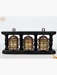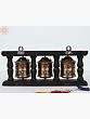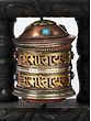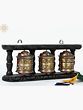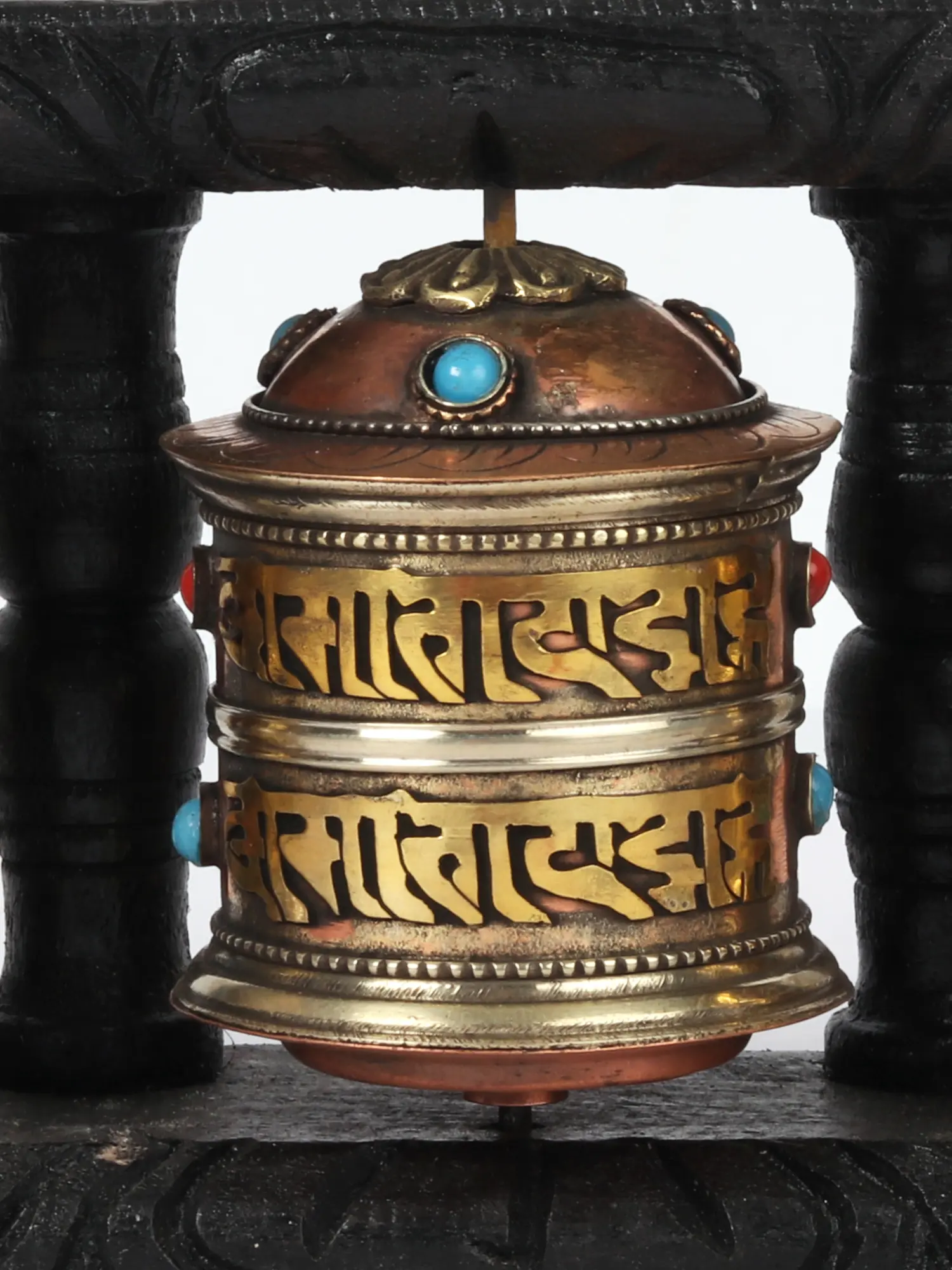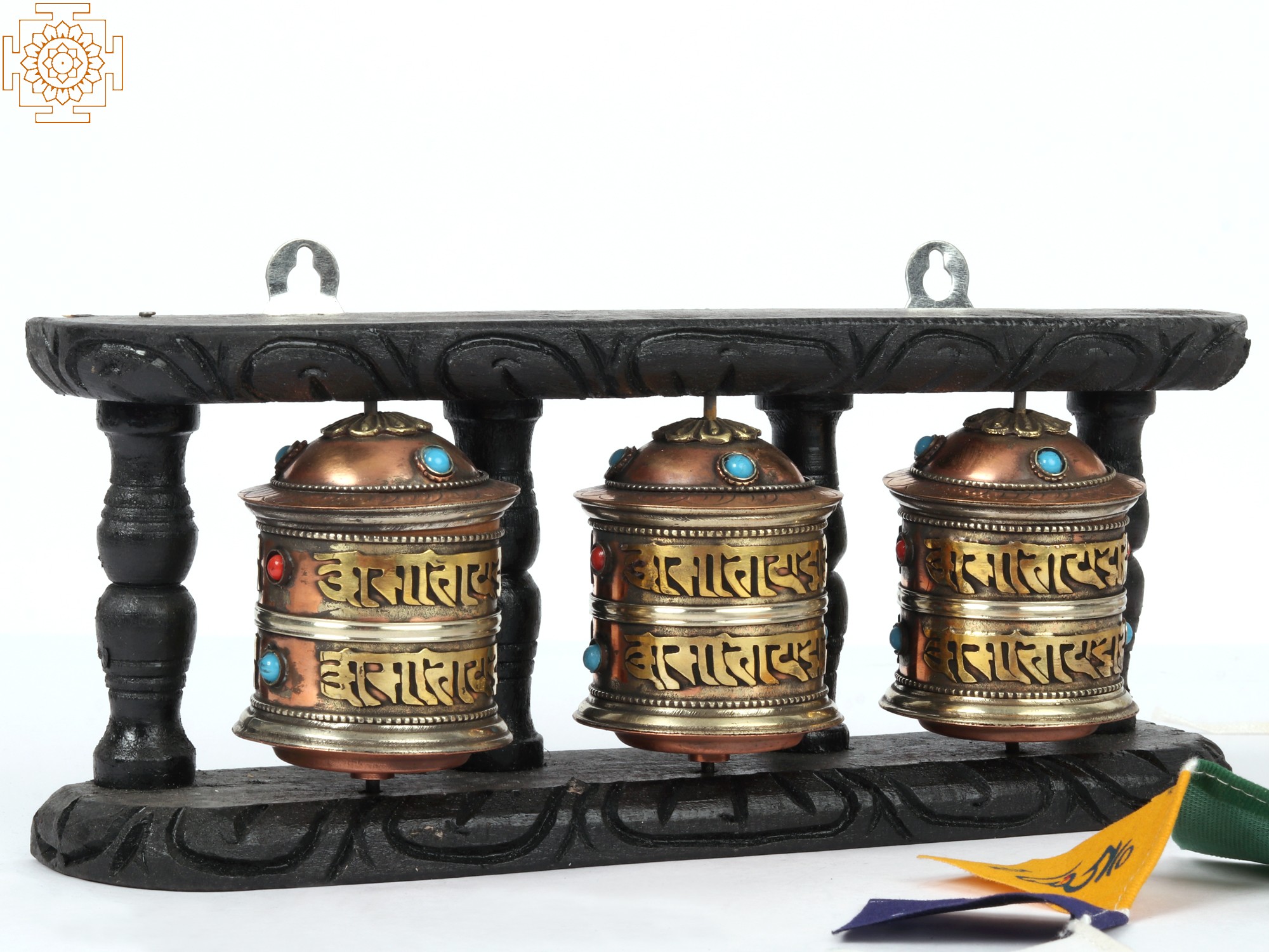 Prayer wheels are cylindrical objects able to rotate clockwise. They contain sacred prayers or invocations written on paper or skin put inside. It is believed that rotating the wheel with devotion will yield the blessings of Buddha. This Three Prayer Wheels on Stand with Stone Work is a sacred piece from Nepal. Skillfully crafted from copper and wood, it features exquisite stone embellishments. This wall-hanging display comprises three prayer wheels, symbolizing spiritual devotion and mindfulness. When spun, these wheels are believed to invoke positive energies and blessings. This ornate creation serves as both a religious tool and a decorative masterpiece, providing a tangible connection to Buddhist traditions and culture while adorning walls with its aesthetic beauty.