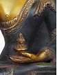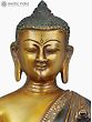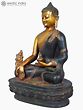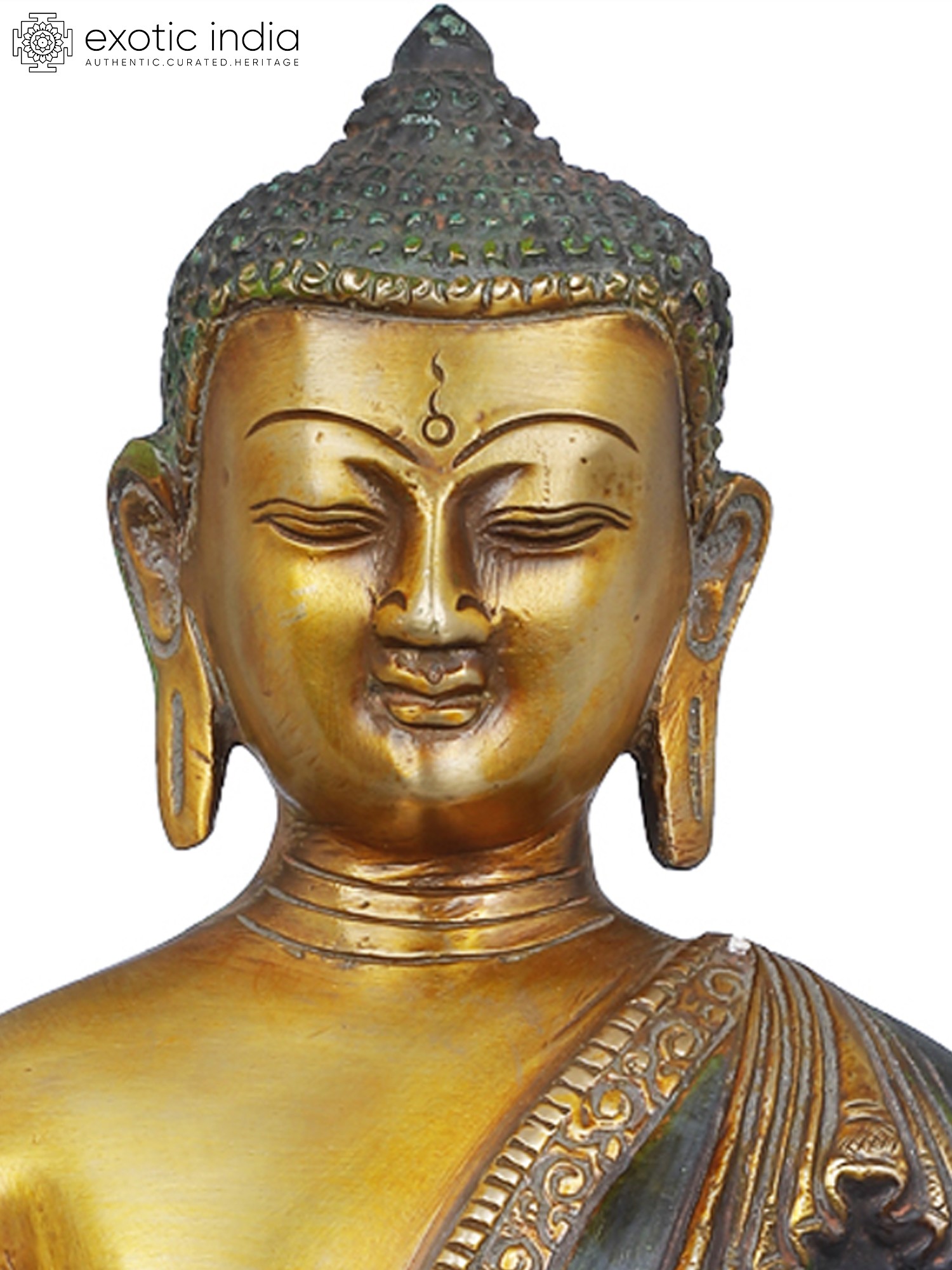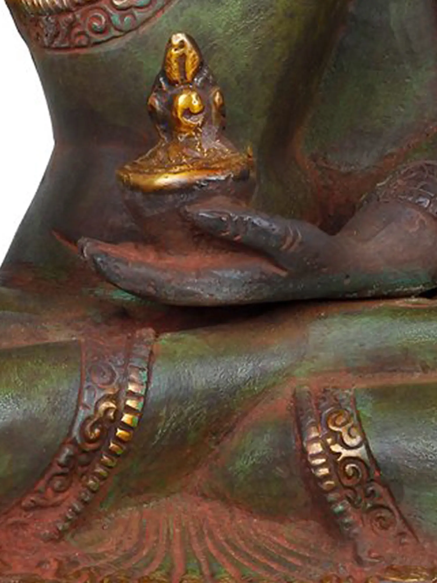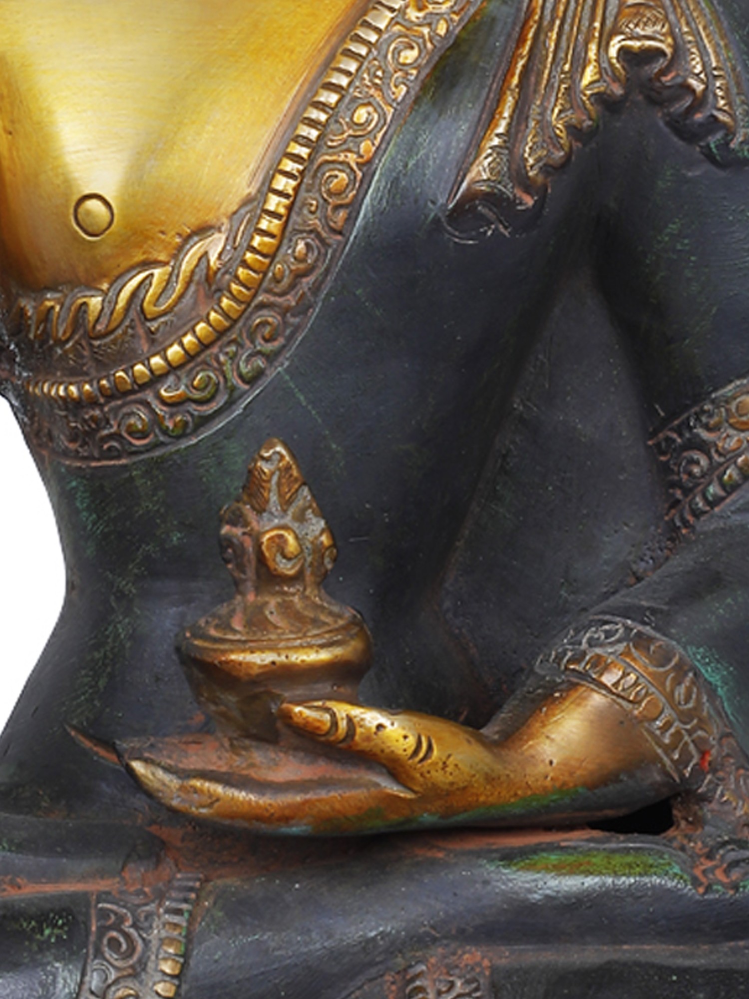 This exquisite brass idol depicts the revered Medicine Buddha, Bhaishajyaguru, a figure of immense spiritual significance in Tibetan Buddhism. Seated in the traditional lotus posture, the deity exudes an aura of profound peace and compassion. His serene face, with downcast eyes and a gentle smile, invites contemplation and solace. The intricate details of his monastic robes, adorned with exquisite patterns, speak of the artisan's mastery and devotion. In his left hand, resting in his lap, he holds a begging bowl, traditionally filled with medicinal herbs, symbolizing his role as the dispenser of healing and the alleviation of suffering. His right hand is extended, palm outwards, in the *vitarka mudra* (gesture of teaching and discussion) or the *varada mudra* (gesture of bestowing boons and blessings), signifying his infinite compassion and willingness to help all beings overcome physical and mental ailments.