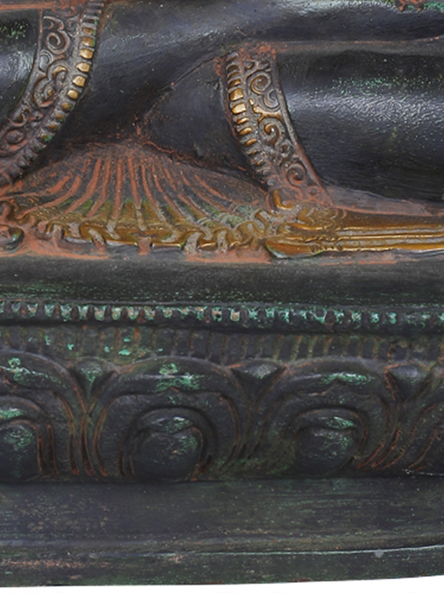 The Medicine Buddha is one of the most important figures in Mahayana Buddhism, particularly revered in Tibet. According to Buddhist scripture, he is a fully enlightened Buddha who taught the dharma and achieved complete enlightenment in the eastern Pure Land of Vaiduryaprabha ("Lapis Lazuli Radiance"). He vowed to heal all sentient beings from sickness and suffering, to guide them towards enlightenment, and to dispel the darkness of ignorance. His followers recite his mantra, *Om Bekanze Bekanze Maha Bekanze Radza Samudgate Soha*, seeking his grace for physical and mental well-being, and for the spiritual liberation of all. This brass idol serves as a powerful visual reminder of these vows and the boundless healing energy that the Medicine Buddha embodies.