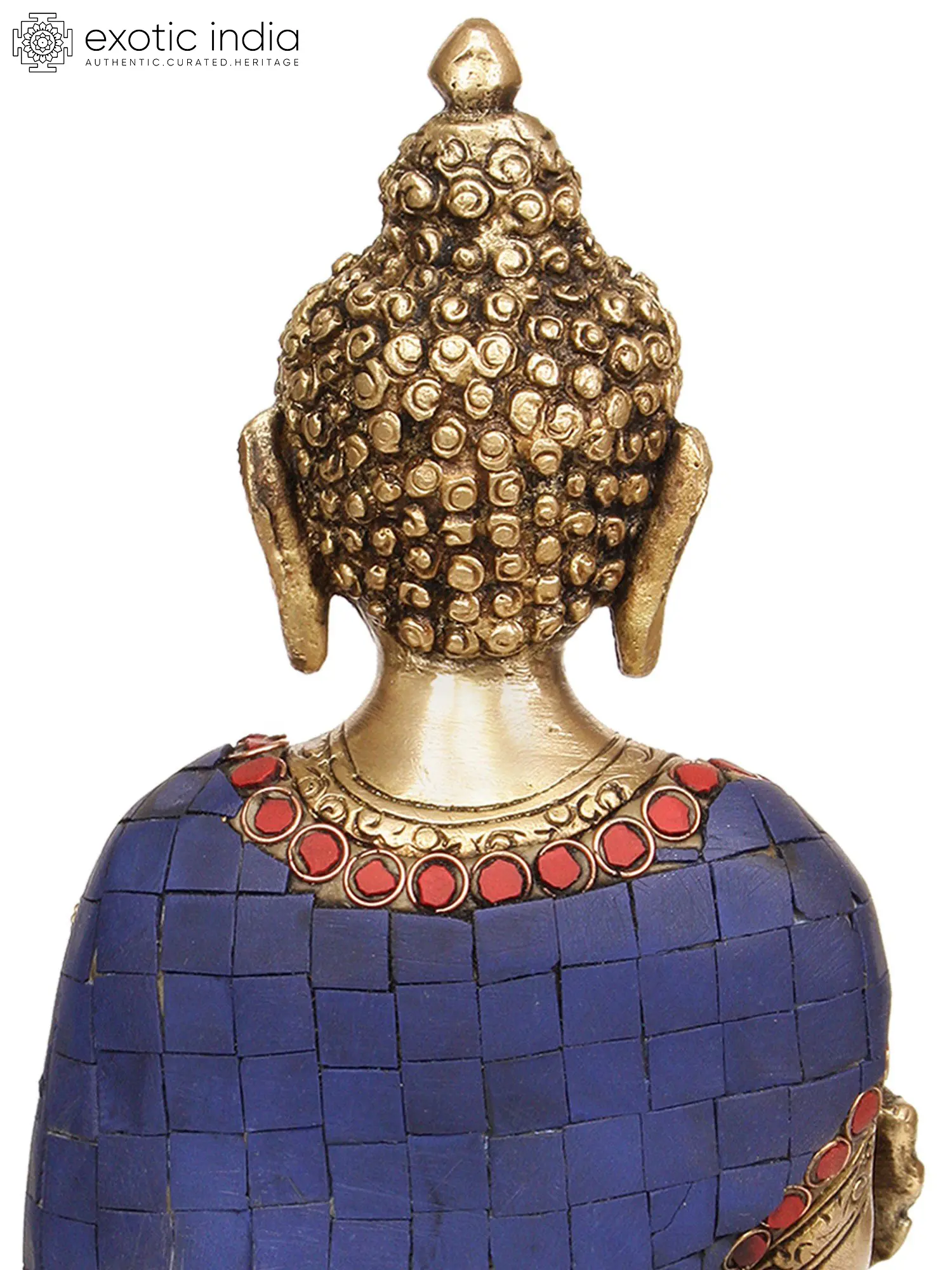 The statue is more than just a likeness; it is an artistic creation imbued with cultural significance. The brass construction lends a sense of solidity and timelessness, hinting at the enduring power of the Medicine Buddha's blessings. The intricate inlay work enhances the visual appeal, adding depth and texture to the statue. Each detail, from the folds of the robes to the elaborate base, reflects the skill and dedication of the artisans who brought this sacred image to life. Notice the details of the robe and the base; they have been carefully inlaid with stone. It showcases the skills that has been passed down for generations.