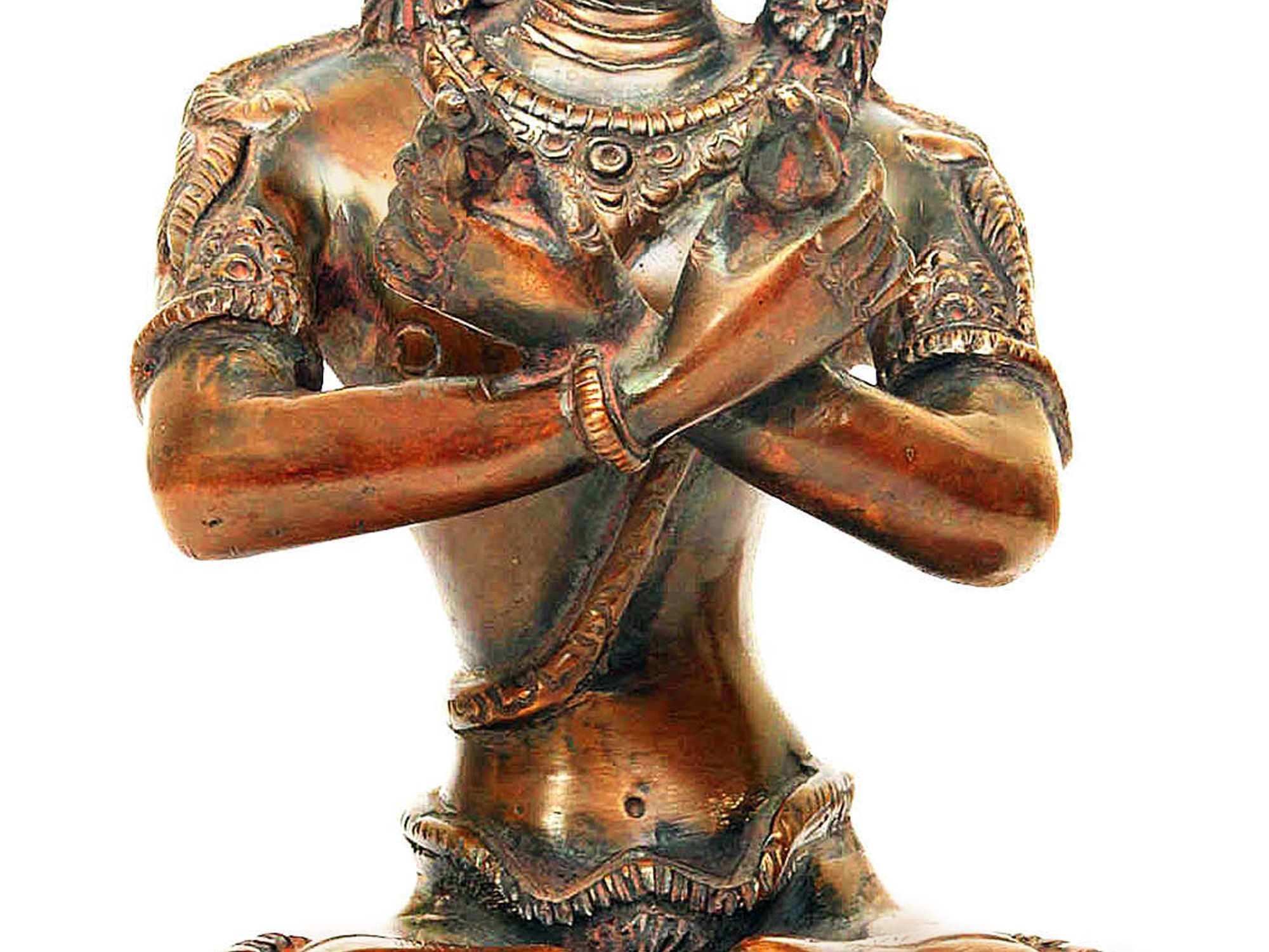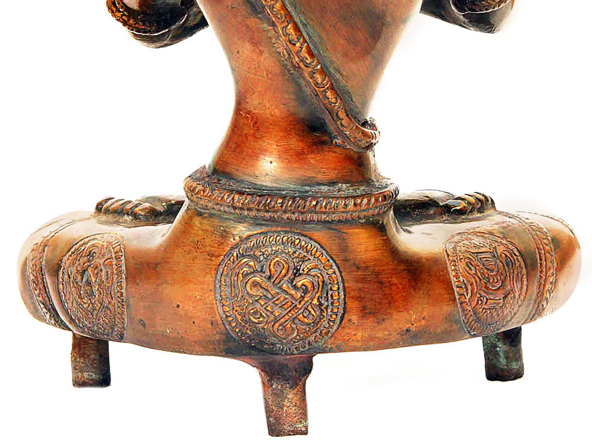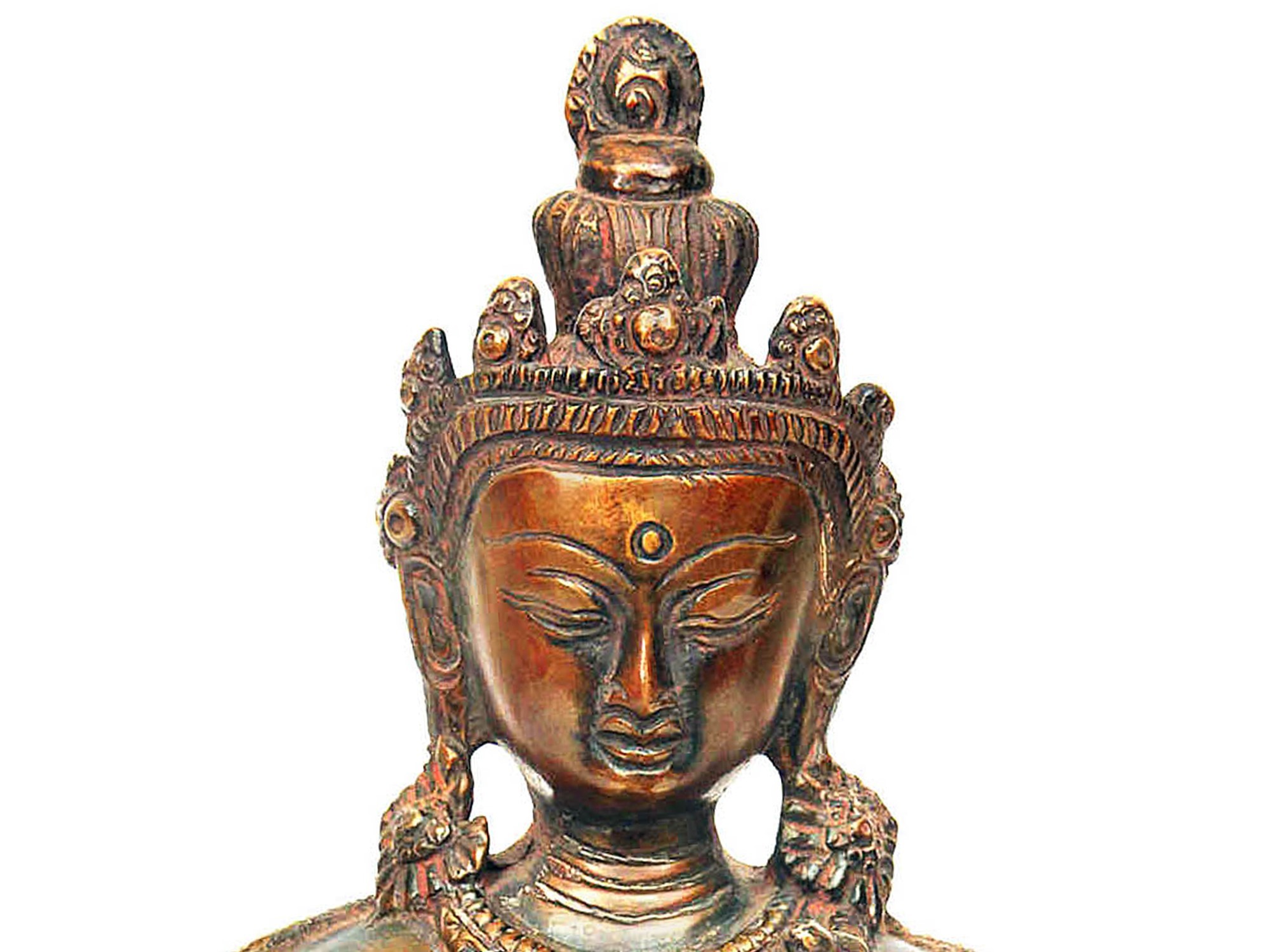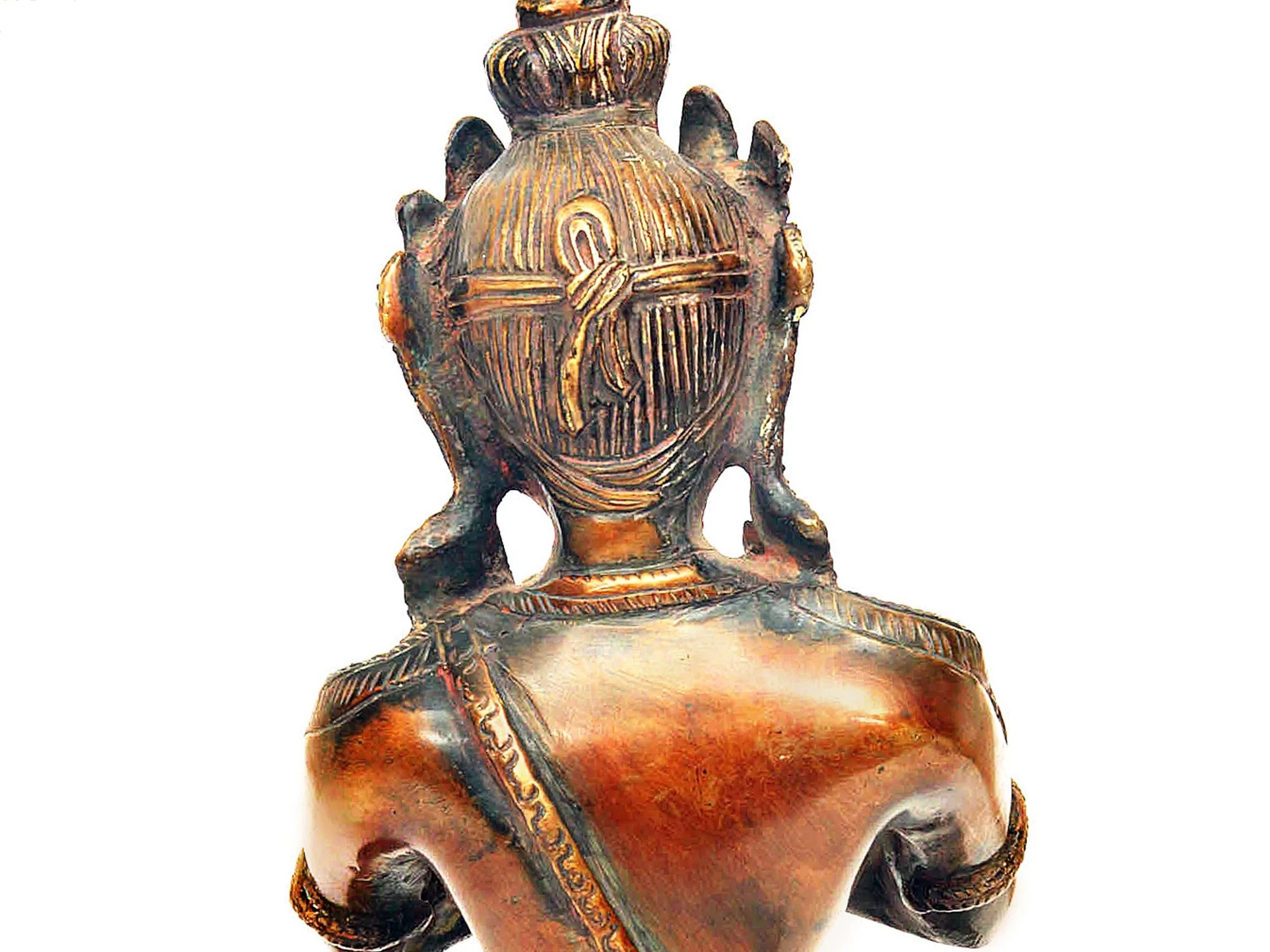 This statue embodies a significant aspect of Tibetan Buddhist art. The style, posture, and details are consistent with traditional representations of Vajradhara in Tibetan iconography. The use of brass casting techniques, passed down through generations of artisans, showcases the mastery of traditional Indian metalworking. This statue is not only a beautiful object but also a window into the rich cultural and religious traditions of Tibet and India, representing centuries of artistic expression and spiritual devotion. Owning this piece connects you to a rich lineage of artistry and spirituality, making it a true heirloom.