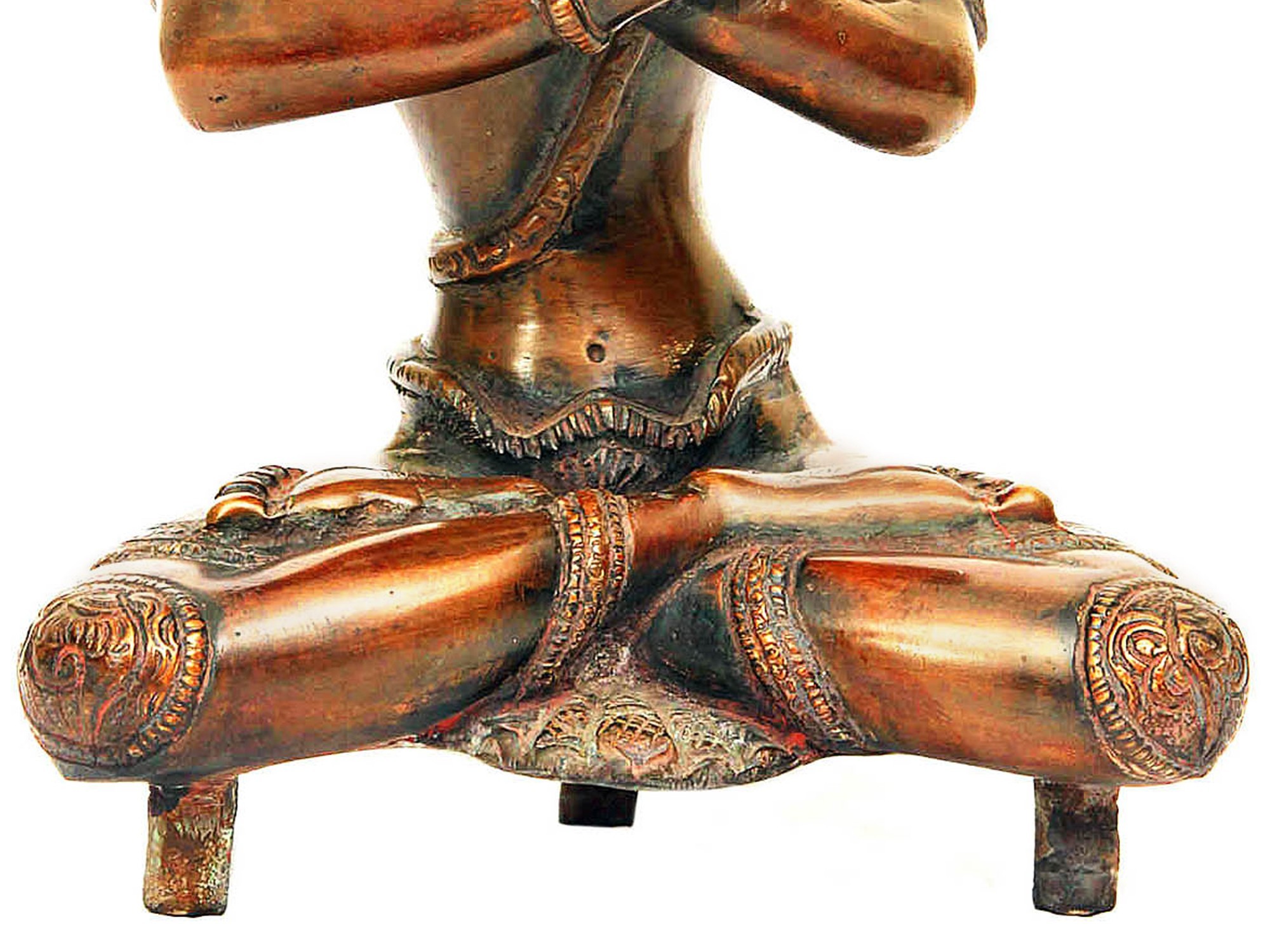 This Vajradhara statue is not merely a religious artifact; it is a work of art. The detailed craftsmanship is evident in every aspect, from the intricate carvings on his crown and garments to the subtle nuances of his facial expression. The use of brass, a metal associated with durability and stability, further enhances the statue's symbolic meaning. The subtle variations in the dark tones of the brass add depth and character, telling a story of time and devotion. Each individual detail is a testament to the skill and dedication of the artisan, creating a piece that transcends mere decoration and embodies spiritual essence.