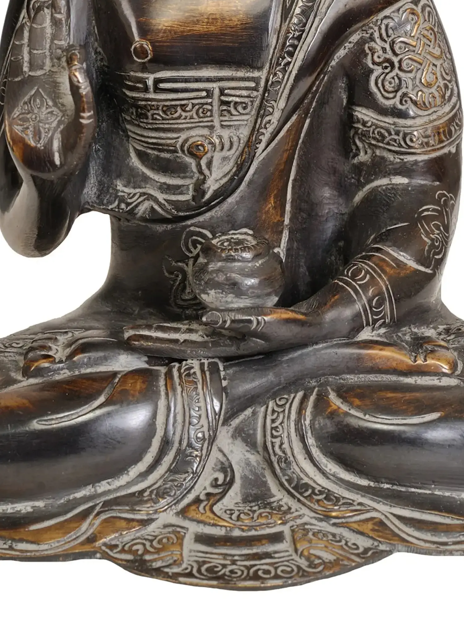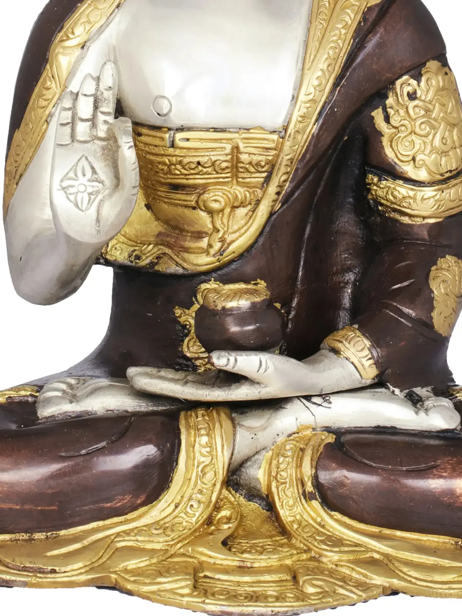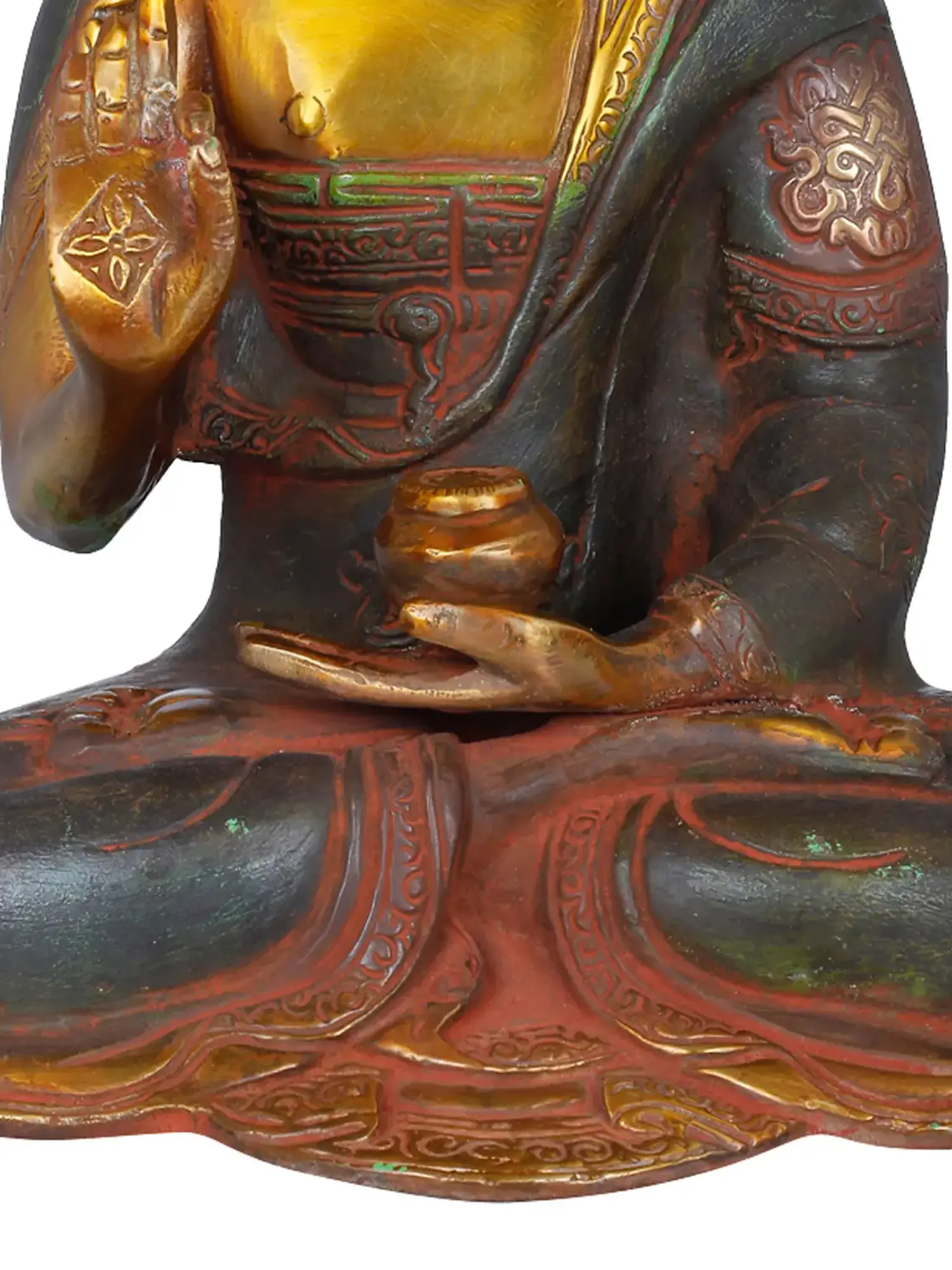 This exquisite brass statue captures the serene essence of the Buddha in a moment of profound teaching. The figure is seated in the classic lotus posture, symbolizing spiritual enlightenment and detachment from worldly desires. The right hand is raised in the Abhaya Mudra, a gesture of fearless protection and reassurance, banishing fear and bestowing peace upon the observer. The left hand rests in the lap, palm upwards, holding an alms bowl, representing the Buddha's renunciation of earthly possessions and his acceptance of sustenance to continue his spiritual journey. The detailed artistry, showcasing the delicate folds of his monastic robes and the serene expression on his face, speaks to the reverence and skill of the artisans who brought this piece to life in India.