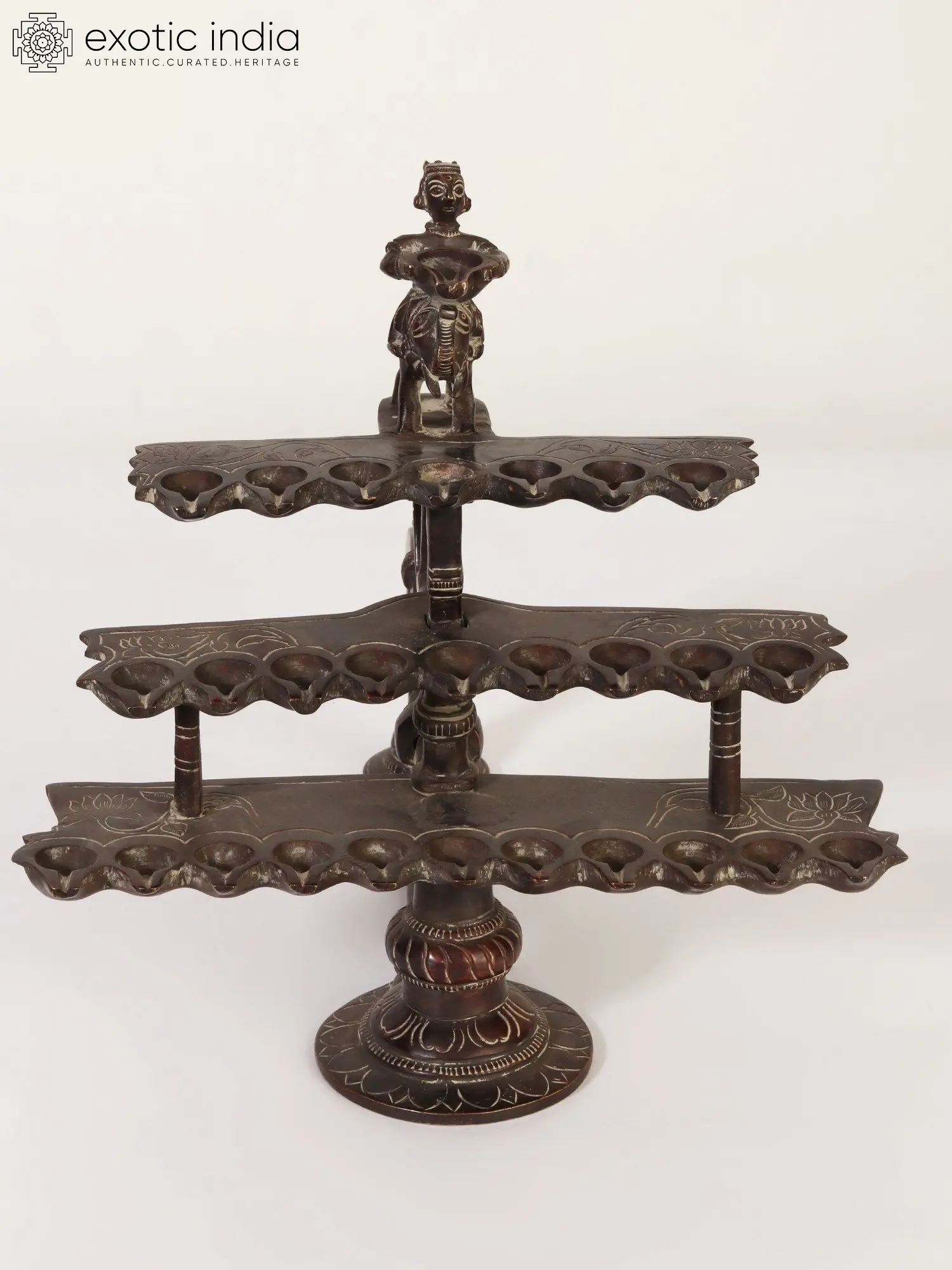 This exquisite brass diya stand is a testament to the enduring artistry and spiritual devotion found in traditional Indian craftsmanship. Designed to hold twenty-eight individual diyas, it serves as a powerful symbol of light, knowledge, and prosperity. The tiered structure, reminiscent of a blossoming lotus or the steps leading to divine enlightenment, creates a breathtaking display of illumination when all its wicks are aglow. Each level is adorned with intricate floral patterns, adding a touch of elegance and a connection to the natural world, often venerated in religious practices. The centerpiece of this magnificent piece is a finely detailed depiction of a ruler seated atop an elephant. In Indian mythology, the elephant, particularly Airavata, the white elephant of Lord Indra, is a symbol of strength, royalty, and divine power. The rider, perhaps representing a king or a devotee on a pilgrimage, signifies the journey of life, guided by faith and aspiration. This motif adds a narrative layer to the diya stand, evoking stories of ancient kingdoms and the profound relationship between rulers and their spiritual beliefs. Crafted from lustrous brass, this diya stand possesses a timeless appeal. Brass, known for its durability and ability to hold intricate details, has been used for centuries in the creation of religious artifacts and decorative objects in India. The warm, golden hue of the brass enhances the spiritual ambiance, making it a perfect addition to any altar, puja room, or sacred space. The design is not merely functional; it is a piece of art that elevates the ritualistic experience, transforming simple acts of worship into moments of profound beauty and connection. The very act of lighting diyas is deeply embedded in Indian culture, symbolizing the victory of light over darkness, good over evil, and knowledge over ignorance. From the auspicious festival of Diwali, the festival of lights, to daily prayers and rituals, the diya plays a central role. This multi-wick diya stand amplifies this symbolism, offering a cascade of light that can fill a space with a divine aura, inviting blessings and dispelling negativity. Its substantial presence and intricate detailing make it a statement piece, capable of becoming a cherished heirloom passed down through generations, carrying with it stories and spiritual significance. –––––––––––––––––––