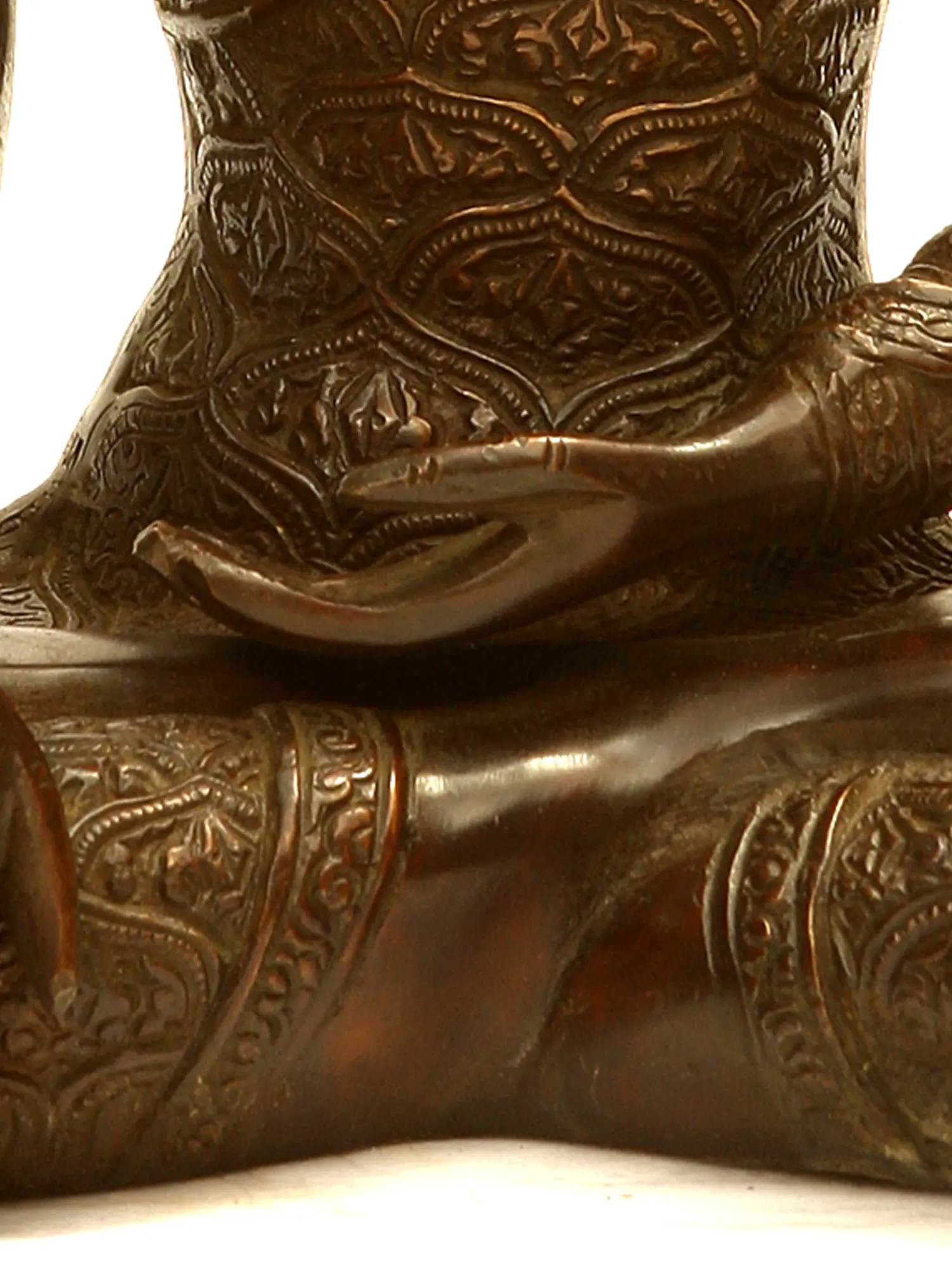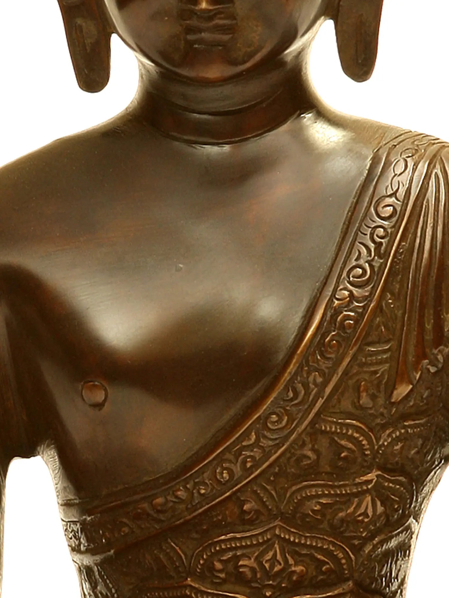 Handmade in India, this brass sculpture is a testament to the rich artistic traditions and devotional practices that have flourished on the subcontinent for centuries. The skilled artisans have meticulously crafted each detail, from the serene facial features to the complex patterns adorning the robes, using traditional techniques passed down through generations. The warm, lustrous finish of the brass enhances the divine aura of the Buddha, making it a truly captivating piece. Owning this sculpture is not just acquiring an object of beauty, but connecting with a lineage of craftsmanship that has served to bring spiritual iconography to life for countless devotees. Its presence can transform any space into a sanctuary of peace and reflection, evoking the profound wisdom and compassion of the Awakened One.