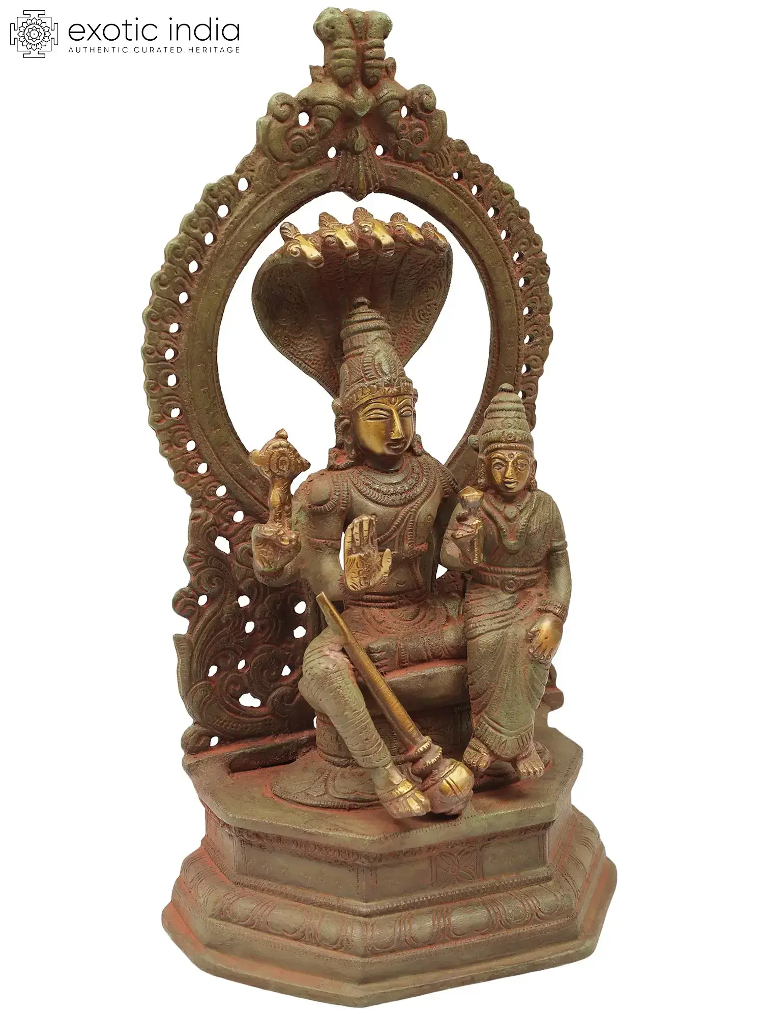 The majestic depiction of Vishnu and Lakshmi within a grand Prabhavali, intricately crafted in brass, symbolises divinity and auspiciousness. Handmade in India, this sculpture portrays Vishnu and Lakshmi within a resplendent arch, radiating grace and abundance. The intricacies of this artwork invite contemplation on the divine union of Vishnu and Lakshmi, inviting blessings of prosperity and grace into the environment it graces. The detailed craftsmanship encourages viewers to ponder the divine harmony and the confluence of male and female energies, fostering an ambiance of divine blessings and prosperity.