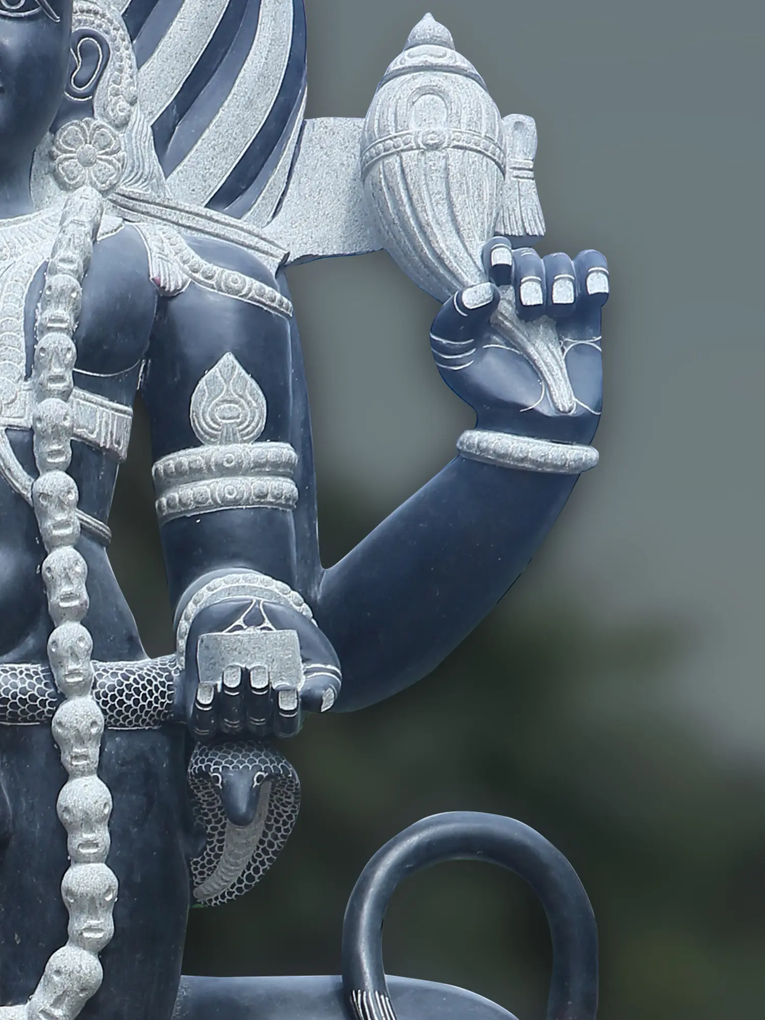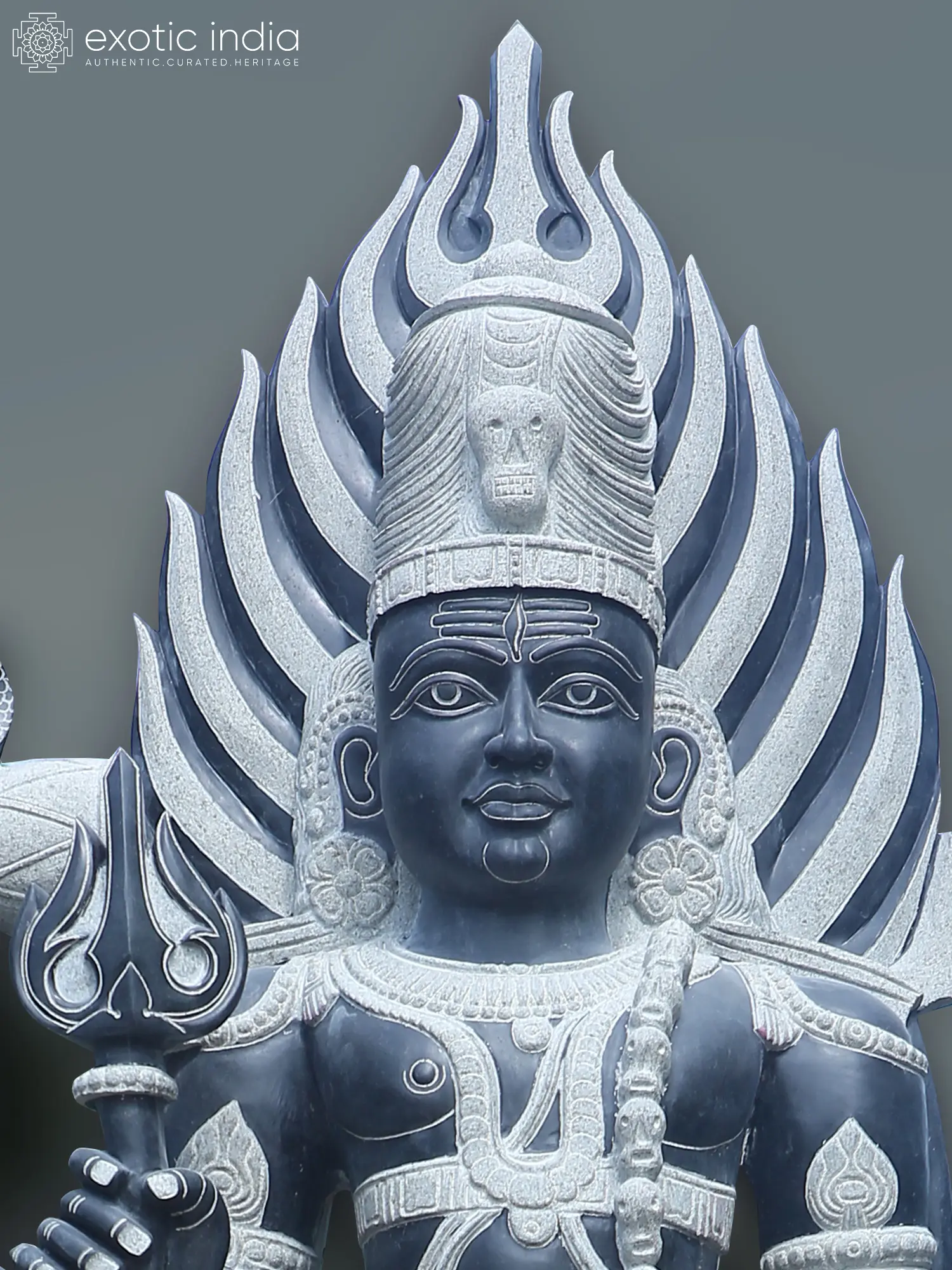 The fierceness of Bhairava is fused with the calmness of Shiva in this most magnificent 8-foot large sculpture of the Hindu god, made in granite but brimming with a flow of divine life.