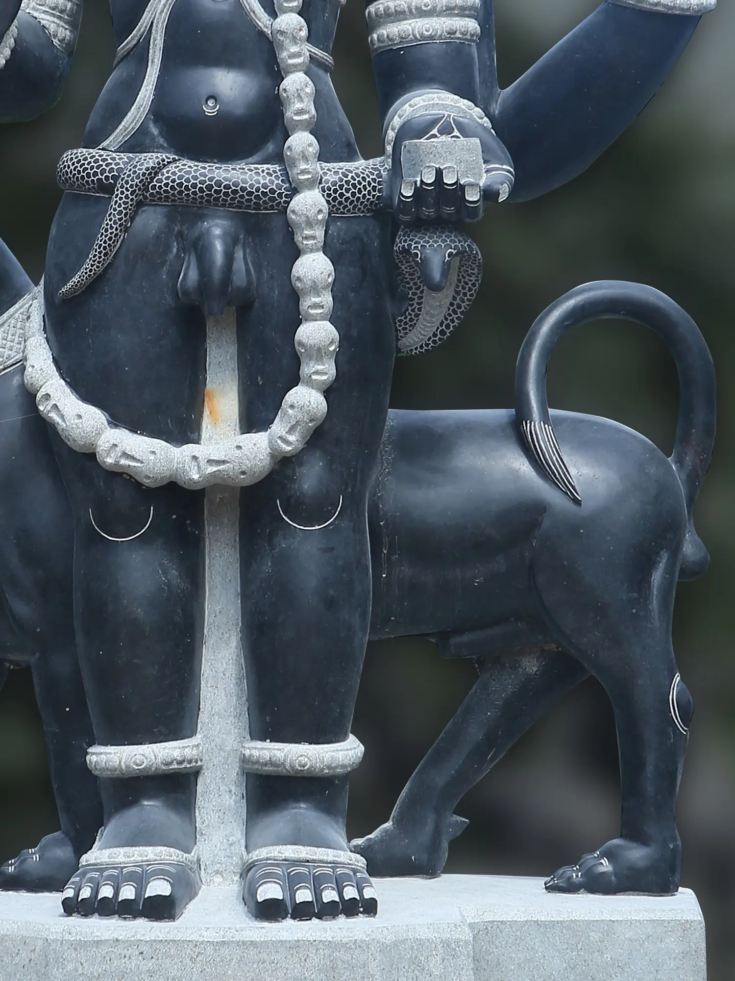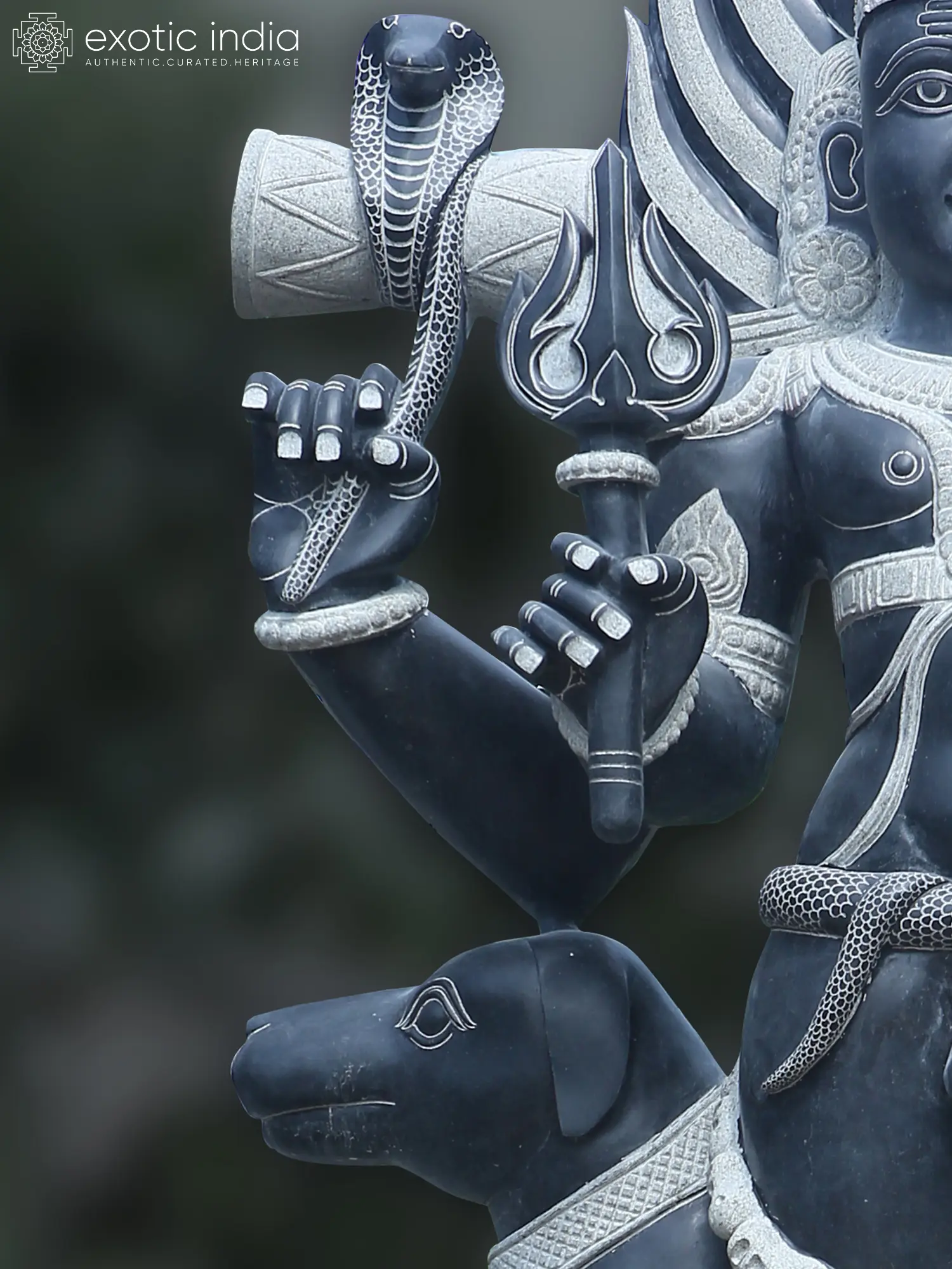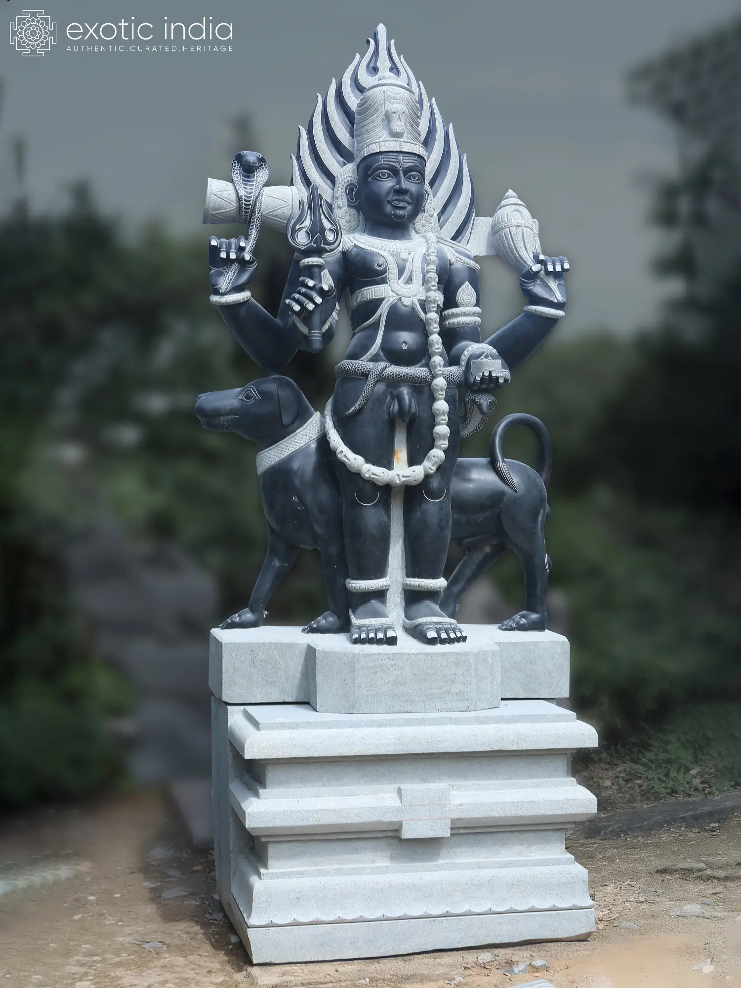 His Jatamukuta is embellished with a skull, symbolizing the ultimate truth of life- its momentariness. Bhairava is accompanied by a black dog, his mount and trusted companion, also a manifestation of his powers.