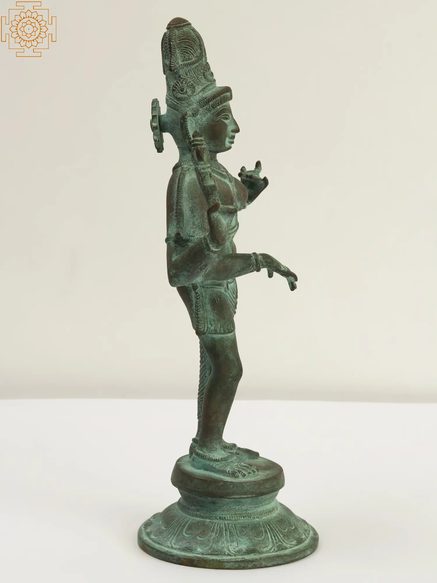 This 11.25 x 5.0 x 4.0 inch brass statue is a testament to the exceptional skill and artistry of traditional Indian craftsmanship. The meticulous detail in the sculpting is evident in every curve, every fold of the garment, and every expression on the face. The rich, greenish-bronze patina adds a layer of antiquity and depth, enhancing the statue's inherent beauty and spiritual significance. Each piece is skillfully handcrafted using traditional lost-wax casting techniques, a process passed down through generations of artisans. This ancient technique produces intricate details and a unique character which varies slightly from statue to statue, showcasing the personal touch of the artisan. Notice the subtle shading and variation in the green tones, adding complexity and depth to the already intricate design. The piece is further enhanced by a thoughtfully designed base, completing the elegant stature of Ardhanarishvara.