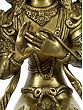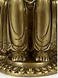 Maitreya (Tib. Jampa) here sits in a relaxed yet alert posture, wearing a five-crested crown. His hands make the gesture of preaching and his eyes are cast downwards as if in introspection. This typical manner of Maitreya seated on a throne with legs pendant is known in Sanskrit as 'bhadrasana' (auspicious posture) or pralamba-pad-asana (extended legs posture).