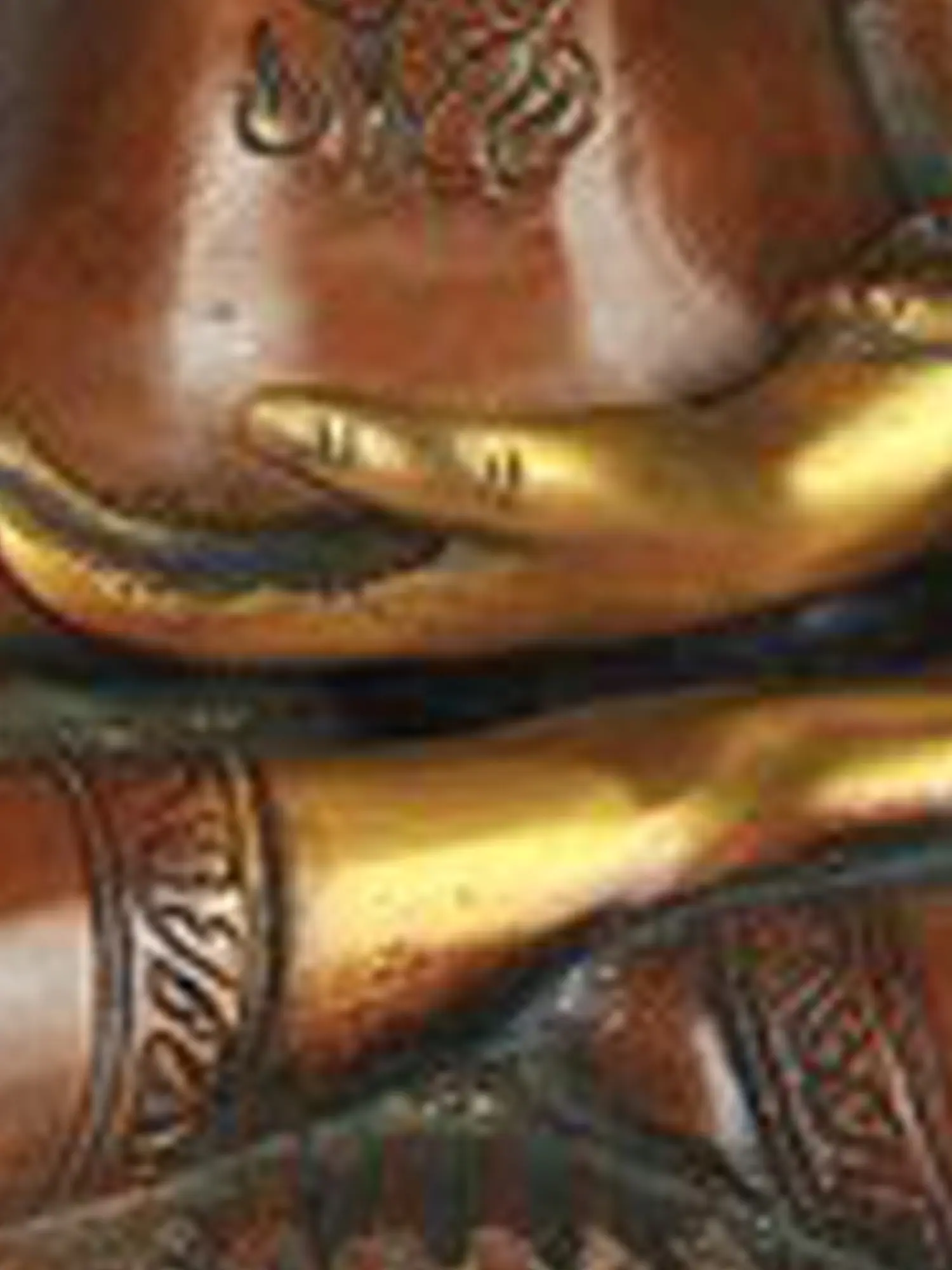 This exquisite brass sculpture captures the serene visage of the Buddha, seated in a posture of profound meditation and gentle blessing. Crafted by skilled artisans in India, this piece is more than just a decorative object; it is a tangible representation of peace, wisdom, and spiritual awakening. The rich, warm tones of the brass, combined with a subtly antiqued finish, lend the sculpture an aura of timeless elegance and spiritual depth. The Buddha's hands are positioned with intention. The left hand rests palm-up in his lap, signifying meditation and receiving wisdom. His right hand is raised, palm facing outward in the Abhaya Mudra, a gesture of fearlessness and protection. This mudra symbolizes the Buddha's assurance to his followers, dispelling fear and offering comfort. It is said that when the Buddha displayed this mudra, a fierce elephant, Mara's attacking beast, was pacified and bowed before him, illustrating its powerful spiritual resonance.