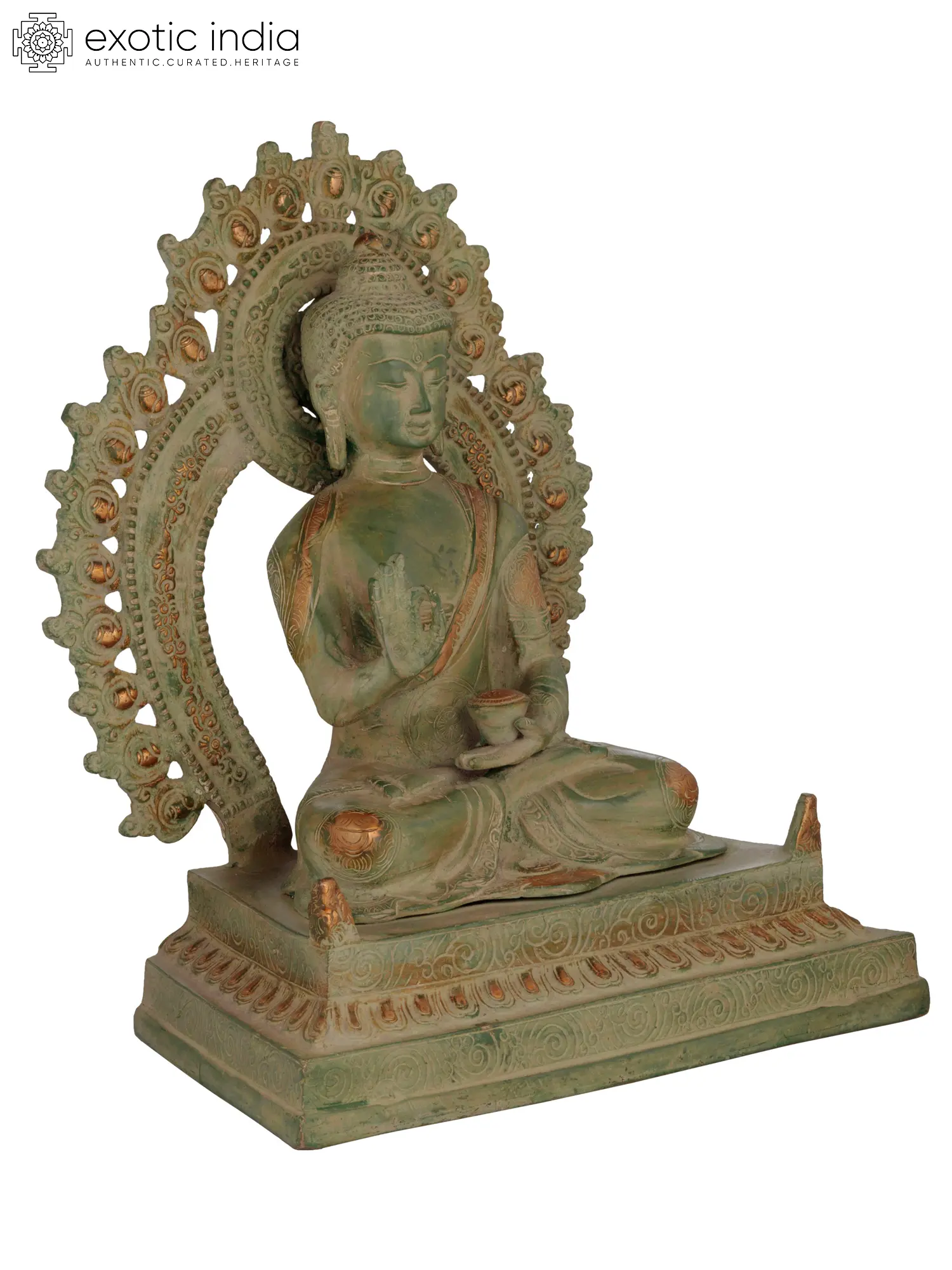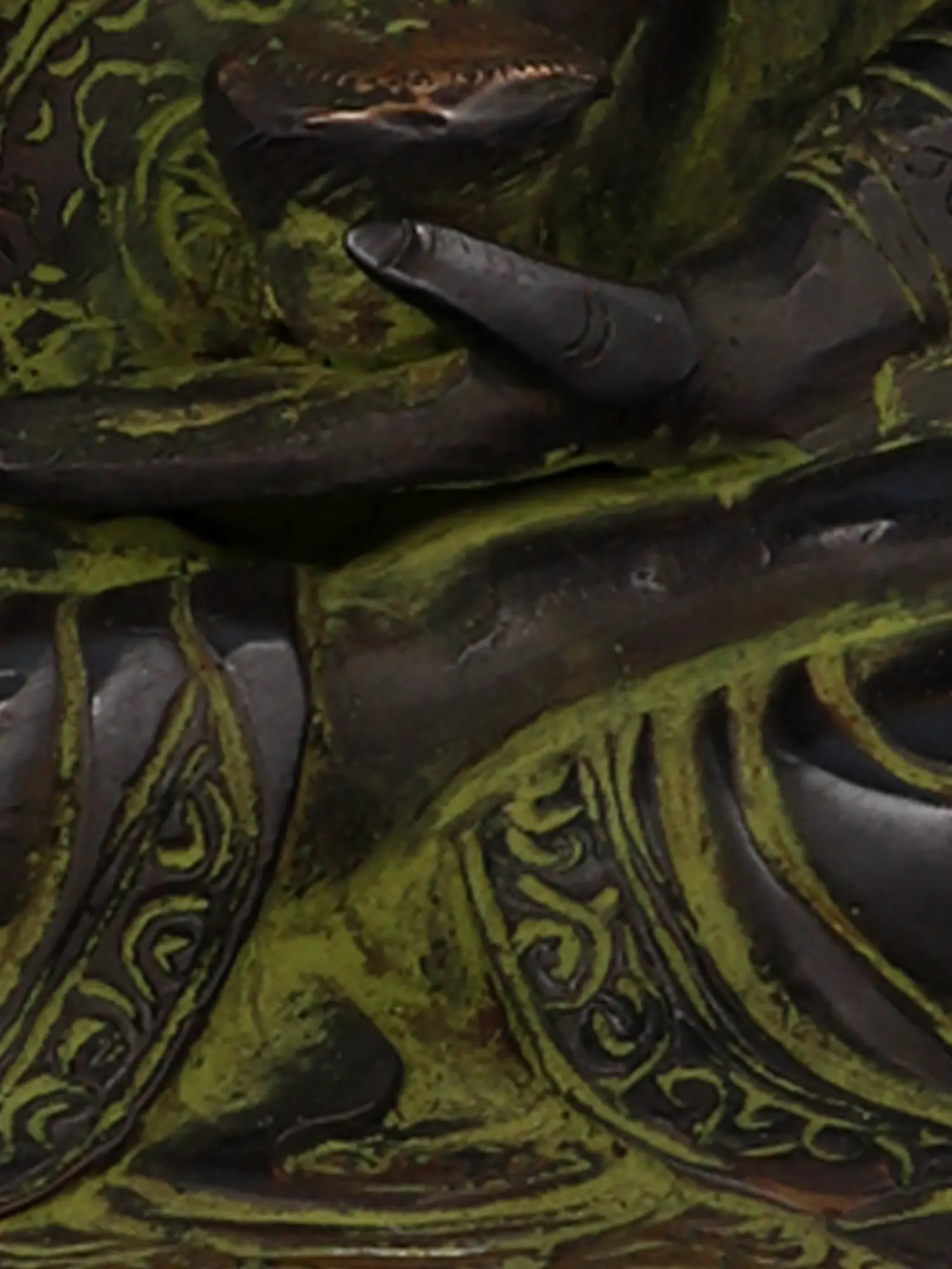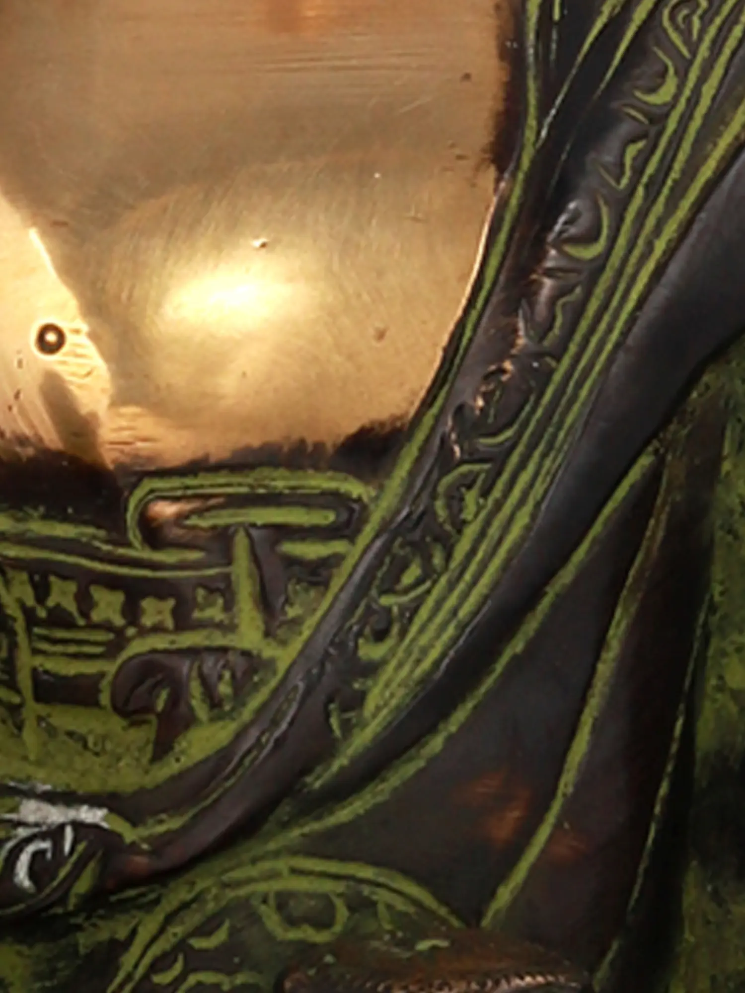 The intricate halo behind the Buddha, adorned with a pattern reminiscent of a radiant sunburst or the petals of a lotus, symbolizes enlightenment and the boundless nature of his teachings. The deep green patina applied to parts of the statue, particularly the halo and the robes, evokes a sense of age and sacredness, suggesting that this image has been blessed by time and devotion. This coloring also alludes to the natural world, a theme central to Buddhist philosophy, where harmony with nature is a path to inner peace. The detailed carvings on the throne and the base further enhance the regal and divine aura of the deity, suggesting his elevated status as the Awakened One. ––––––––––––––––––