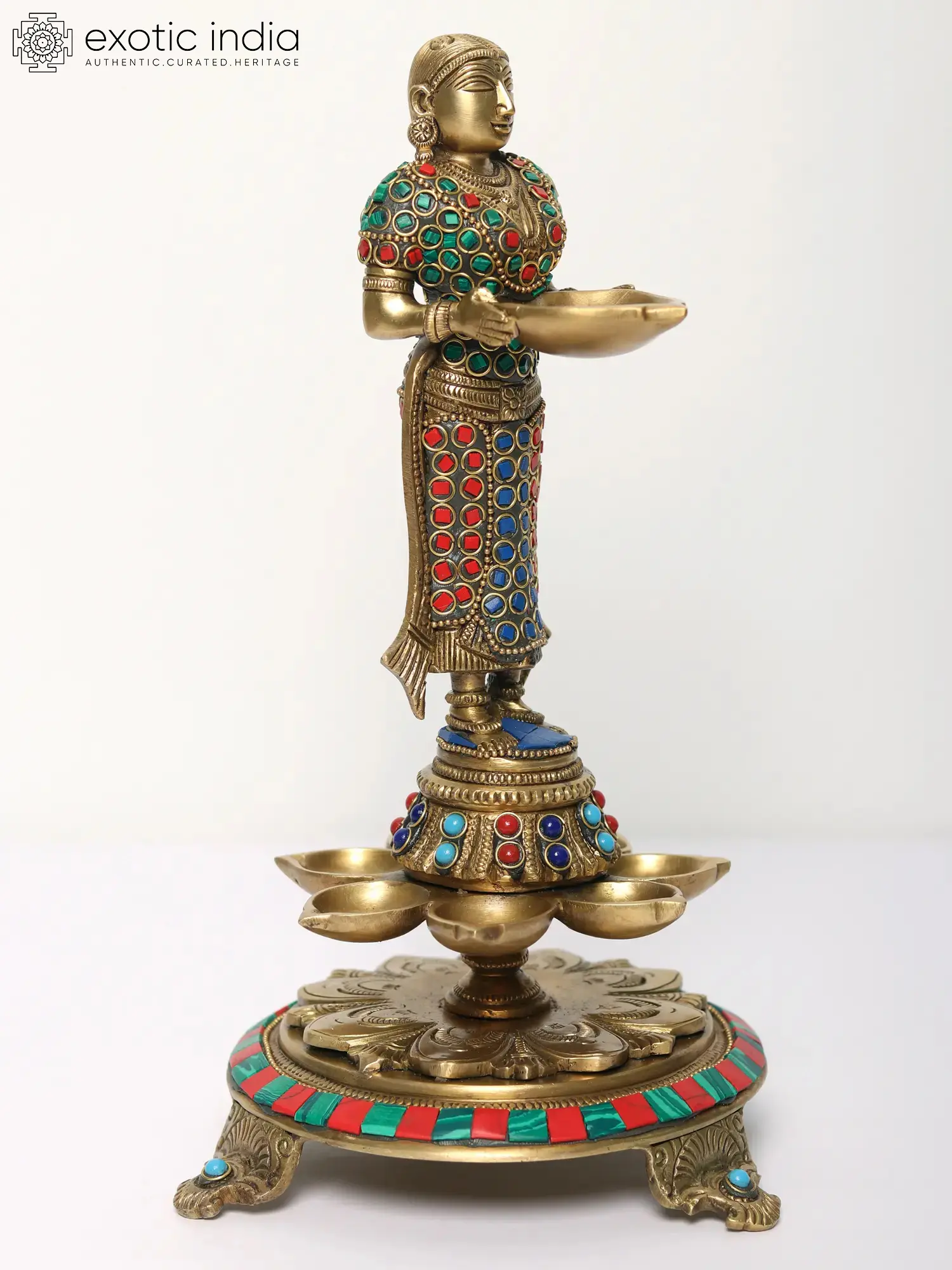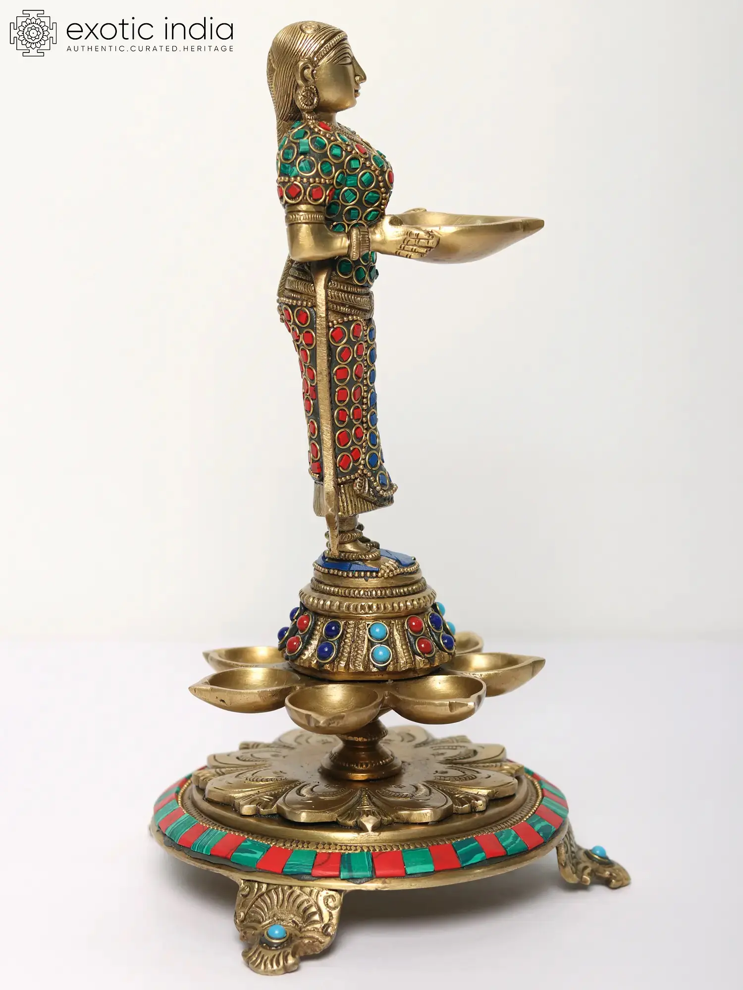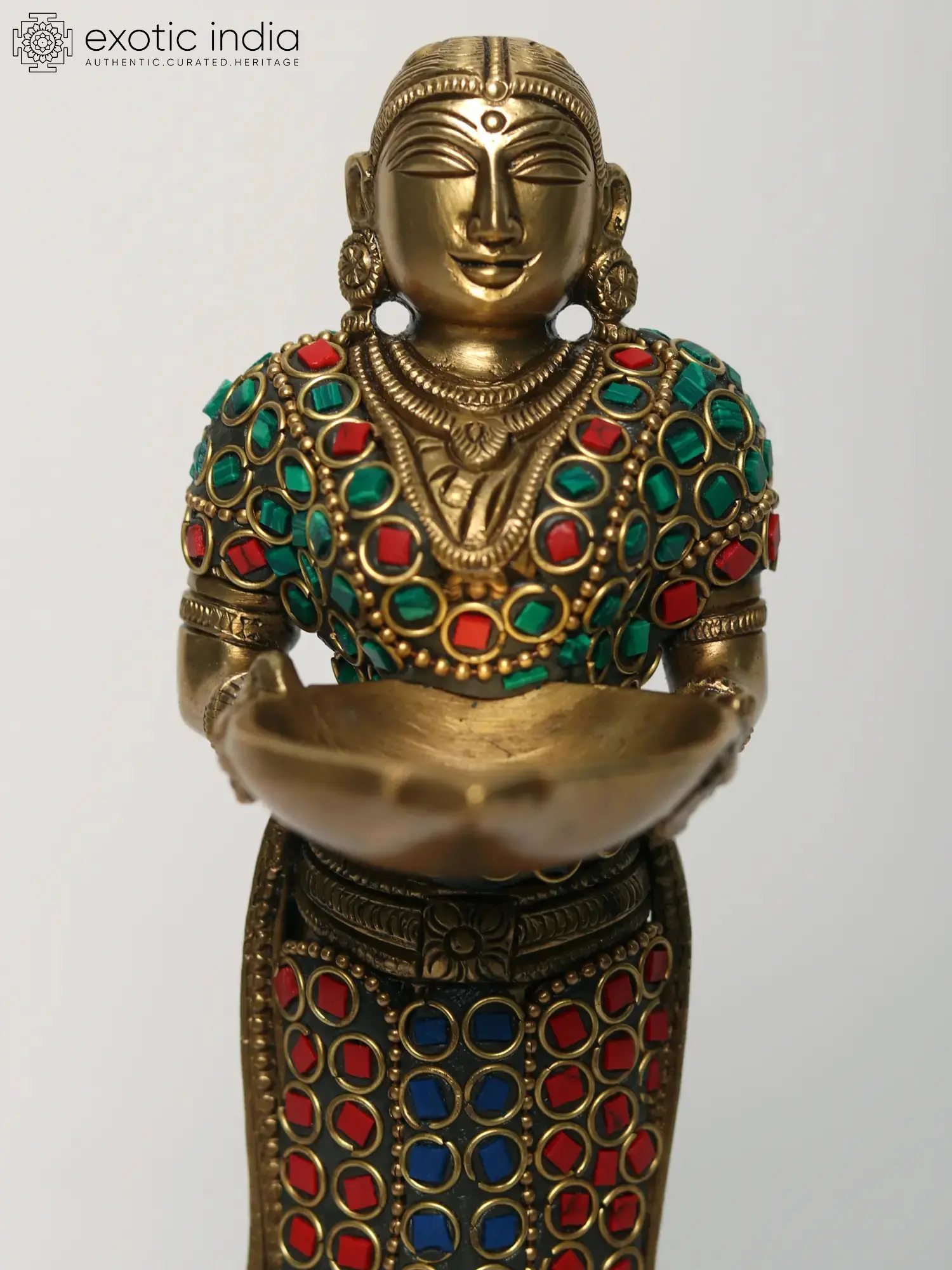 India has a large number of households that are illuminated by a lamp when night falls. Deepa Lakshmi is the name of a traditional Indian lamp that is designed like a lady holding a lamp. The lamp's light is considered to drive away darkness or unholiness. The amazing inlay work on this Deepa Lakshmi has flawlessly beautified the basic brass simple lamp in the same form. Because of the accuracy with which it was made, each inlay work dot on the lamp stands out.