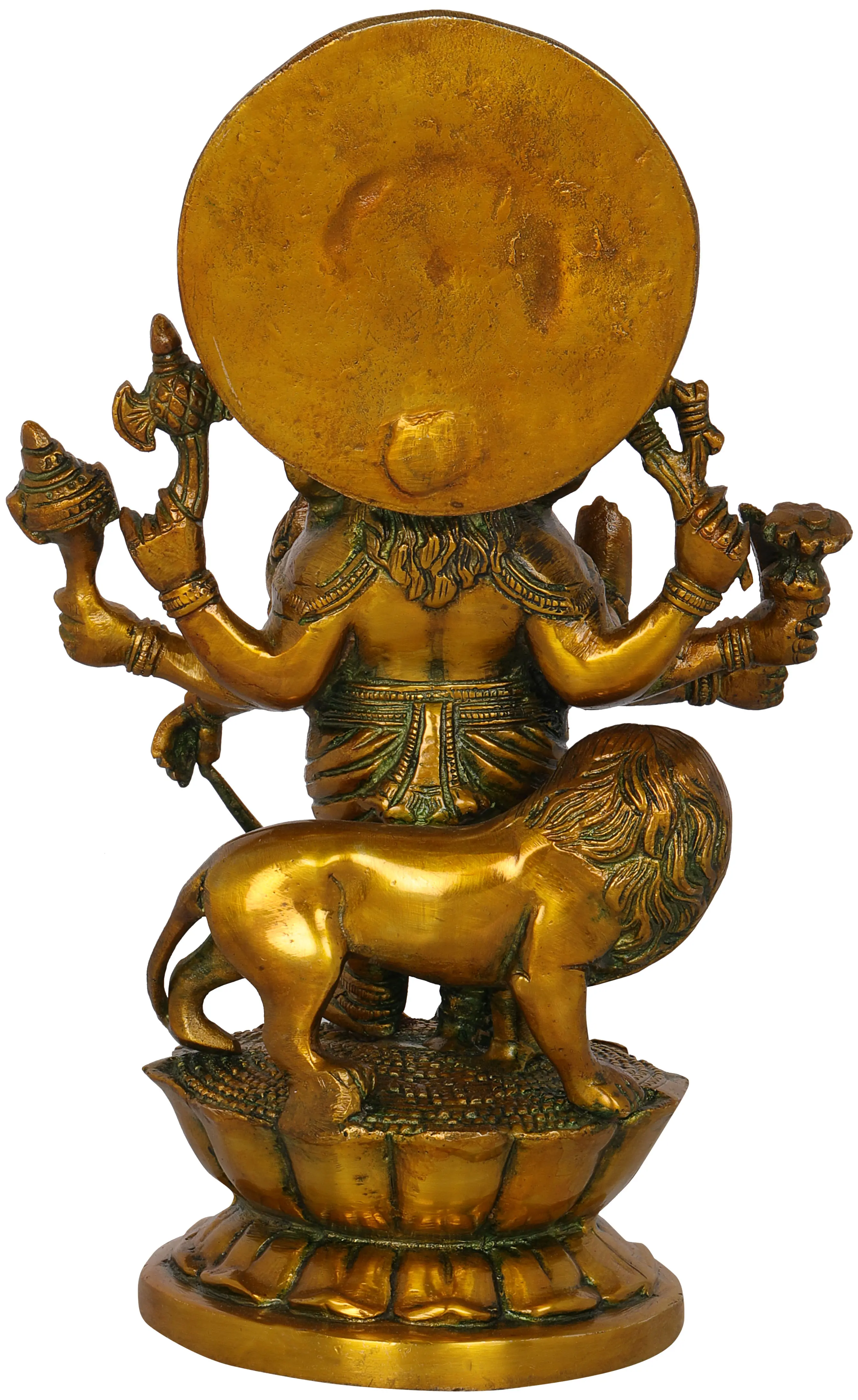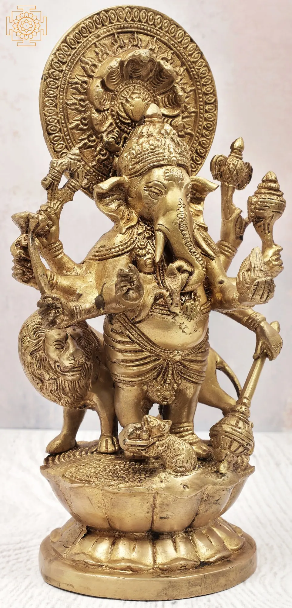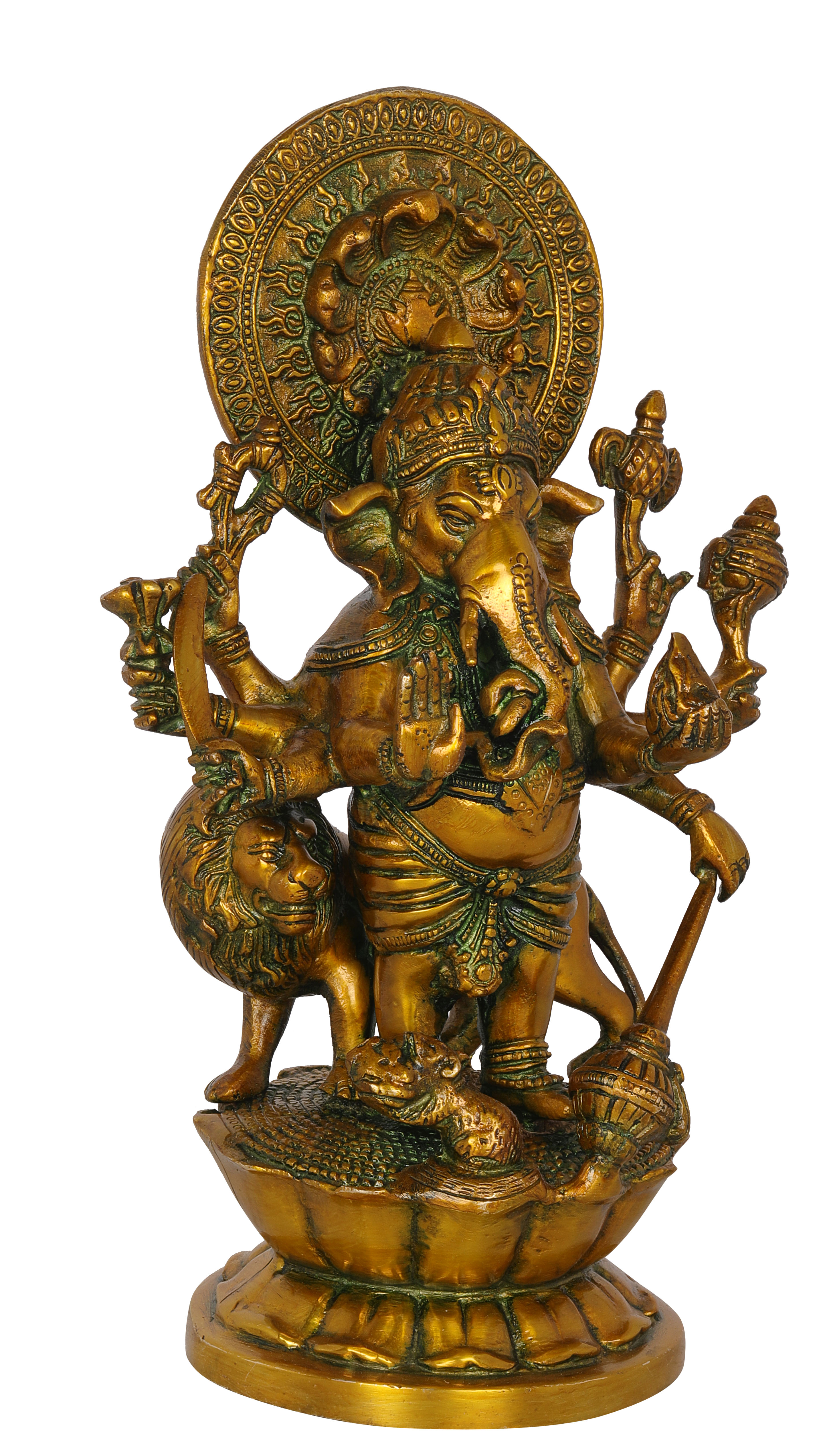 11" Brass Eight Armed Ganesha Idol with Lion and Snake Aureole | Handmade | Made in India