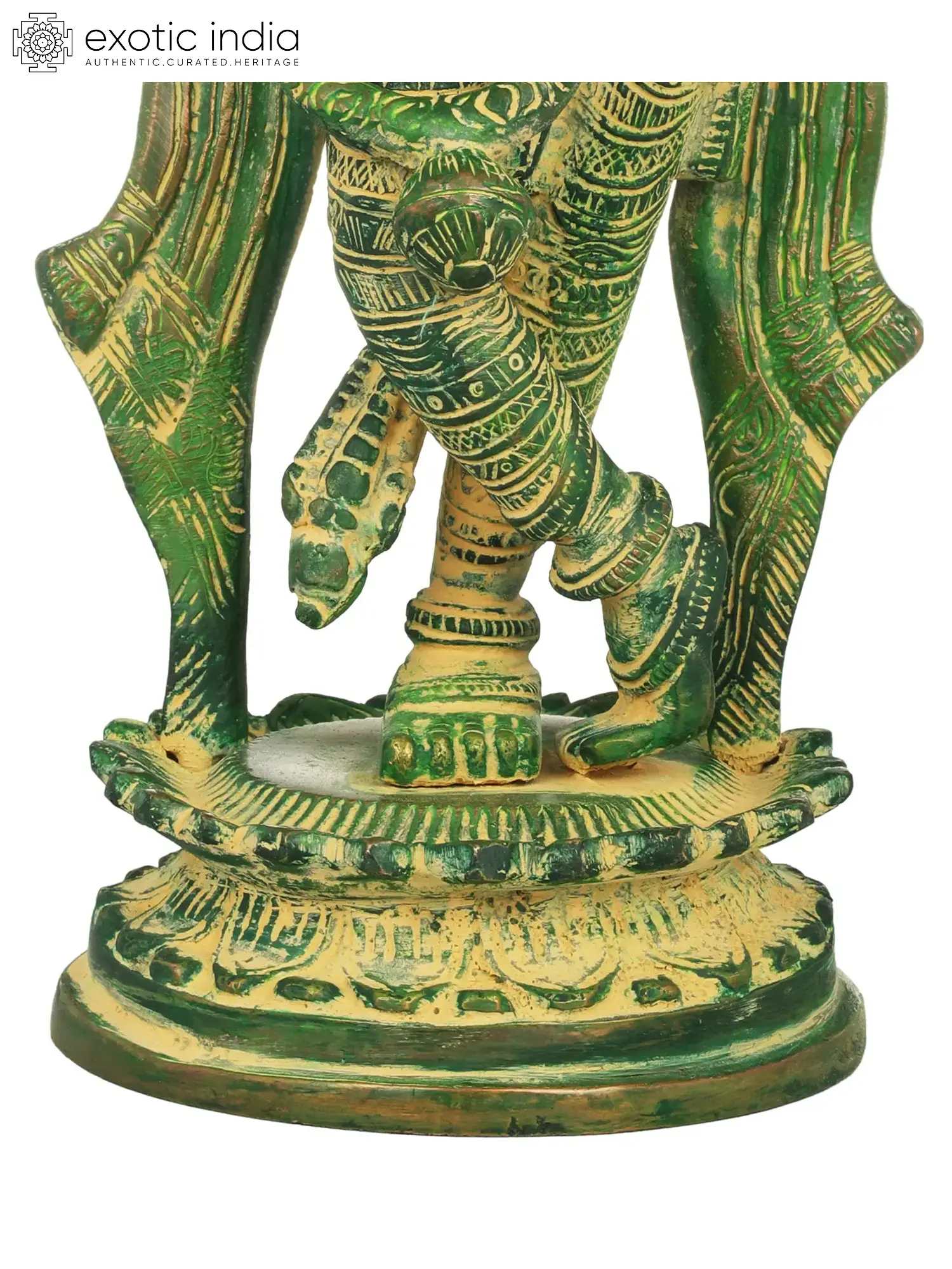 Let the enchanting tunes of Krishna's flute resonate in your home with this beautifully crafted brass statue. In Indian philosophy, Lord Krishna's divine music represents the call of the eternal soul, awakening our spiritual consciousness. This handmade piece is not only an exquisite work of art but also a profound reminder of our connection to the divine. Place it in your living space or meditation corner to invite tranquillity and spiritual harmony.