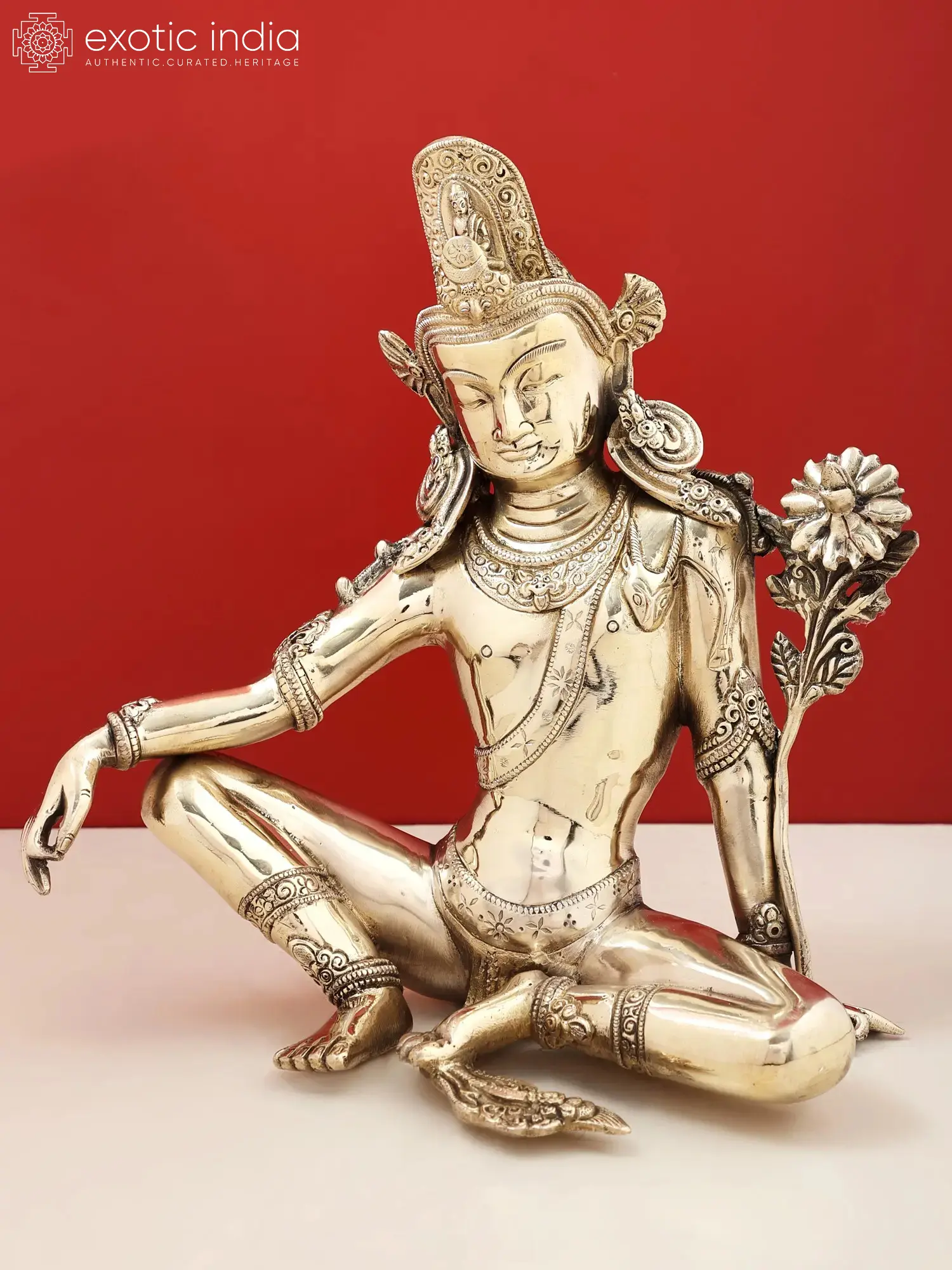 This exquisite brass sculpture captures the regal essence of Lord Indra, the king of the gods in Hindu mythology, and a significant figure in Buddhist traditions as well. Crafted with remarkable detail, the deity is depicted in a serene yet powerful seated posture, exuding an aura of divine authority and tranquil wisdom. The rich patina of the brass lends an antique charm, suggesting centuries of veneration and spiritual significance. The intricate ornamentation adorning the figure, from the elaborate crown to the delicate bangles and anklets, speaks to the opulence and majesty associated with Indra, often described as ruling over Svarga, the heavenly kingdom. ––––––––––