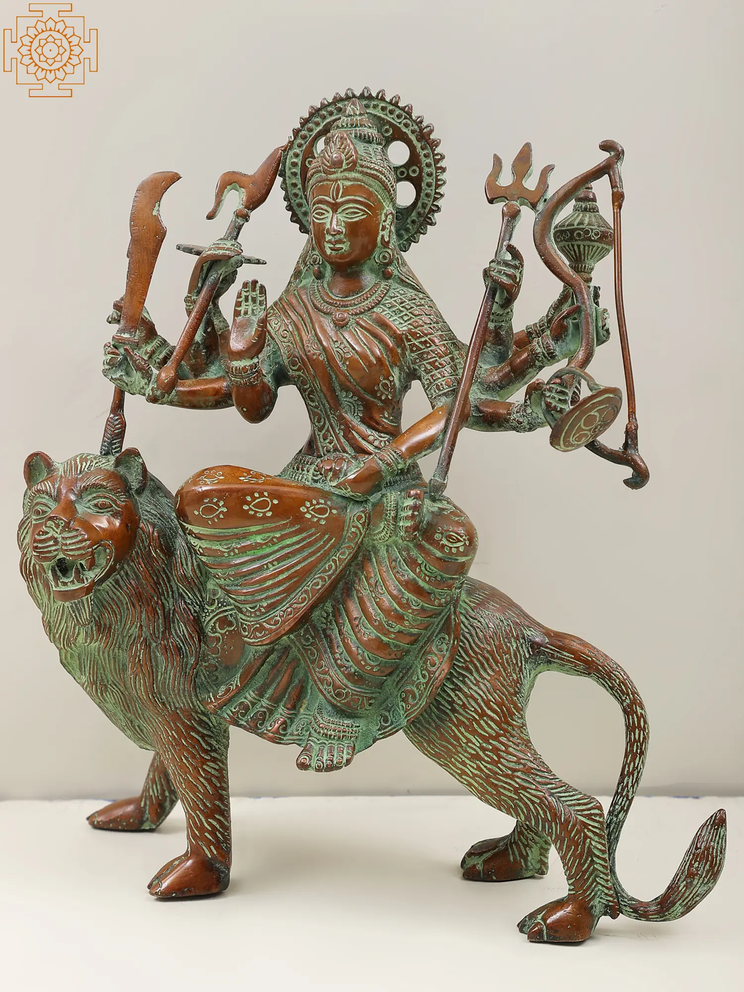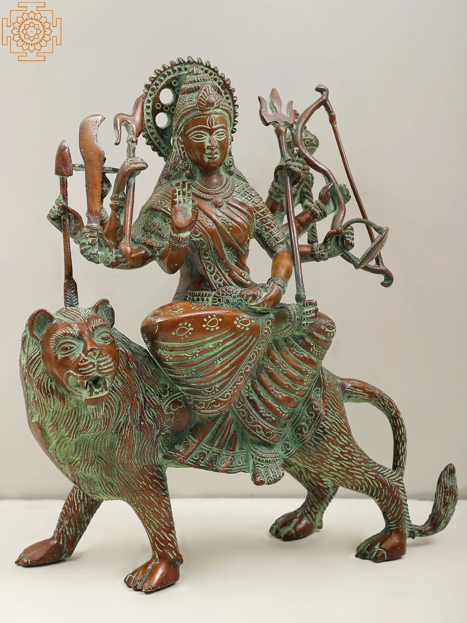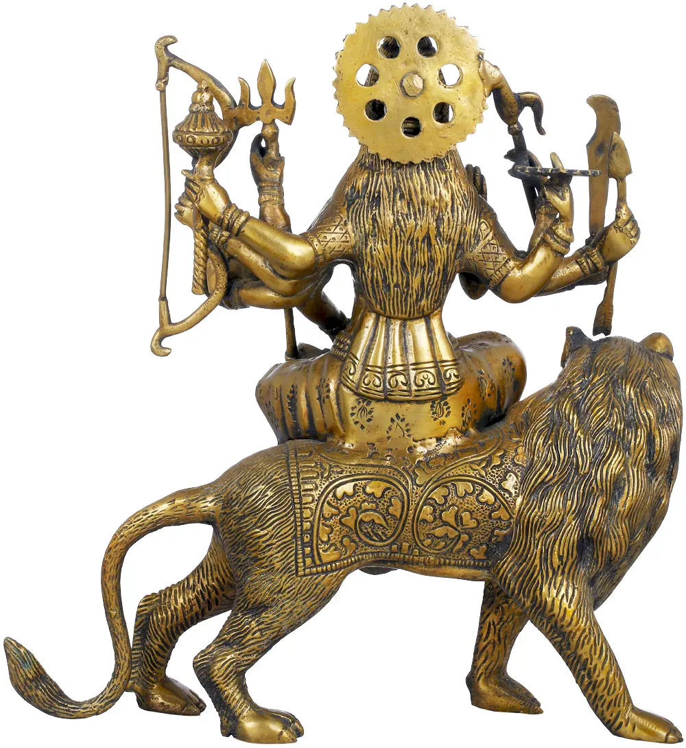Explore the divine grace of Mother Goddess Durga as she sits atop her fearless lion, beautifully depicted in brass. Durga, the warrior goddess, represents the power of the divine feminine, embodying strength, courage, and protection. Durga's presence signifies the victory of good over evil and the limitless potential of the feminine energy. This idol pays homage to the nurturing aspect of the Devi. Place it in your home to invoke the protective and nurturing energy of Mother Goddess Durga.