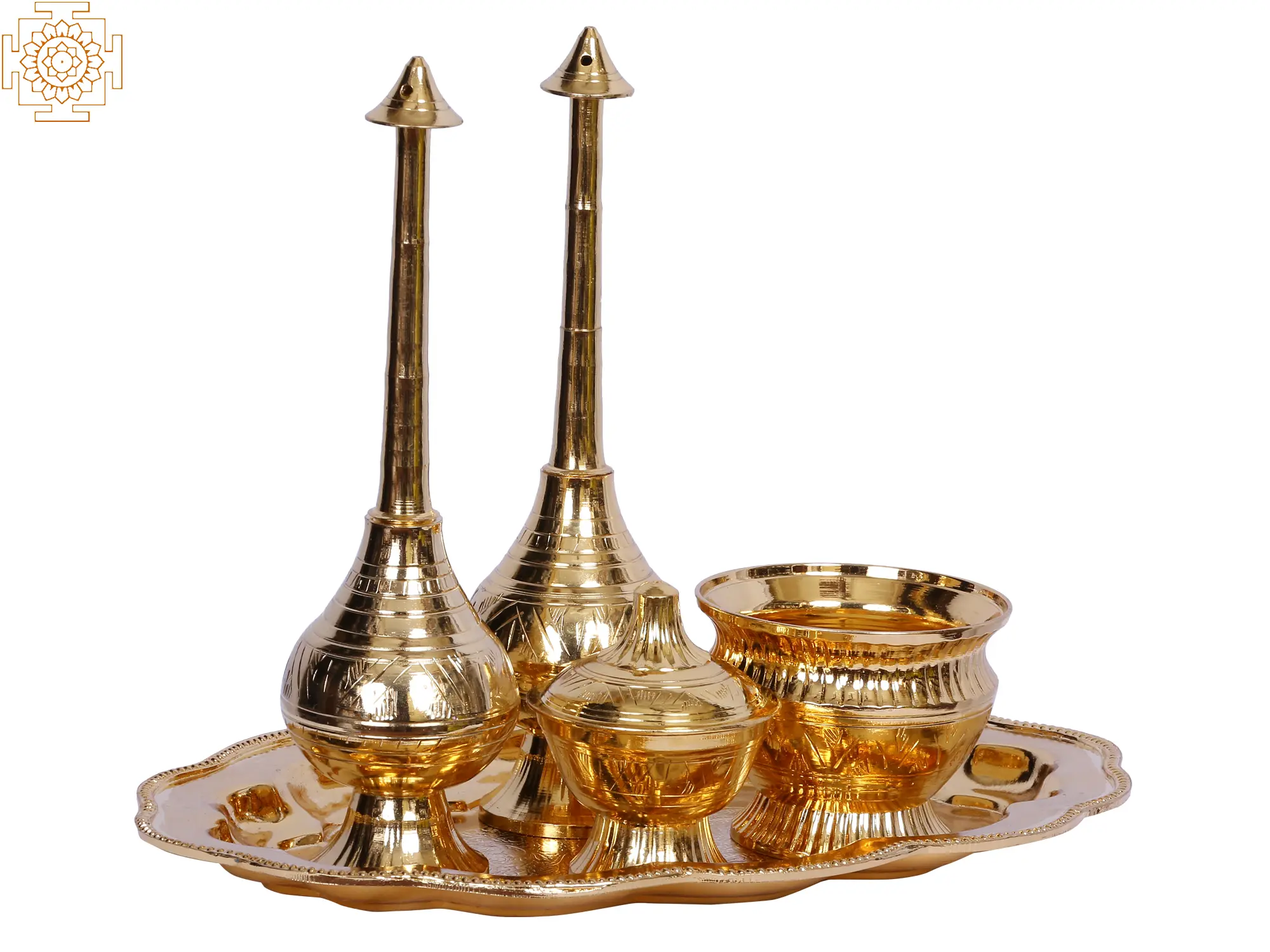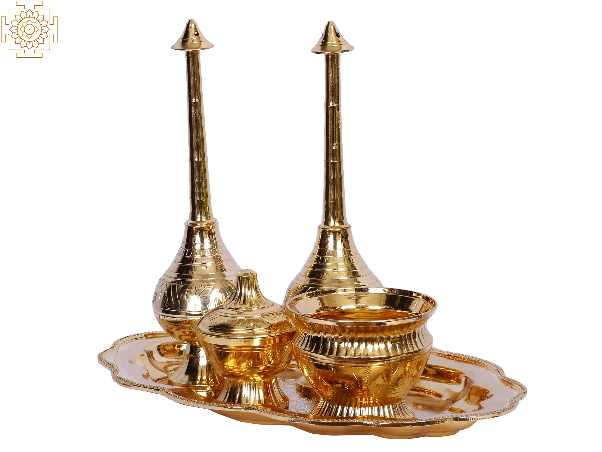 Two Rosewater sprinklers with small apertures on the raised neck linked to a small container at the bottom, also known as Gulab Dani, a Kumkum Patra, and a Ganga Jal Lota are included in this brass Panner set. The practice of sprinkling rosewater on guests dates back centuries and is done to provide a cooling and pleasant effect. To purify their bodies of any bad energy, mango leaves are sprinkled over the Ganga Jal. They are then anointed on the forehead with Kumkum and allowed to enter the hallowed sanctuary where a marriage or other auspicious rite is taking place. This Panner set with a gold-plated finish is used to greet guests during weddings. This collection of ceremonial artifacts retains an ancient practice of establishing a sacred environment.