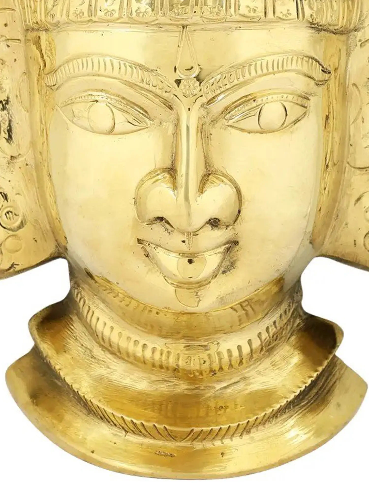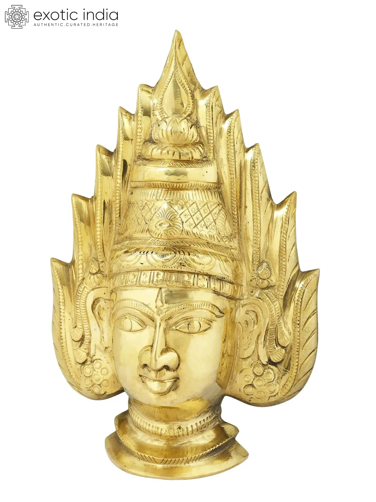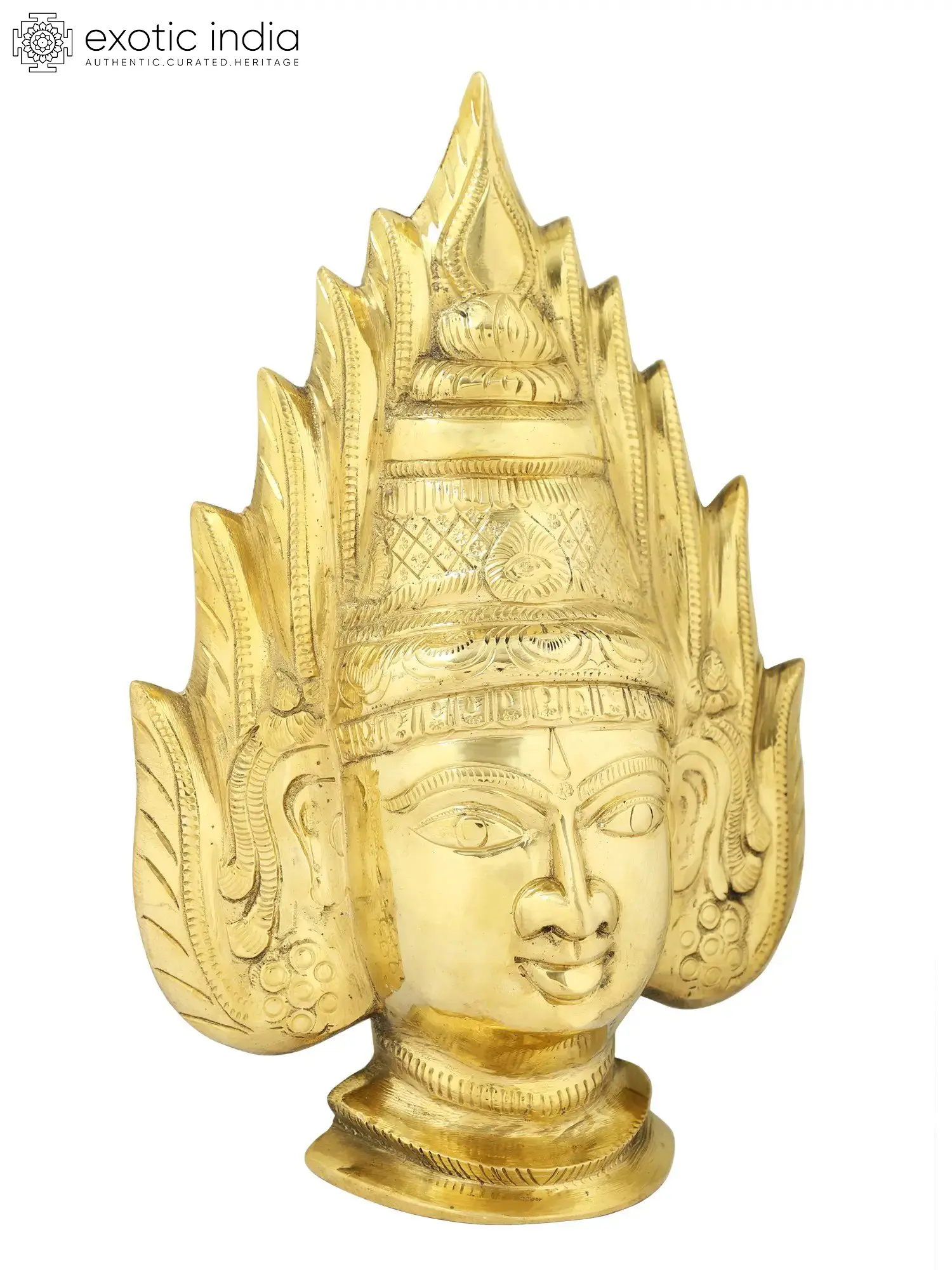 This exquisite brass sculpture captures the majestic face of Sudar Amman, a powerful feminine deity revered in South Indian traditions. The artisan's skillful hands have brought forth a visage that radiates divine grace and formidable strength, making it a captivating centerpiece for any sacred space or discerning collection. The lustrous brass, meticulously polished, gleams with an inner light, symbolizing the eternal radiance of the divine feminine. The intricate detailing on the headdress, adorned with ornate patterns, speaks of the deity's regal status and cosmic significance.