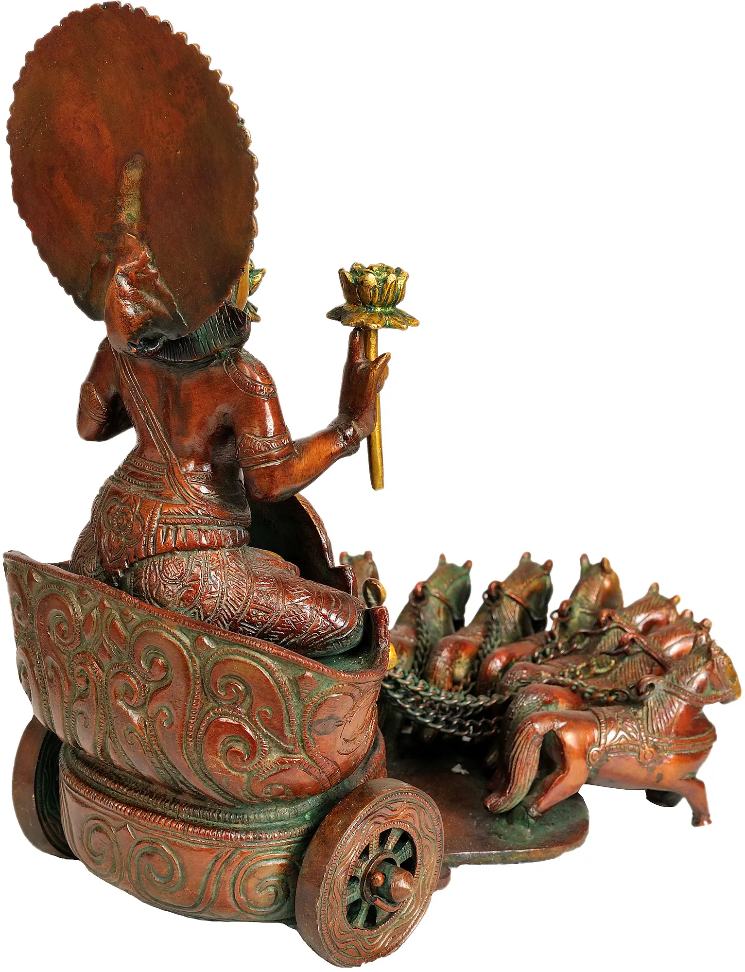 This handcrafted brass statue of Lord Surya riding his chariot with Aruna as his charioteer is an excellent picture of Lord Surya's grace and regality. His chariot is drawn by seven horses, representing the seven directions as well as the seven days of the week. Worshipping Lord Surya is thought to bring good fortune from all directions and throughout the week. In India, it is customary to offer water to Lord Surya first thing in the morning. Bringing this statue home ensures his blessings and allows the devotee to offer water and homage to the deity in sculpture form.