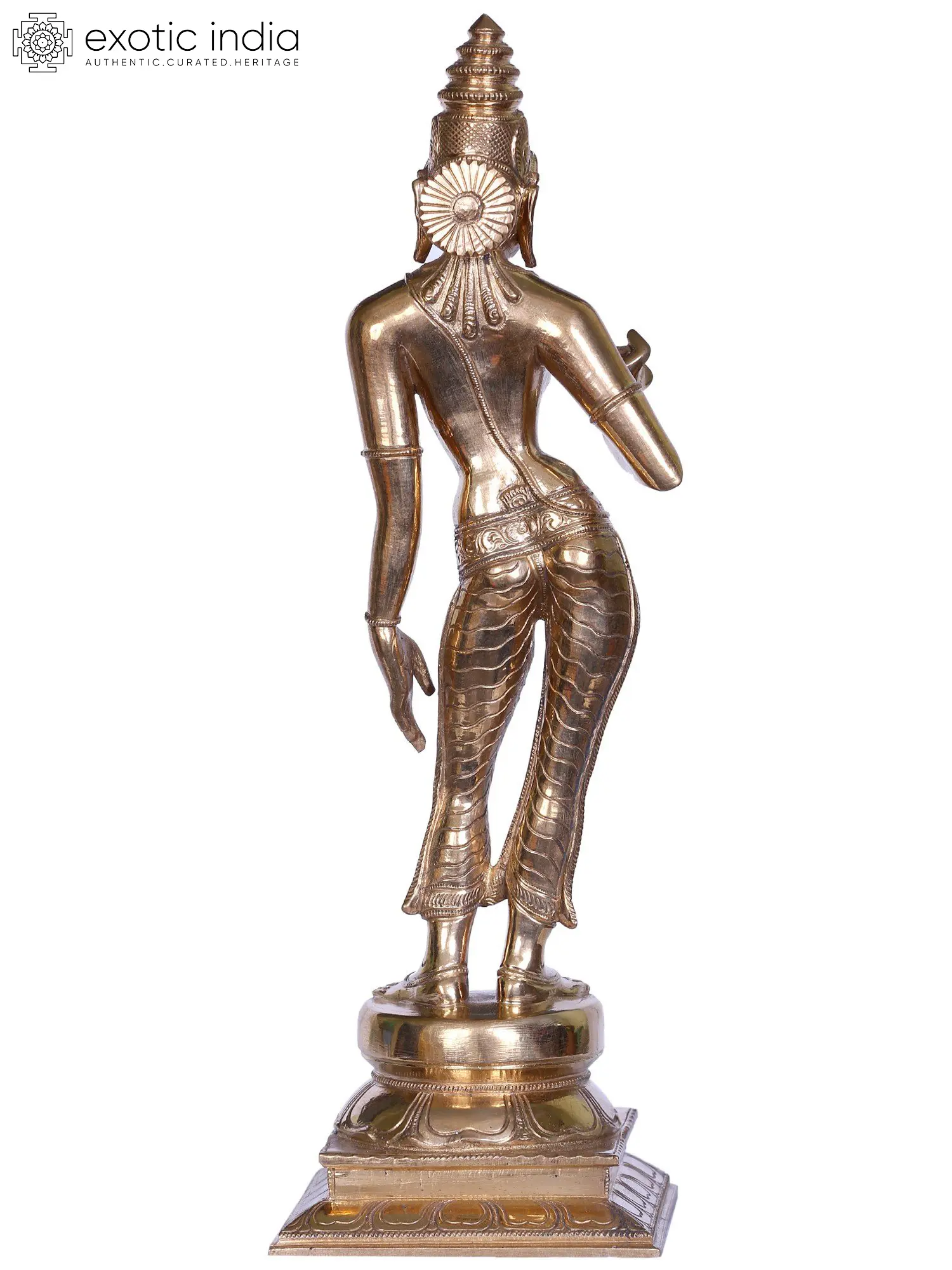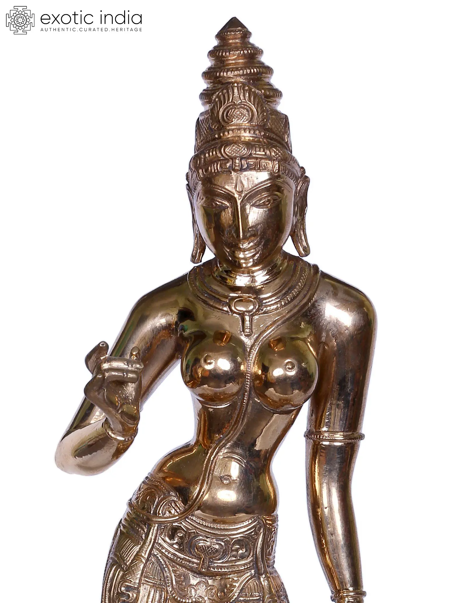 Inviting Shiva’s essence, without Uma’s presence is futile - at times, called Tripura Sundari (the beauty of three cities), Uma finds wide details written of her power, character, and beauty in Matysa Purana. Standing in a Tribhangi over her carefully detailed dais - She is modeled in auras of sensuality, divinity, and royalty. Her long and graceful limbs and striking oval face are just as gorgeous, as the minute details of her precious jewelry. A sacred thread worn by her in diagonal, the tips of her loincloth are slightly flared, right above the ankles. Polished to shine and smooth as the touch of a feather, this Panchaloha idol is, a sculpture insignia.