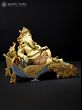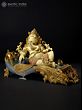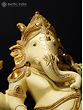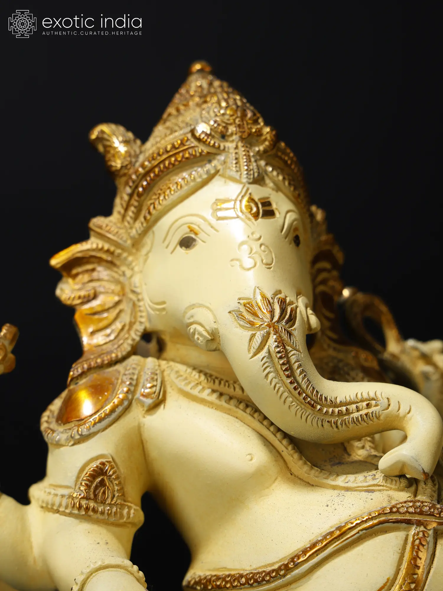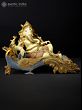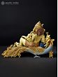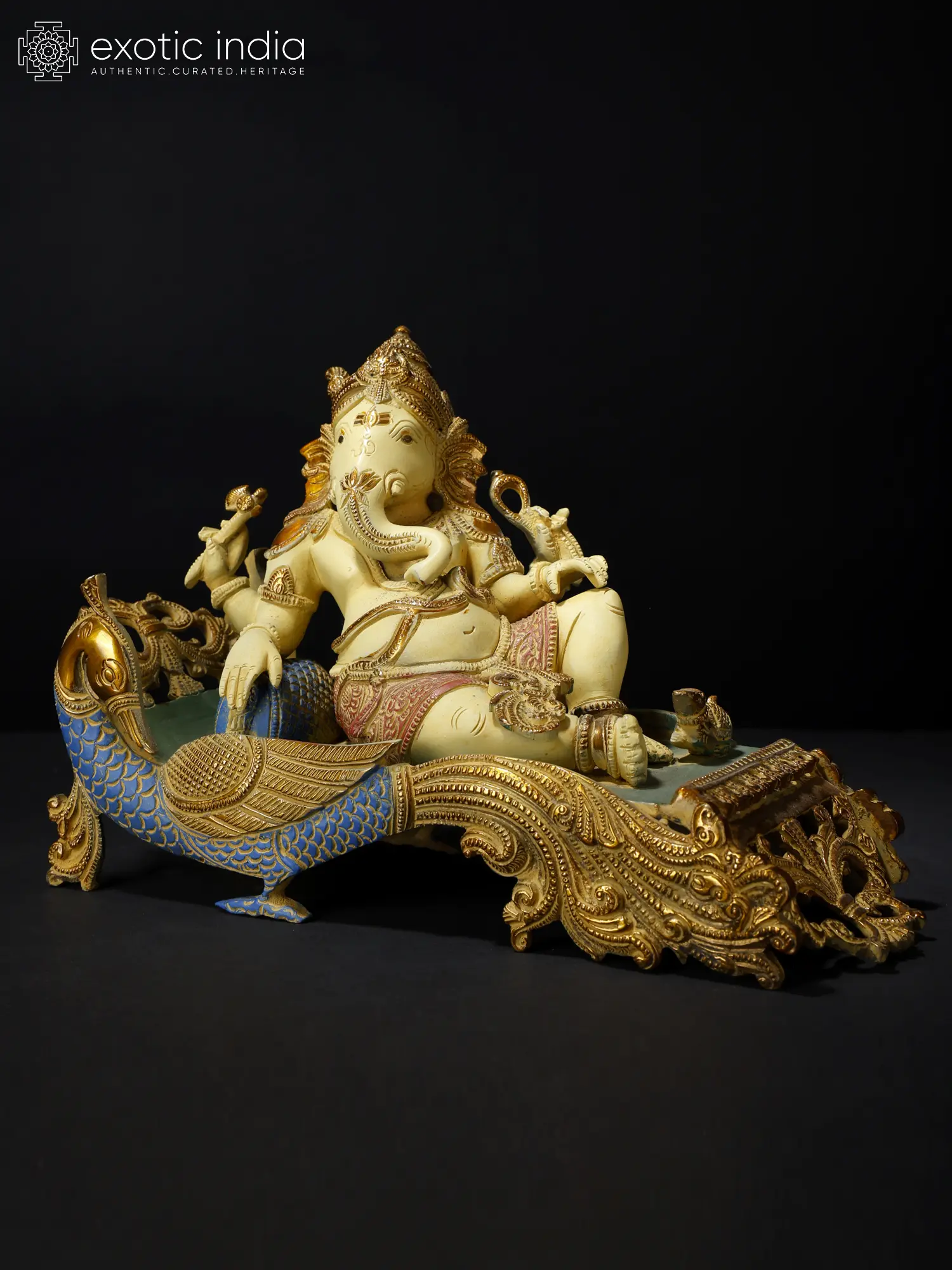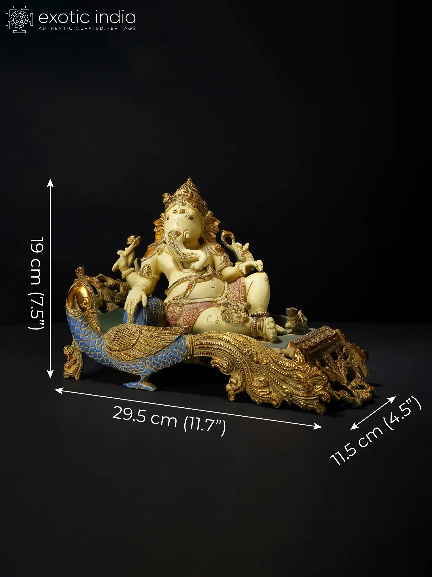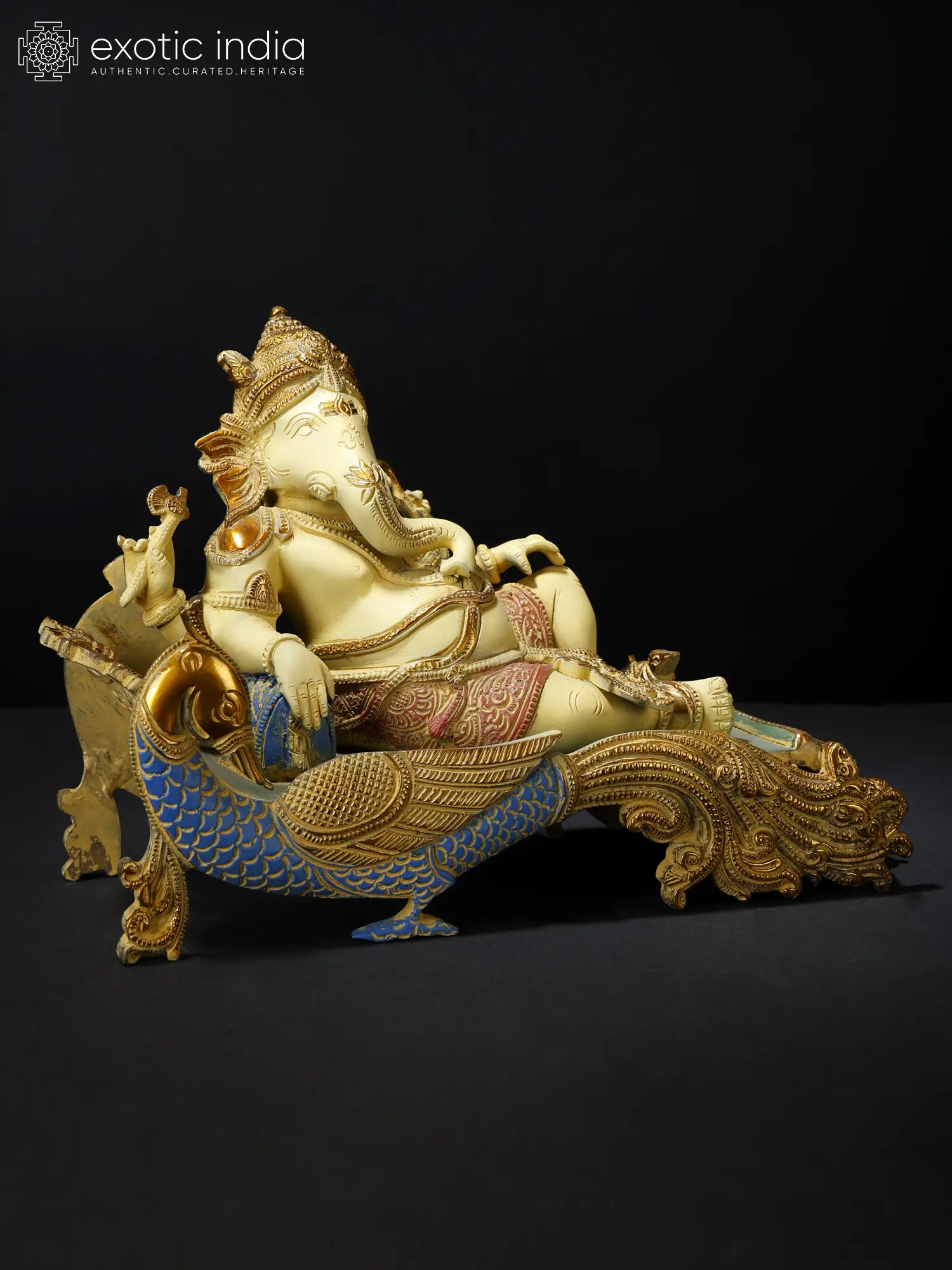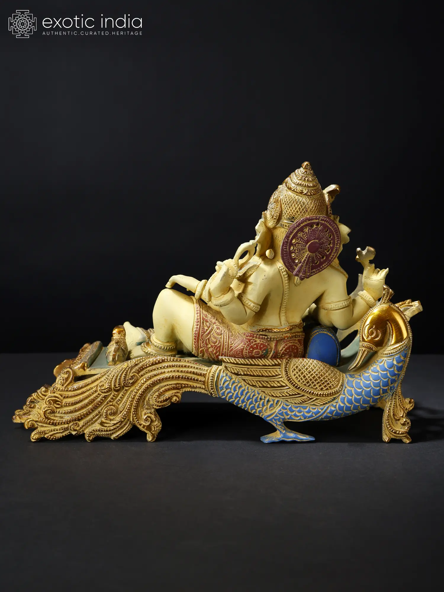 This Colorful Relaxing Lord Ganesha Brass Statue presents a serene depiction of Lord Ganesha reclining on a Peacock throne against a pillow, embodying relaxation and tranquility. Ganesha's complexion, resembling the milky white glow of Sharad Purnima, radiates a sense of purity and serenity. He wears a Karanda Mukuta adorned with a glorious Siras Chakra, symbolizing his divine authority.