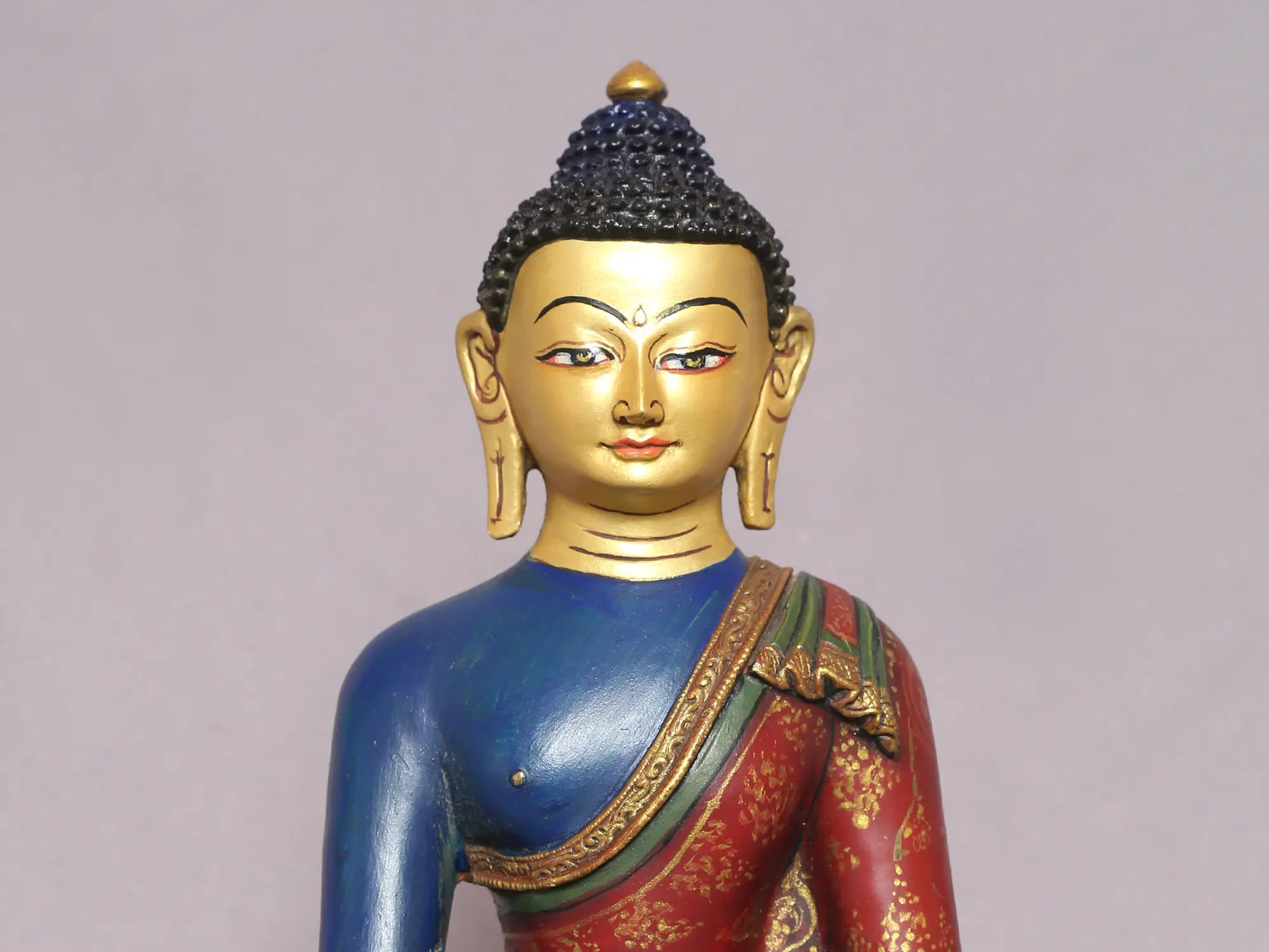This exquisite statue, crafted in the sacred land of Nepal, embodies the serene presence of Shakyamuni Buddha, the historical founder of Buddhism. The rich, vibrant colors and intricate details speak to the deep artistic heritage of Nepalese artisans who pour their devotion into every creation. Made from copper and gilded with gold, this piece possesses a luminous quality, radiating a sense of peace and spiritual tranquility that is truly captivating. The benevolent expression on the Buddha's face, with its half-closed eyes and gentle smile, invites contemplation and inner reflection, mirroring the Buddha's own journey towards enlightenment. ––––––––––