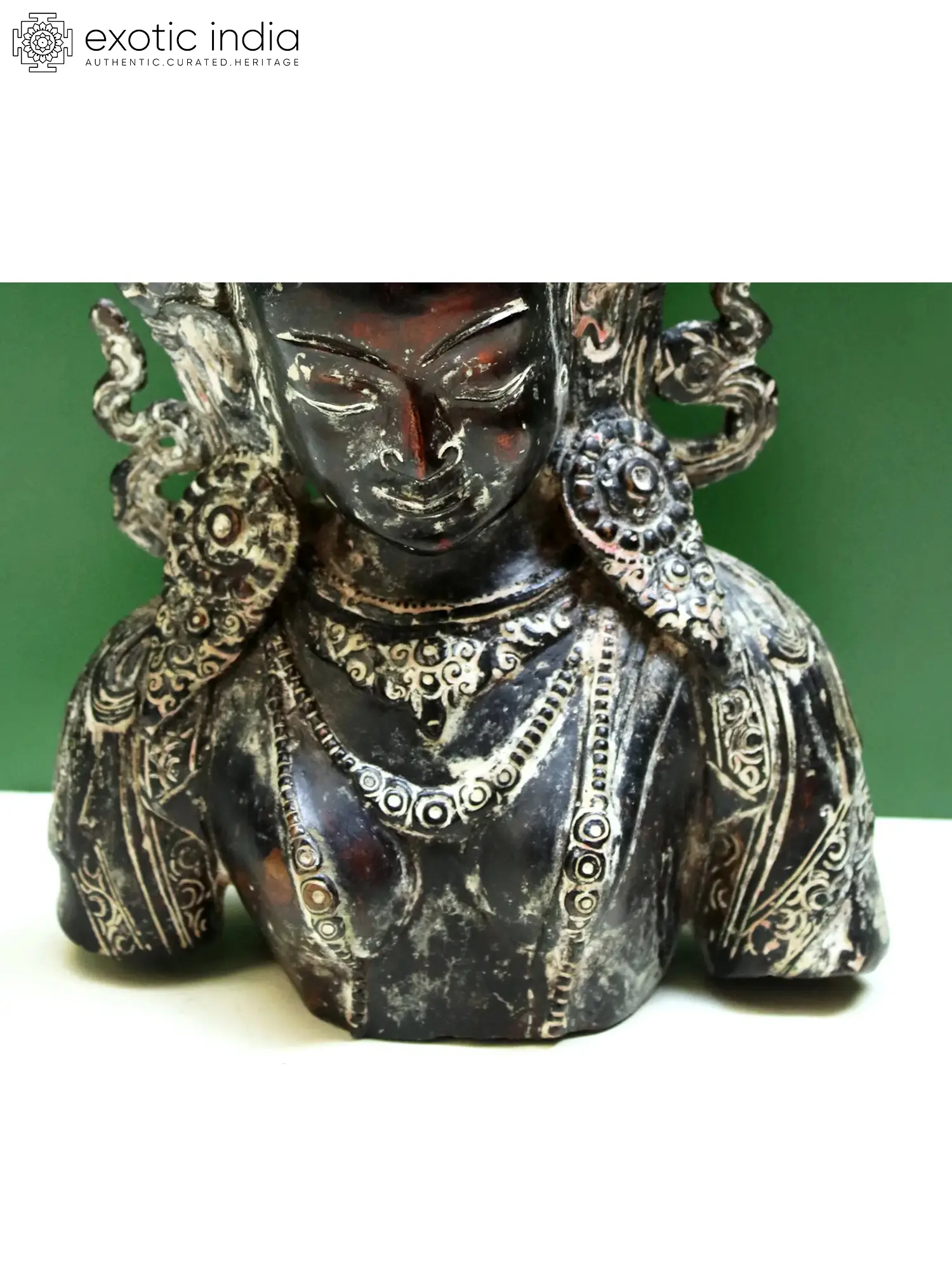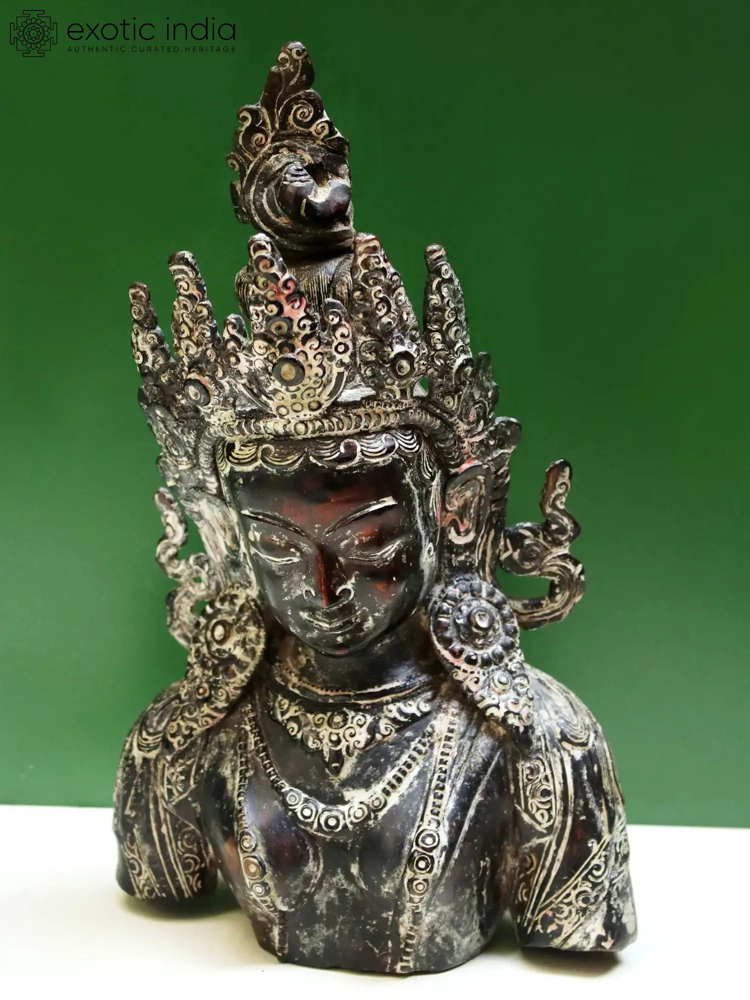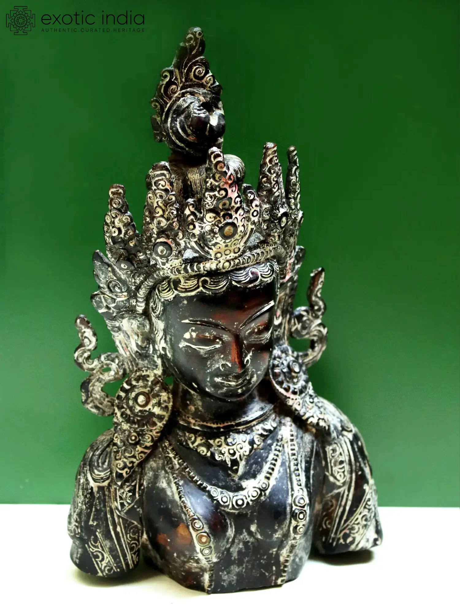 The traditional crown frames the charming countenance of Buddha beautifully along with his wavy tresses, ornate earrings, and intricate necklaces. Luxuriously sculpted, the statue is an evocation for the devotee, reminding one of the powers of Enlightenment that let the mind rise above worldliness and fulfill the supreme goal of human existence.