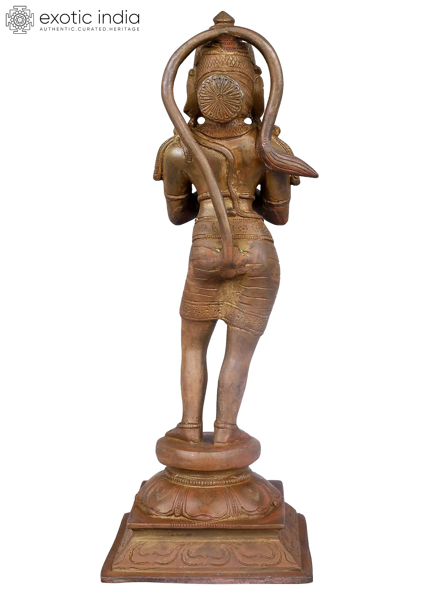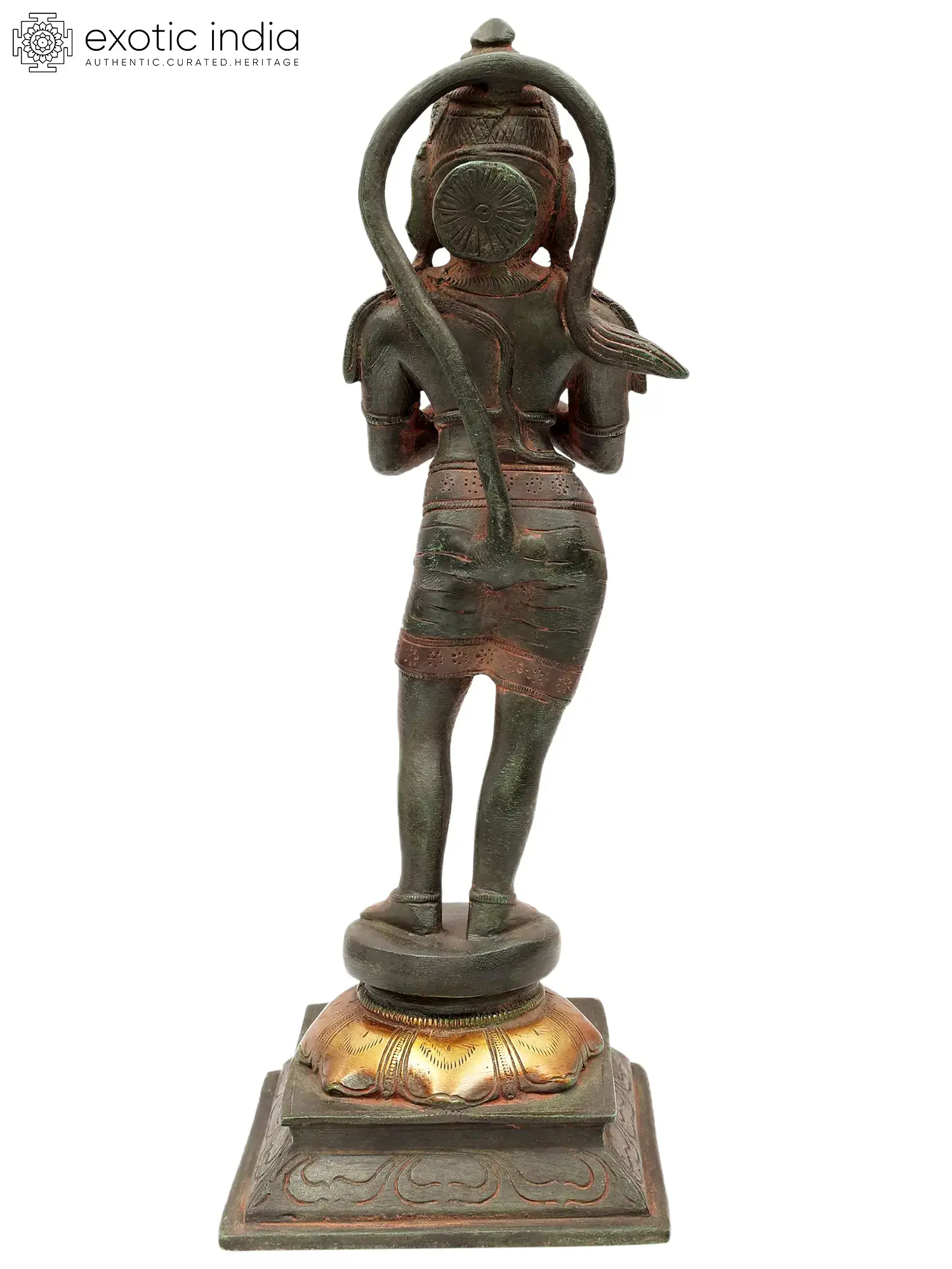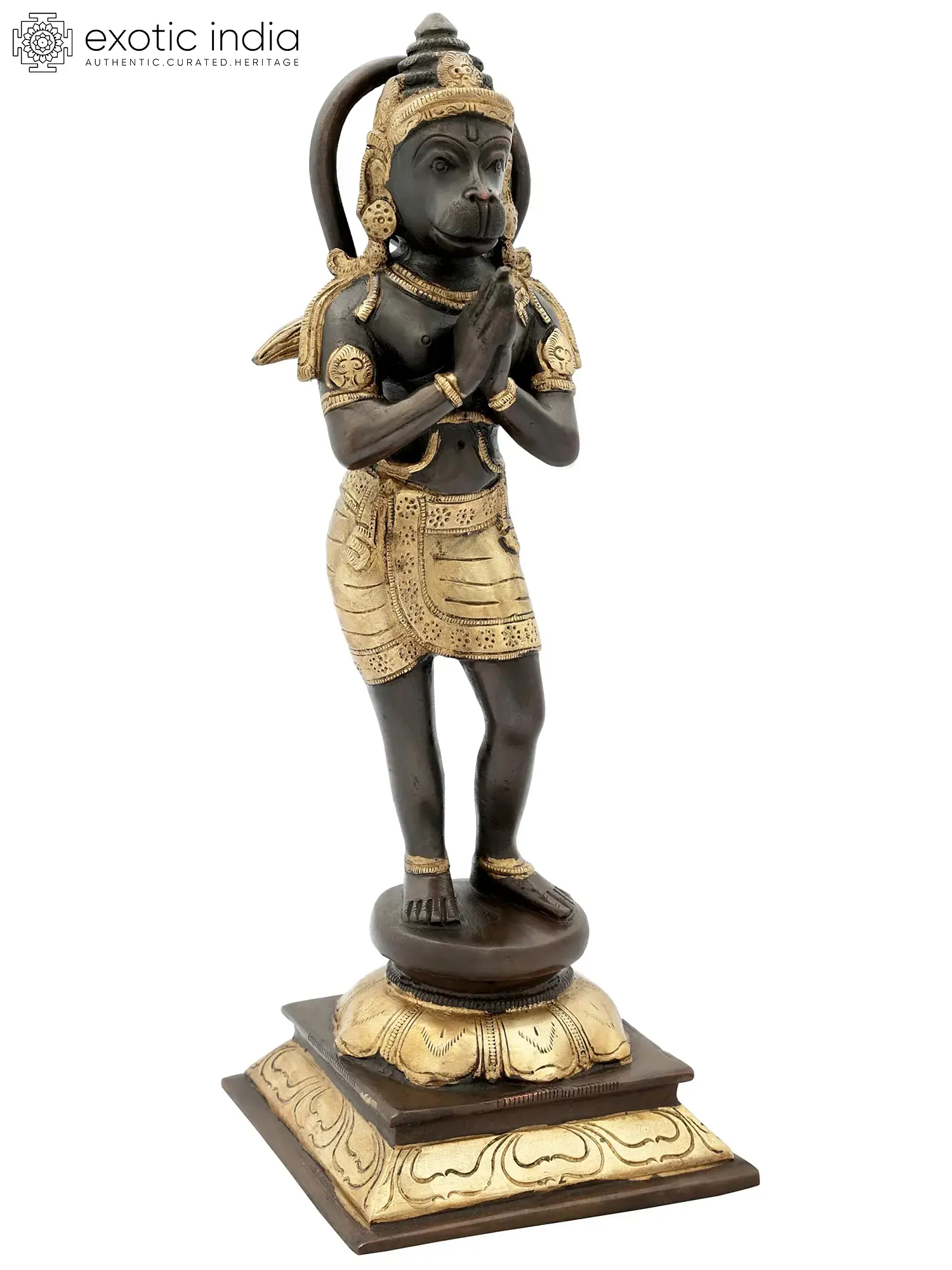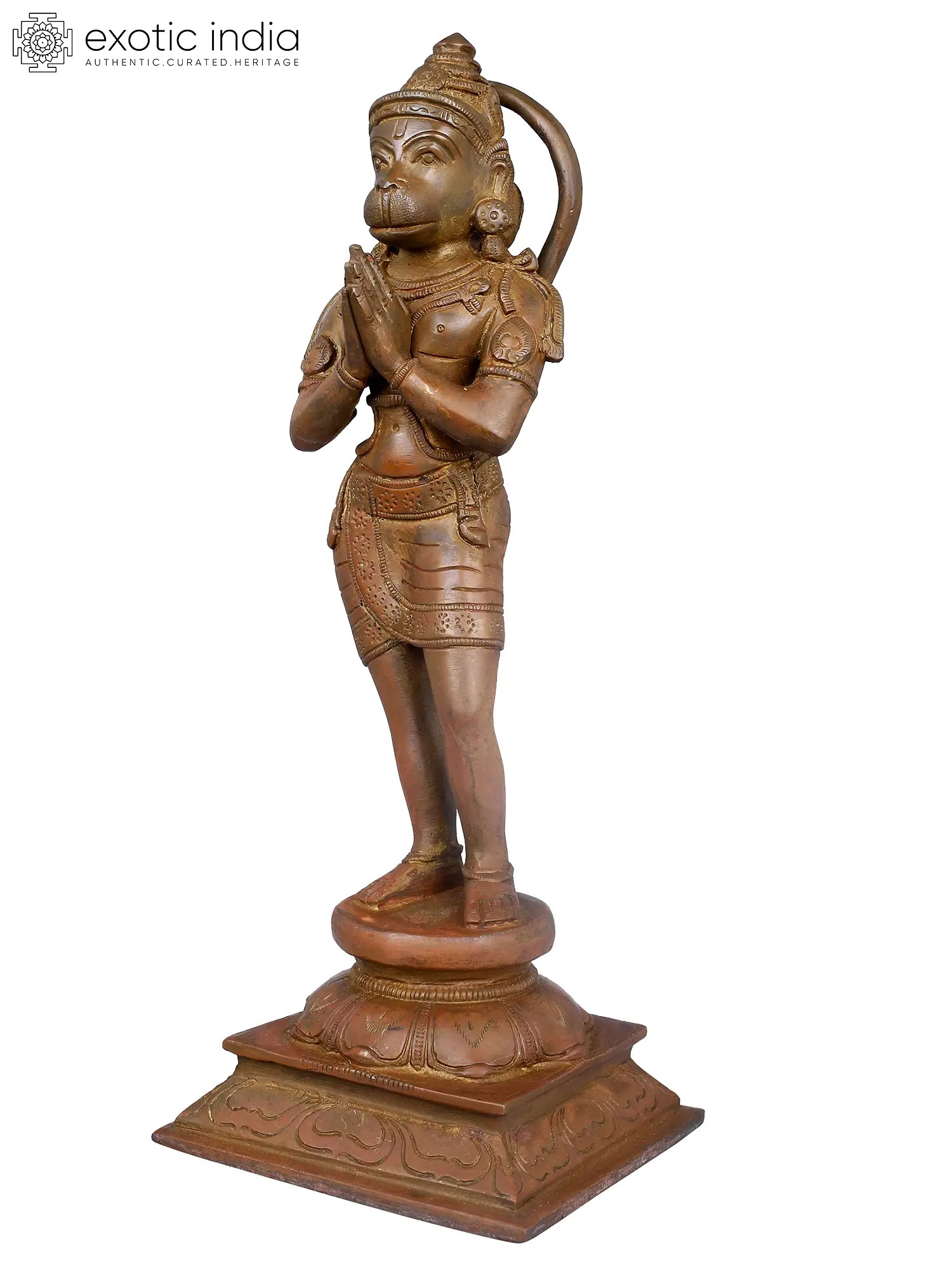 This sculpture captures the devout stance of Hanuman in Anjali mudra, a gesture of respect and devotion. Anjani-Suta Hanuman, the epitome of strength, courage, and unwavering devotion, is beautifully depicted in this brass embodiment of the divine. The sculpture reflects the skill and devotion of Indian artisans. Display it in your home to inspire reverence and devotion, as you pay homage to Lord Hanuman's boundless faith and dedication.
