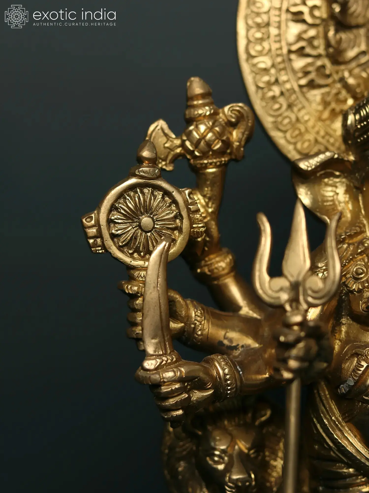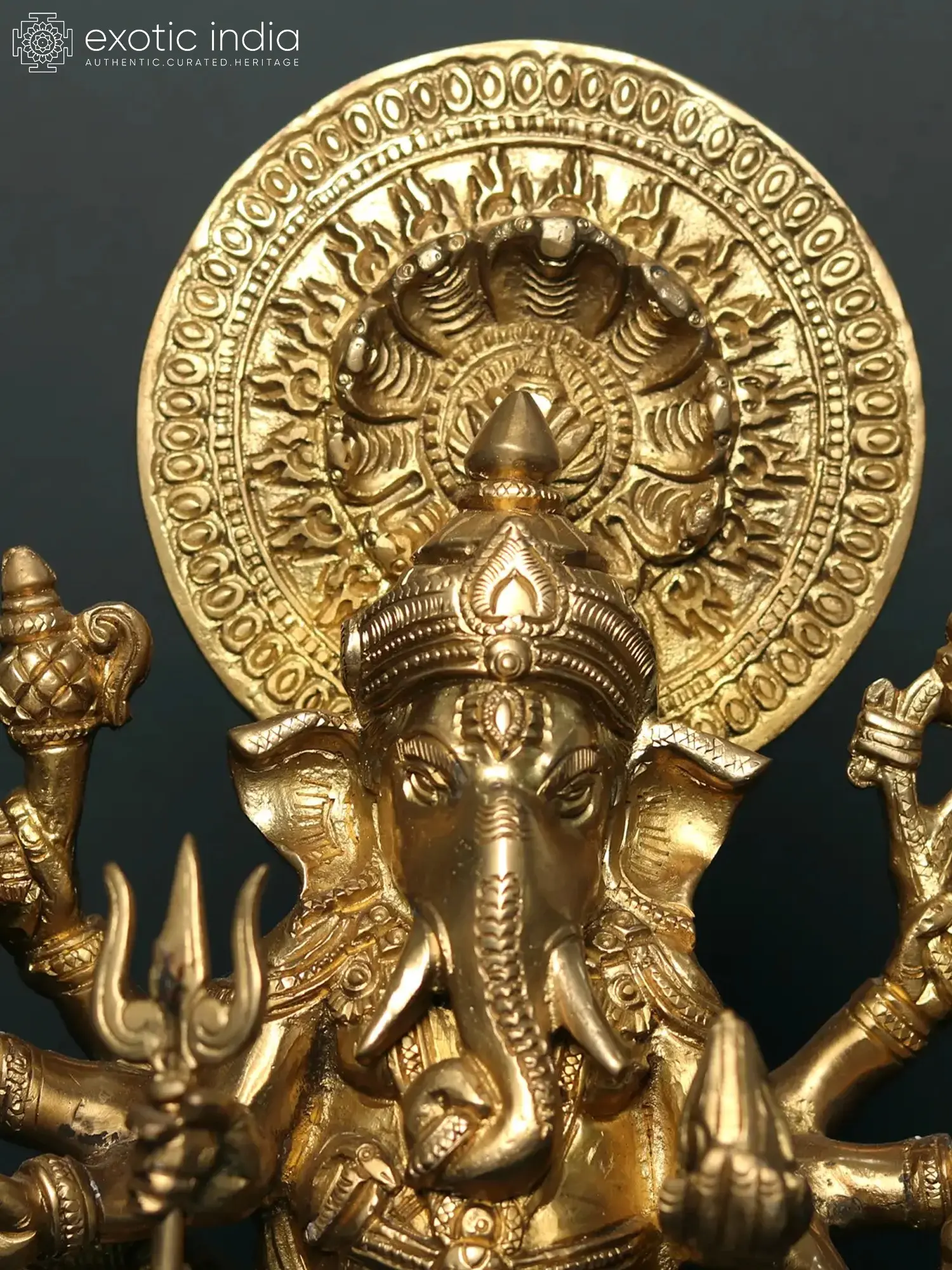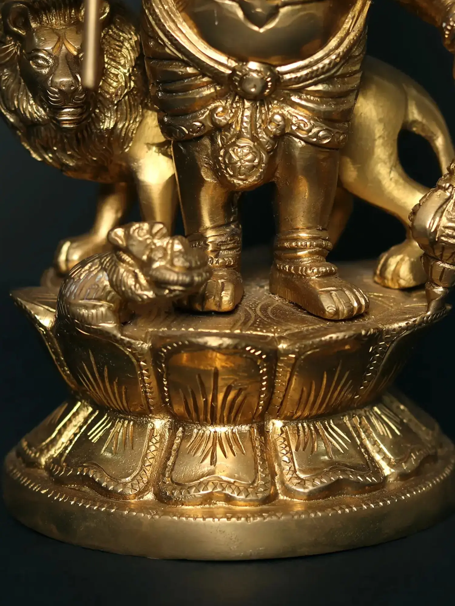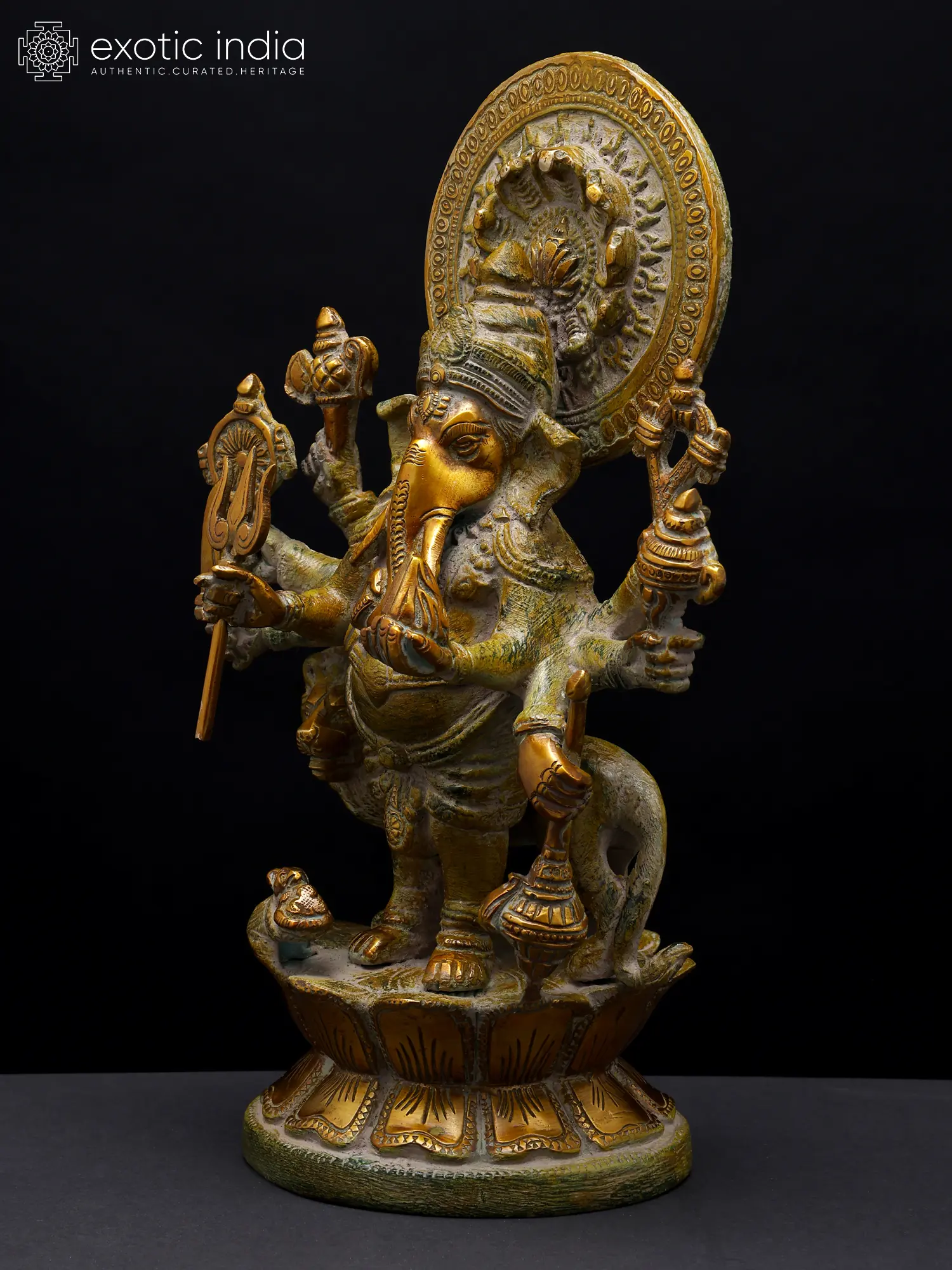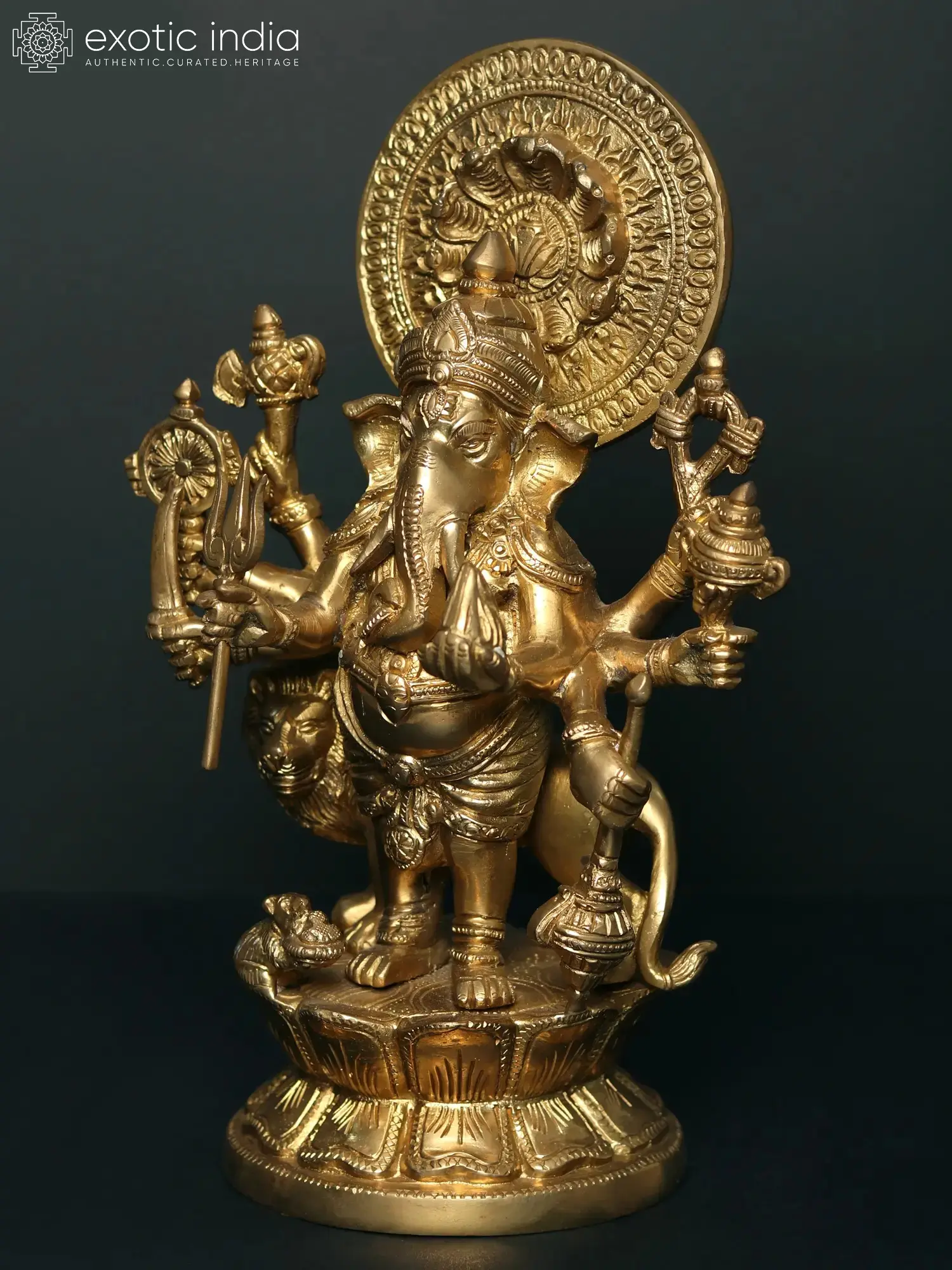 Simha Ganapati, the 29th of Ganapati's 32 forms, is the form in which Lord Ganesha mounts a Lion or Simha. Simha Ganapati is shown in this brass statue as the Ashtabhuja Dhari, or the deity with eight hands, holding Parashavadha (the war axe), Trishul (trident), Khadga (the sword), Shankh (Conch), Pasha (noose), Chakra (discus), Modaka Patra (sweets), and Gada (mace). The serpent coiling around his belly represents his control over the cosmos. His Vahana, the Mushak or mouse, waits by his feet with the lion and looks up to him for a kindly glance.