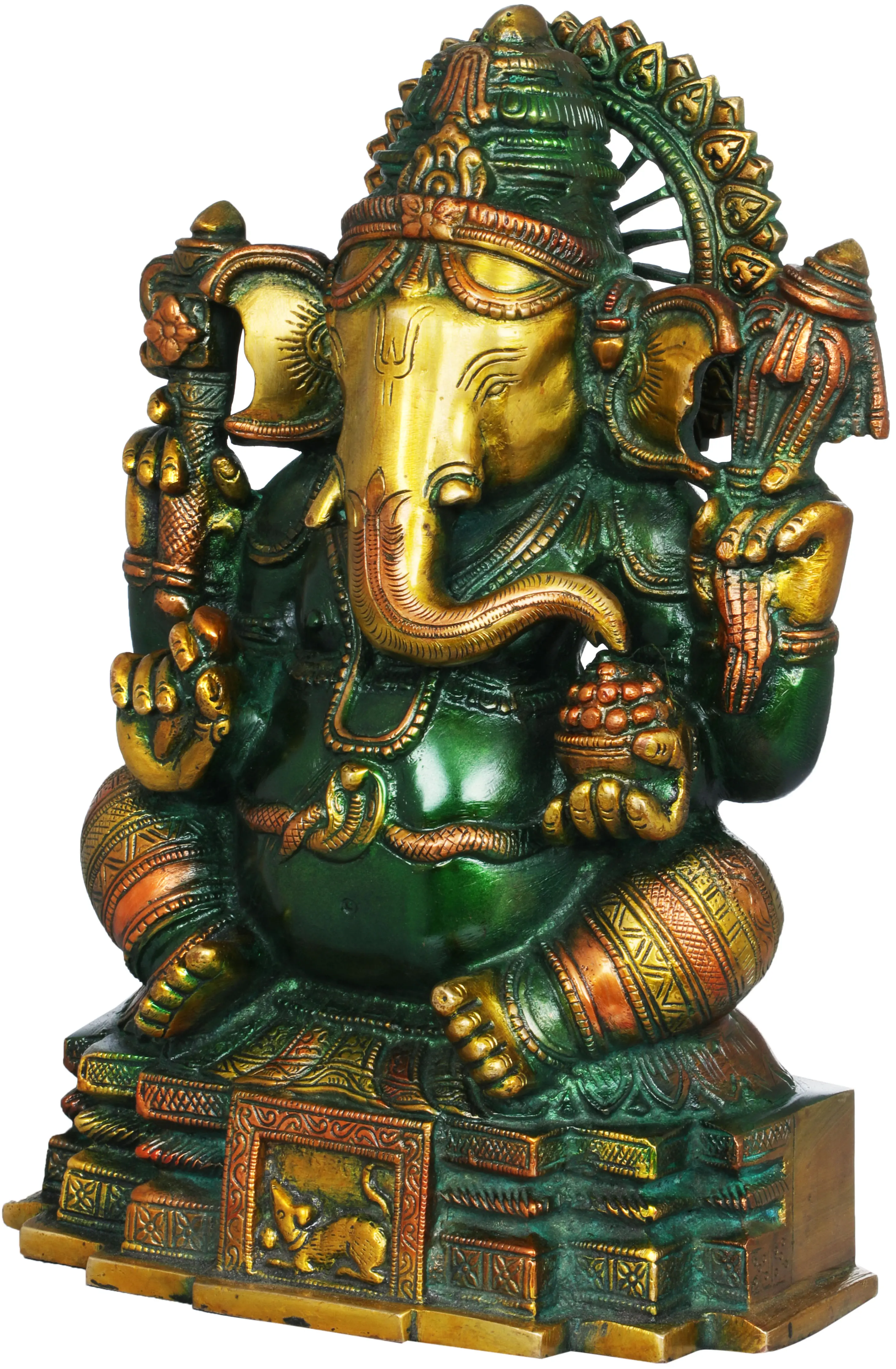 This magnificent Ganesha idol is more than just a statue; it is a testament to the enduring tradition of Indian craftsmanship. Each curve, every intricate detail, from the celestial ornaments adorning his form to the delicate carvings on the base, is brought to life through the hands of master sculptors. The brass material itself is revered in Hindu culture, known for its purity and auspiciousness. The verdigris patina, a natural result of brass aging, adds a layer of depth and antique charm, hinting at ancient origins and timeless devotion. The Vahana, Ganesha's mouse (Mushika), is often depicted at his feet. Mushika symbolizes worldly desires, which Ganesha, as the lord of wisdom, has mastered and controlled. The mouse also represents the ability to reach even the smallest and most hidden places, reflecting Ganesha's pervasiveness and his attentiveness to even the most humble of requests. The offerings held in his hands, often modaks (sweet dumplings), represent the fruits of spiritual practice and the rewards of devotion. This idol captures these symbolic elements with remarkable artistry, inviting contemplation and connection.
