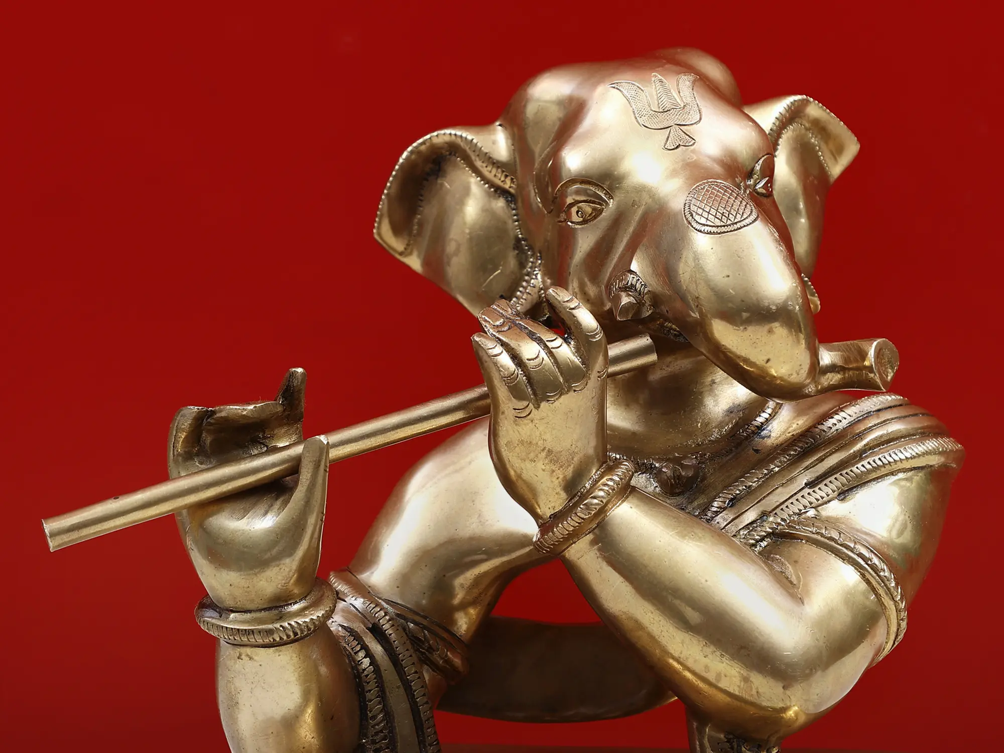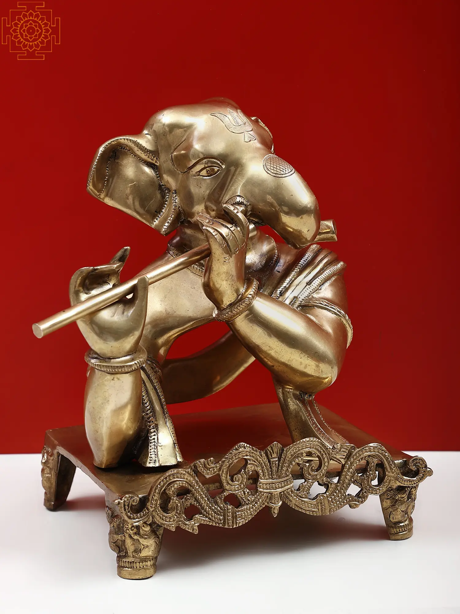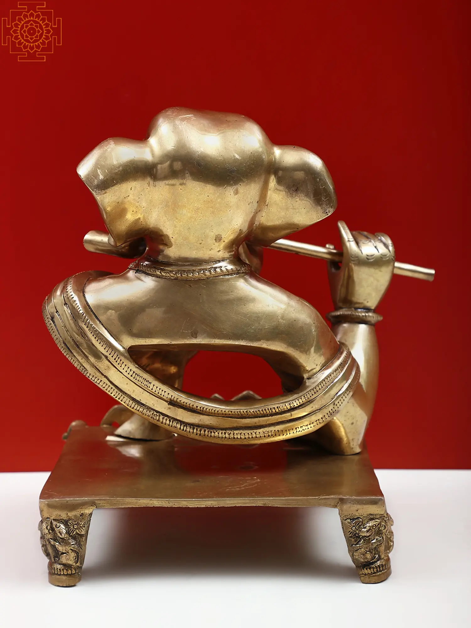 The innocent and untroubled persona of Ganesha plays the flute softly to spread calmness and serenity in the world; depicted with face and hand that rests on a square low heighted chowki with carved legs and an ethnic wavy pattern in the front.