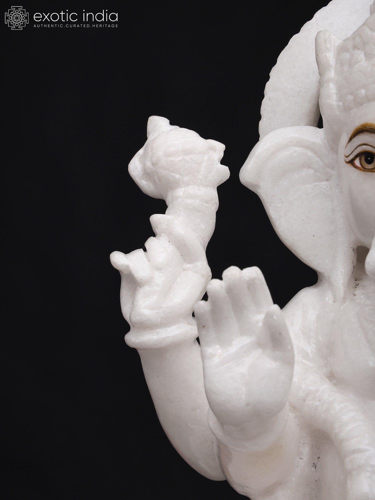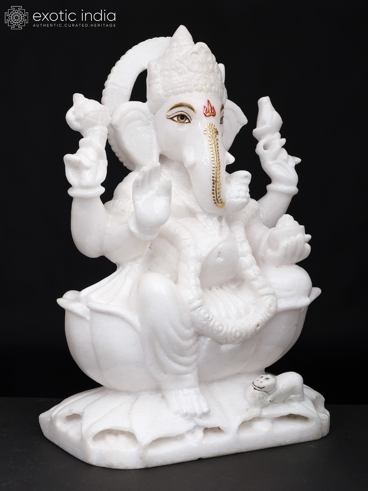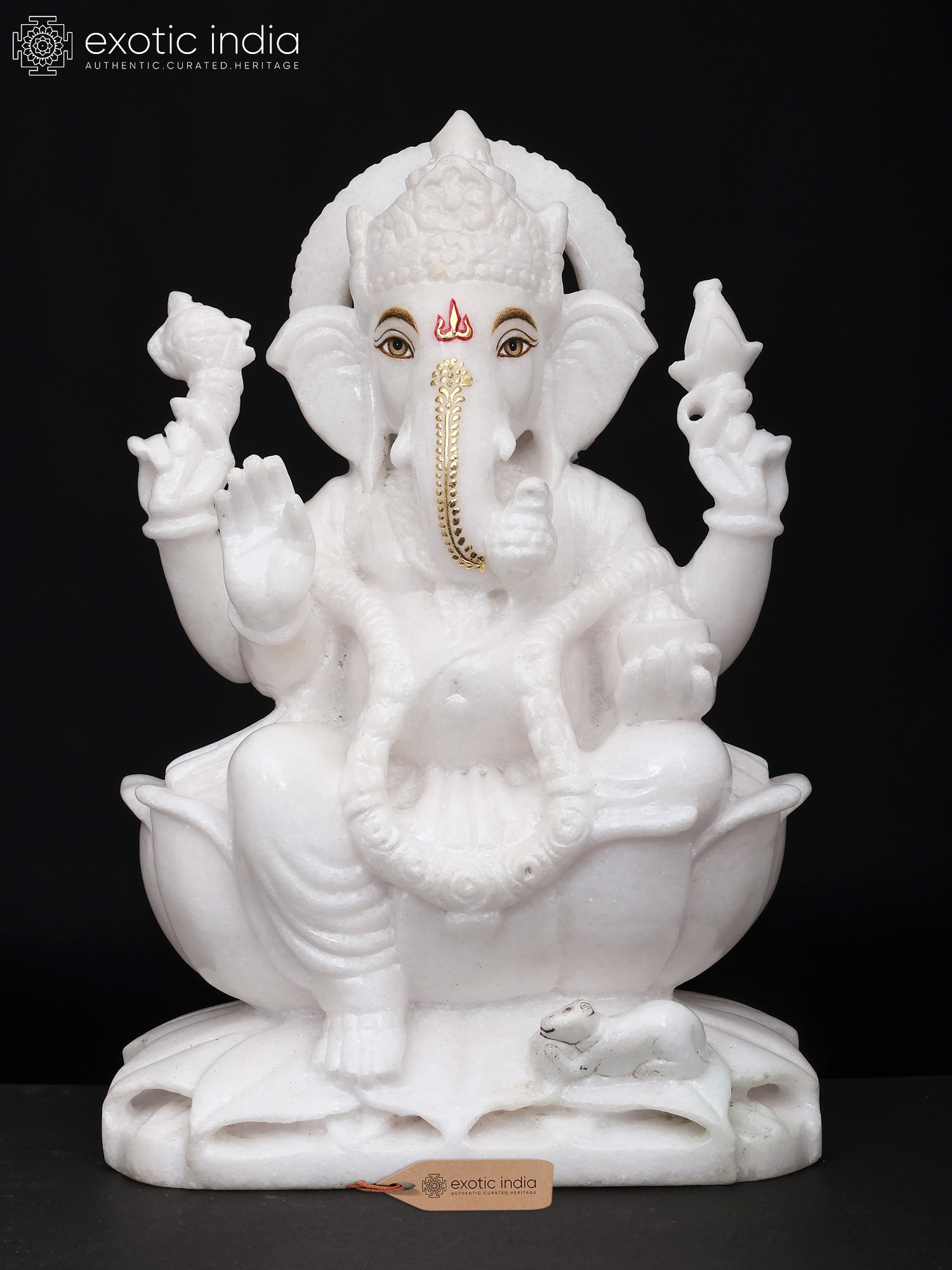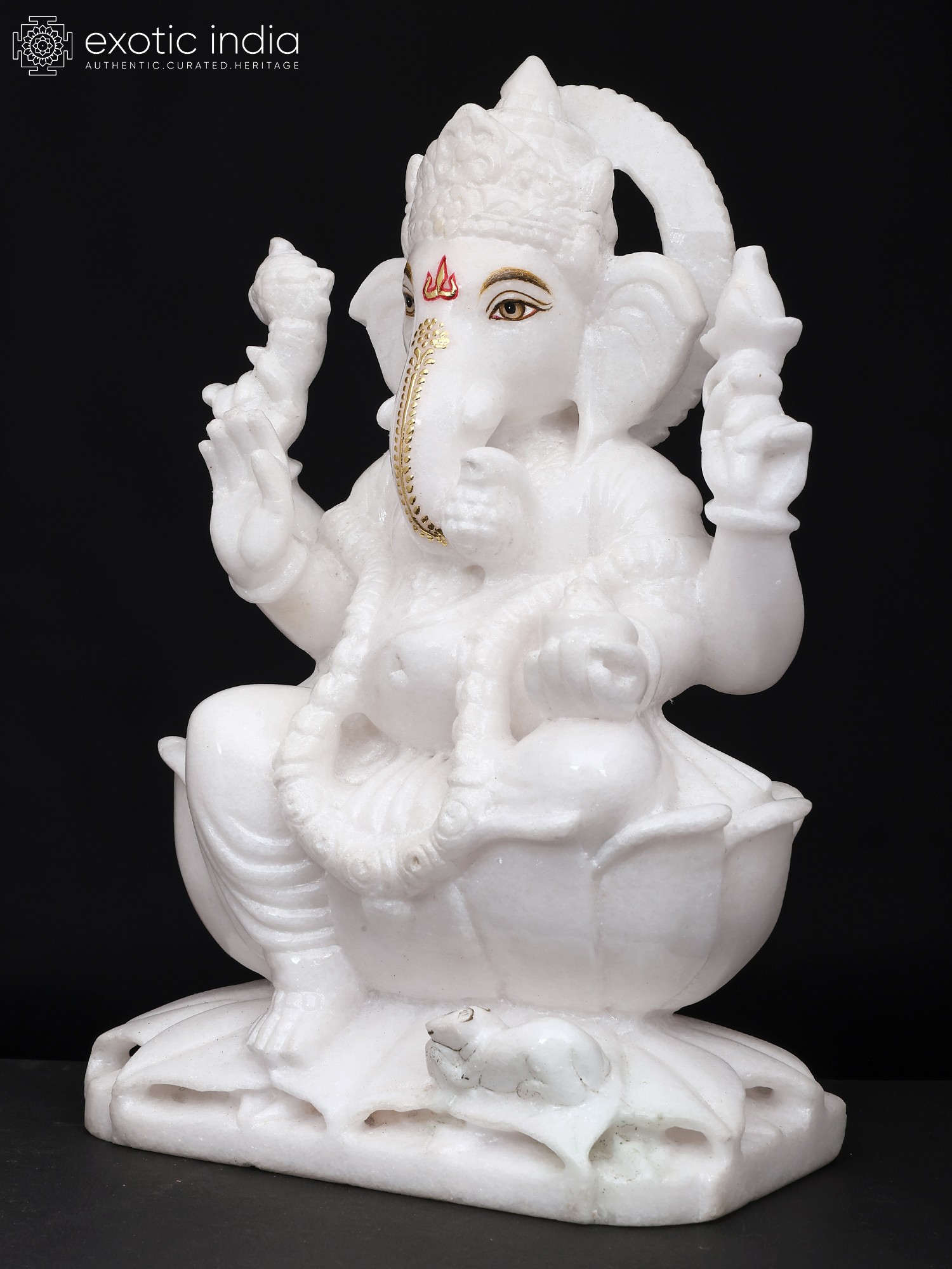 18" Lord Ganesha Seated on Lotus | Handmade | White Marble Ganesh Statue | Ganpati Statue | Vinayak | Ganpati